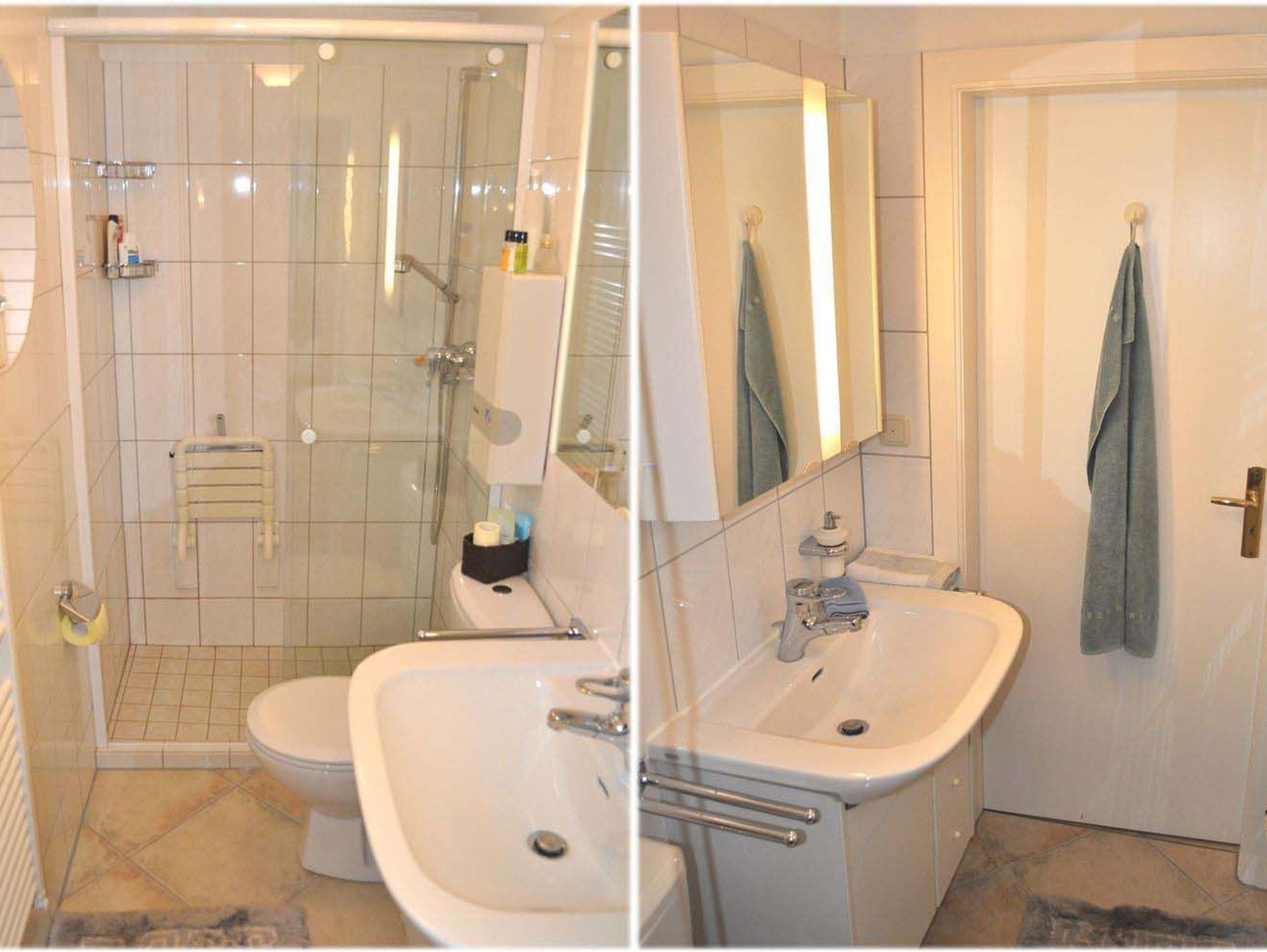 Bad 1: Dusche, Duschkabine, Duschklappsitz, Spiegelschrank, Waschbecken, WC