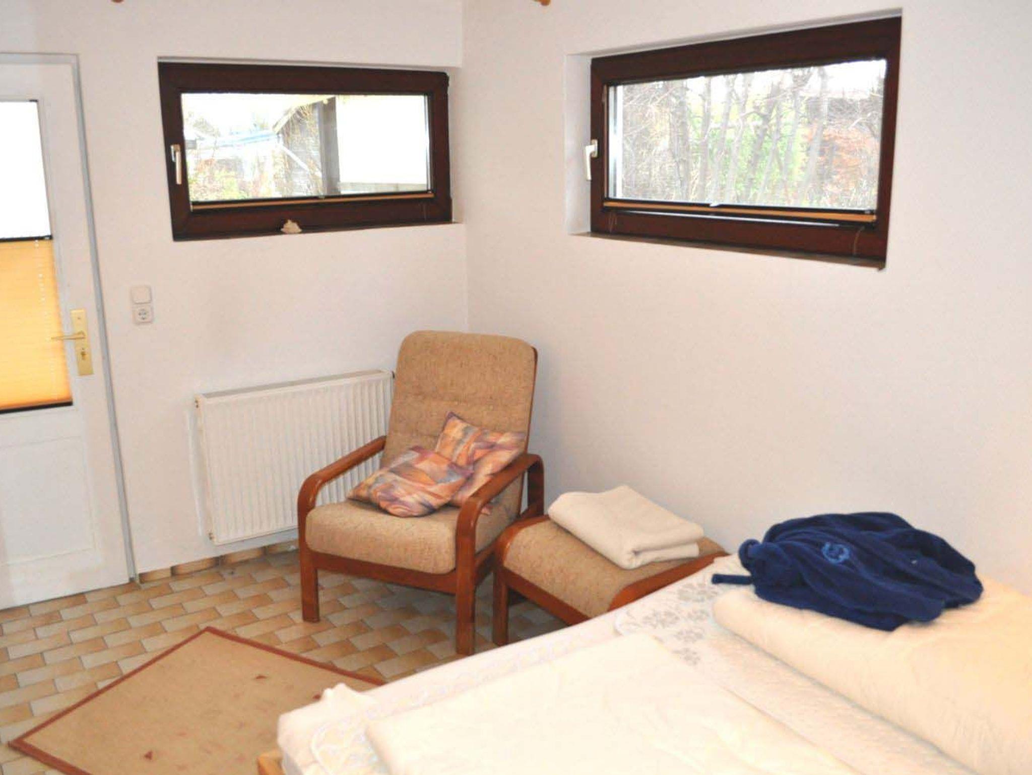 Schlafzimmer 2: Bügelbrett, Bügeleisen, Doppelbett 2,00 x 1,60 m, Hocker, Kleiderschrankregal, Salontür zum Gäste-WC, Schlafzimmer ist nur von aussen zugänglich, Sessel, Stehlampe