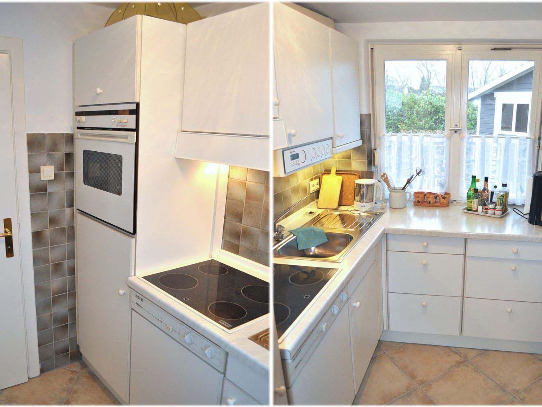 Küche: 4 Plattenherd mit Ceranfeld und Backofen, Dunstabzugshaube, Einbauküche, Geschirr, Handmixer, Kaffeemaschine, Kochtöpfe, Kühlschrank mit 3* Gefrierfach, Nespresso Maschine, Spülmaschine, Toaster, Wasserkocher