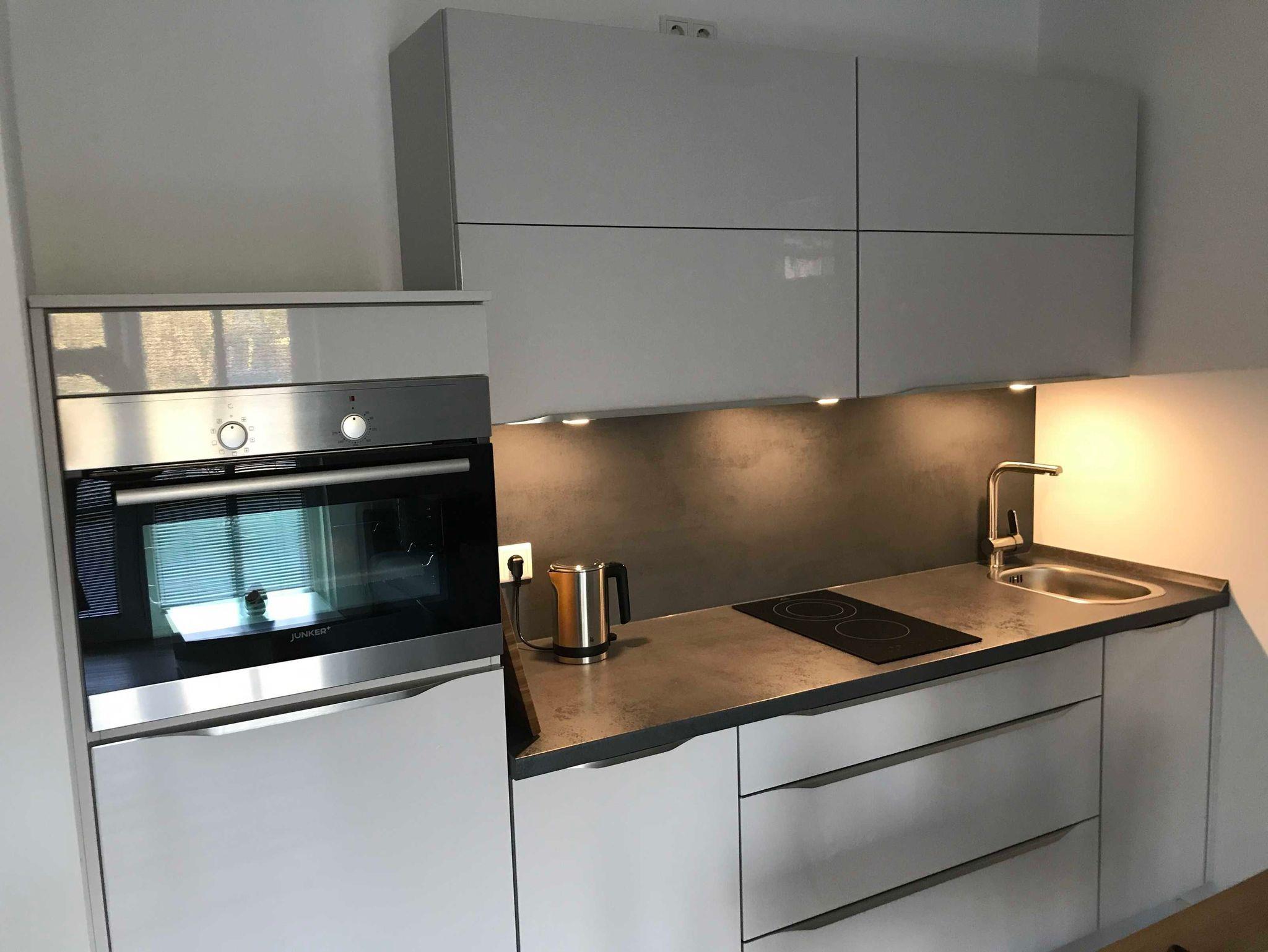Geschirrspüler, Kühl-und Gefrierschrank, Cerankochfeld und Backofen, Kaffeemaschine, Wasserkocher und Toaster sind vorhanden.