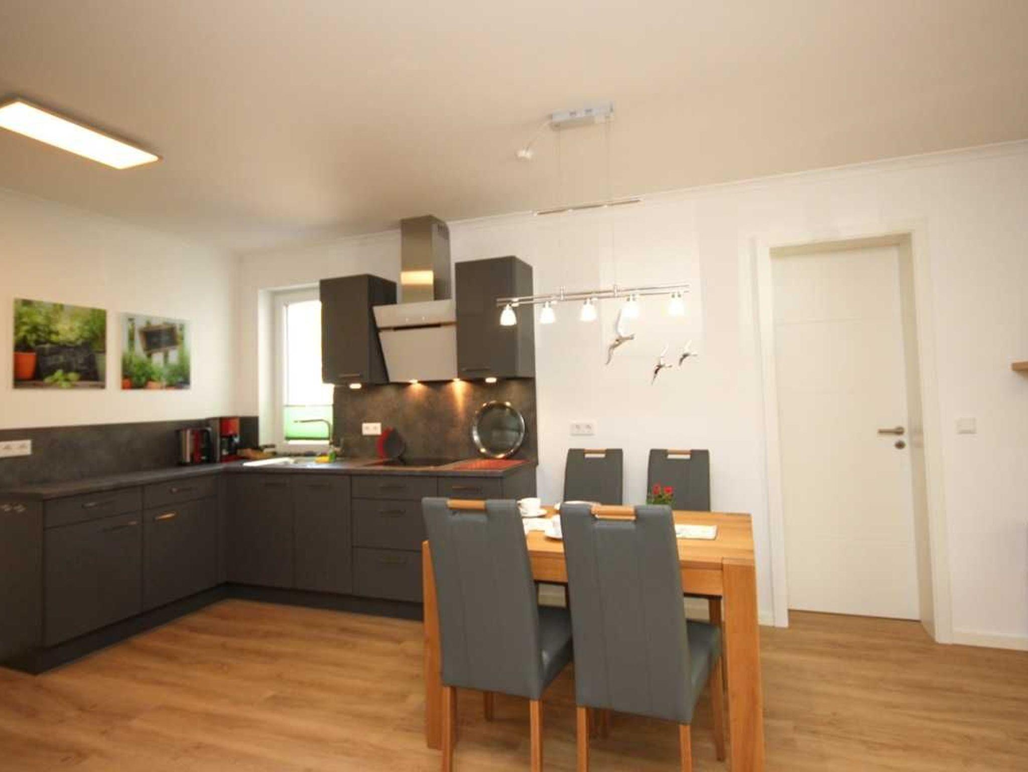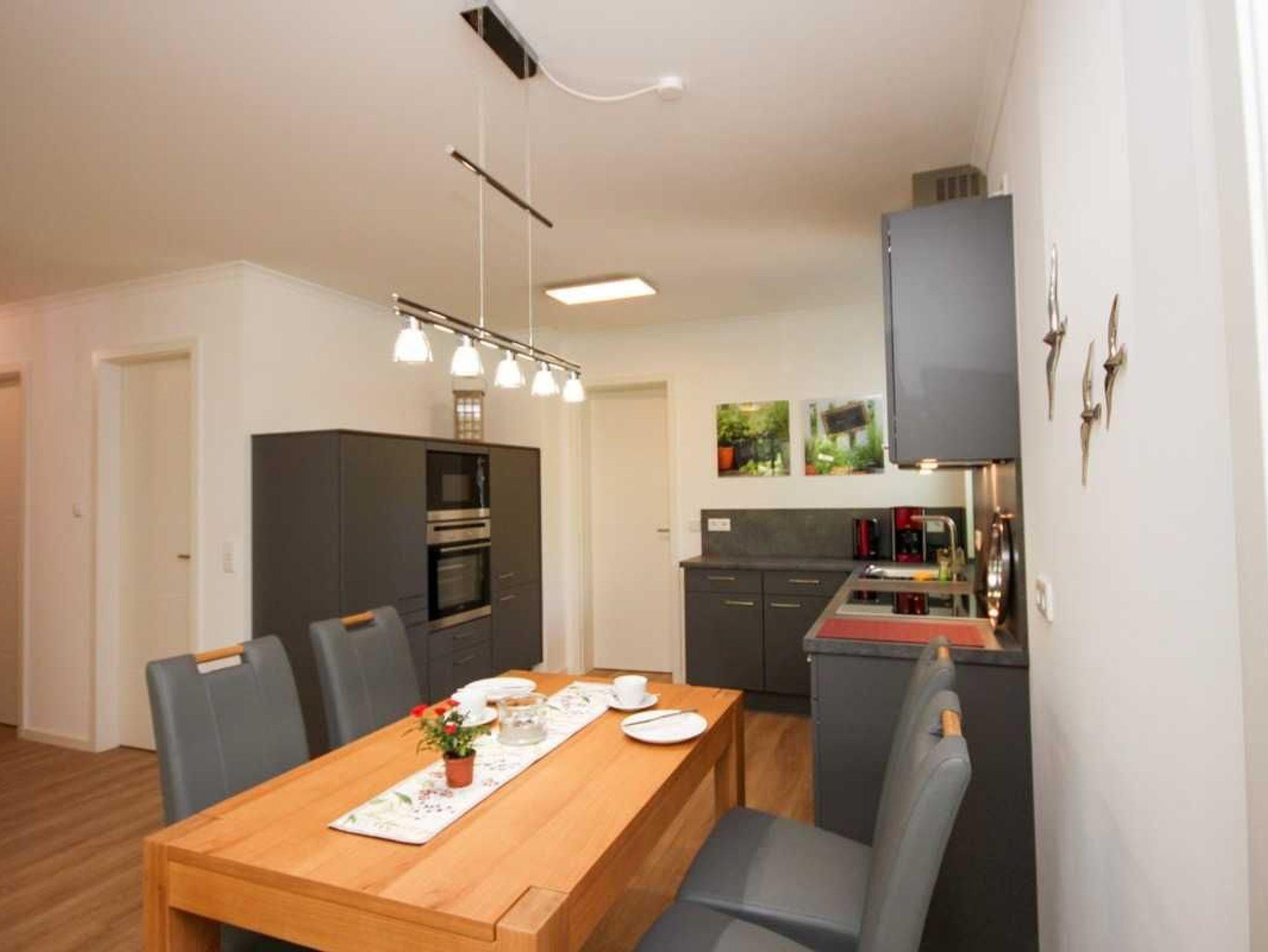 Im großzügigen Wohnbereich mit moderner offener Küche befinden sich bequeme Ledersitzmöbel, ein ausziehbarer Esstisch mit vier Stühlen , zur Unterhaltung stehen ein Flatscreen-LED-TV, ein WLAN-fähiger Blu-ray-Player sowie eine kleine HIFI-Stereoanlage zur Verfügung.