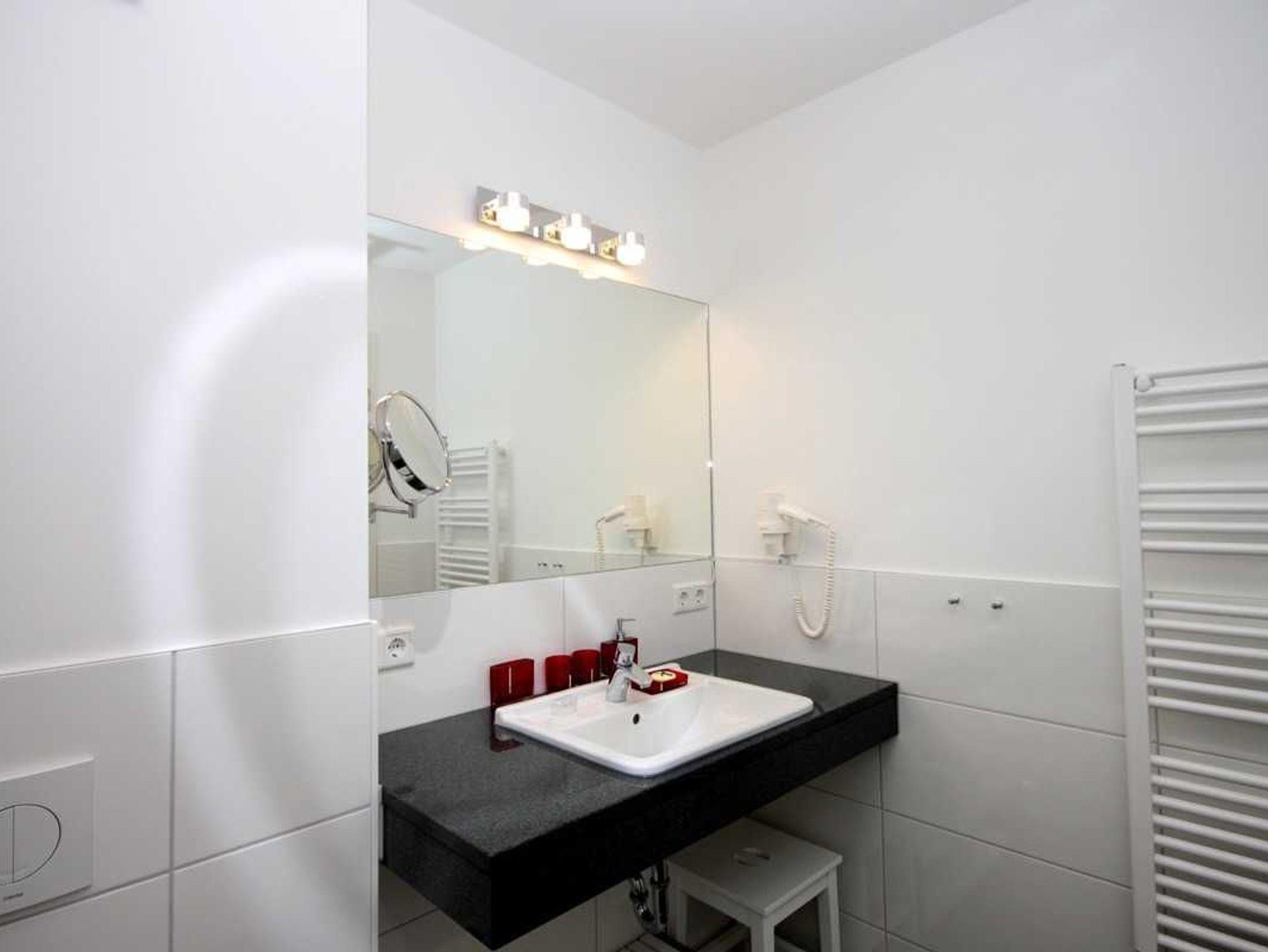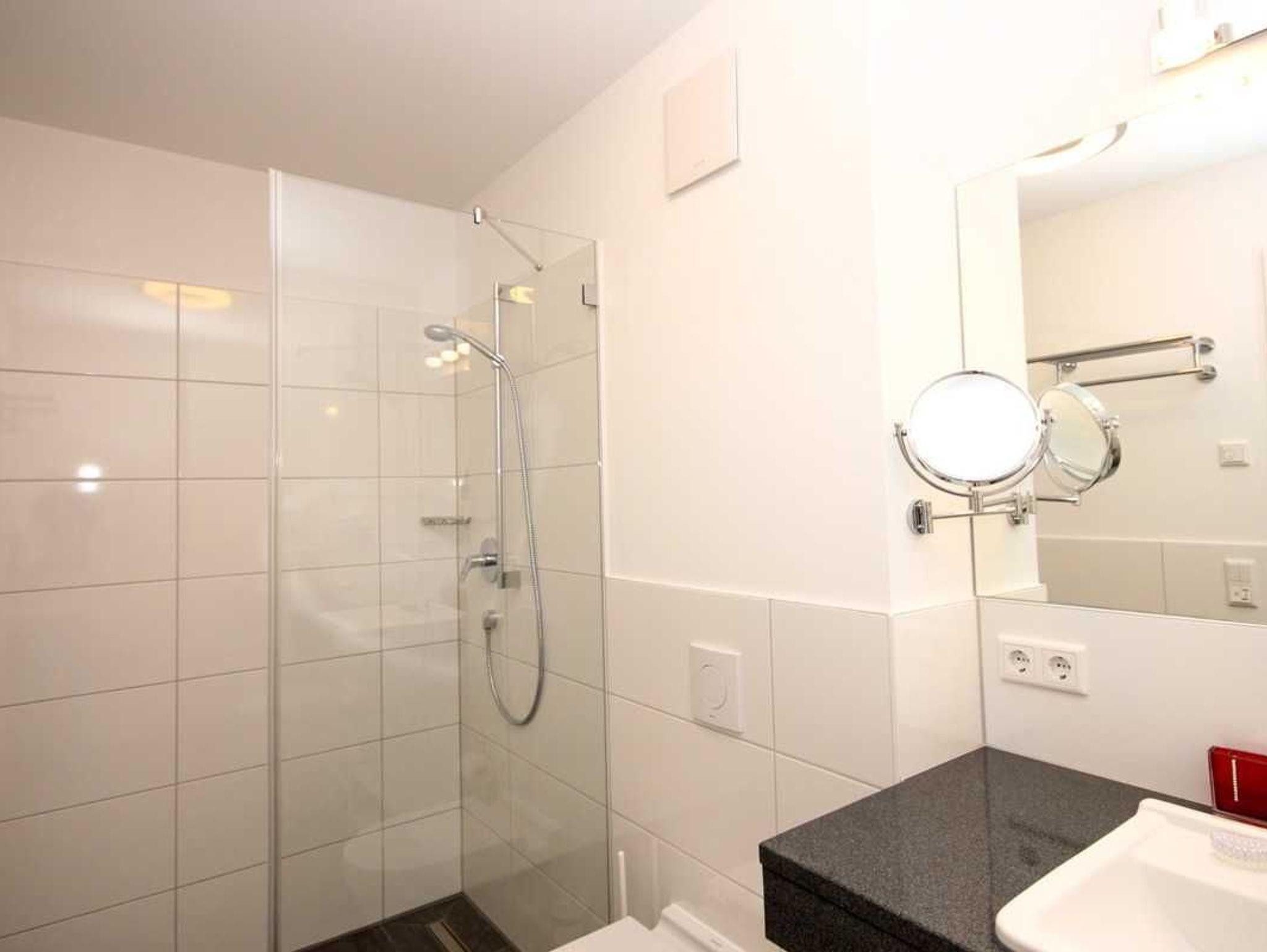 Das Badezimmer ist elegant gefliest mit ebenerdiger Dusche, zusätzlich sind ein elektrisch beheizbarer Handtuchhalter, ein Kosmetikspiegel und ein Haarfön vorhanden.