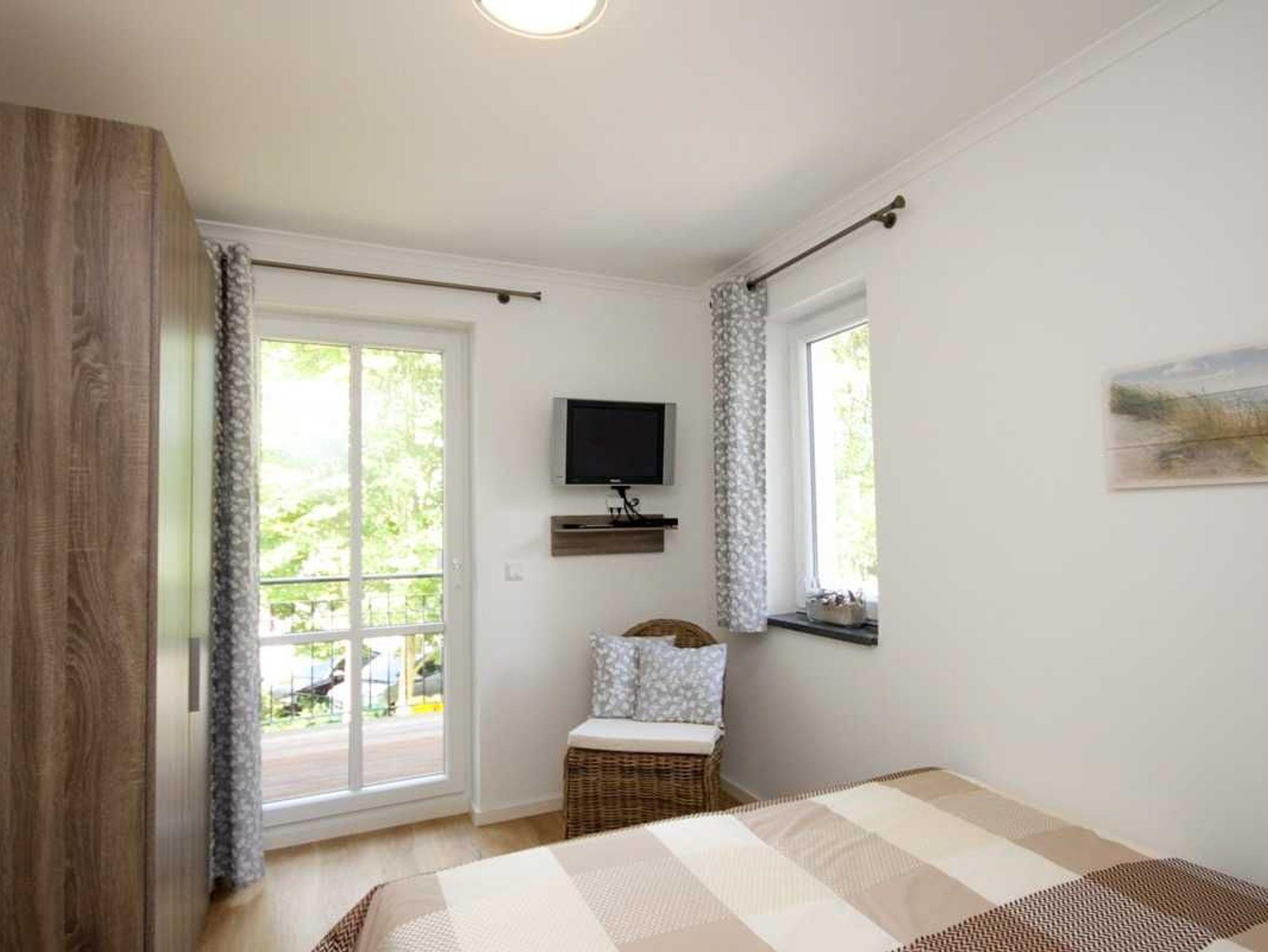 In der Wohnung befinden sich zwei Schlafzimmer (1 Boxspringbett 1,80 x 2,00 m mit durchgehender Matratze und ein bequemes Doppelbett 1,60 m x 2,0 m). Vom kleineren Schlafzimmer (hier befindet sich auch ein TV-Gerät) kann man auf einen Balkon hinaustreten, der sich unter anderem zum Trocknen der Bade- bzw. Wandersachen eignet.