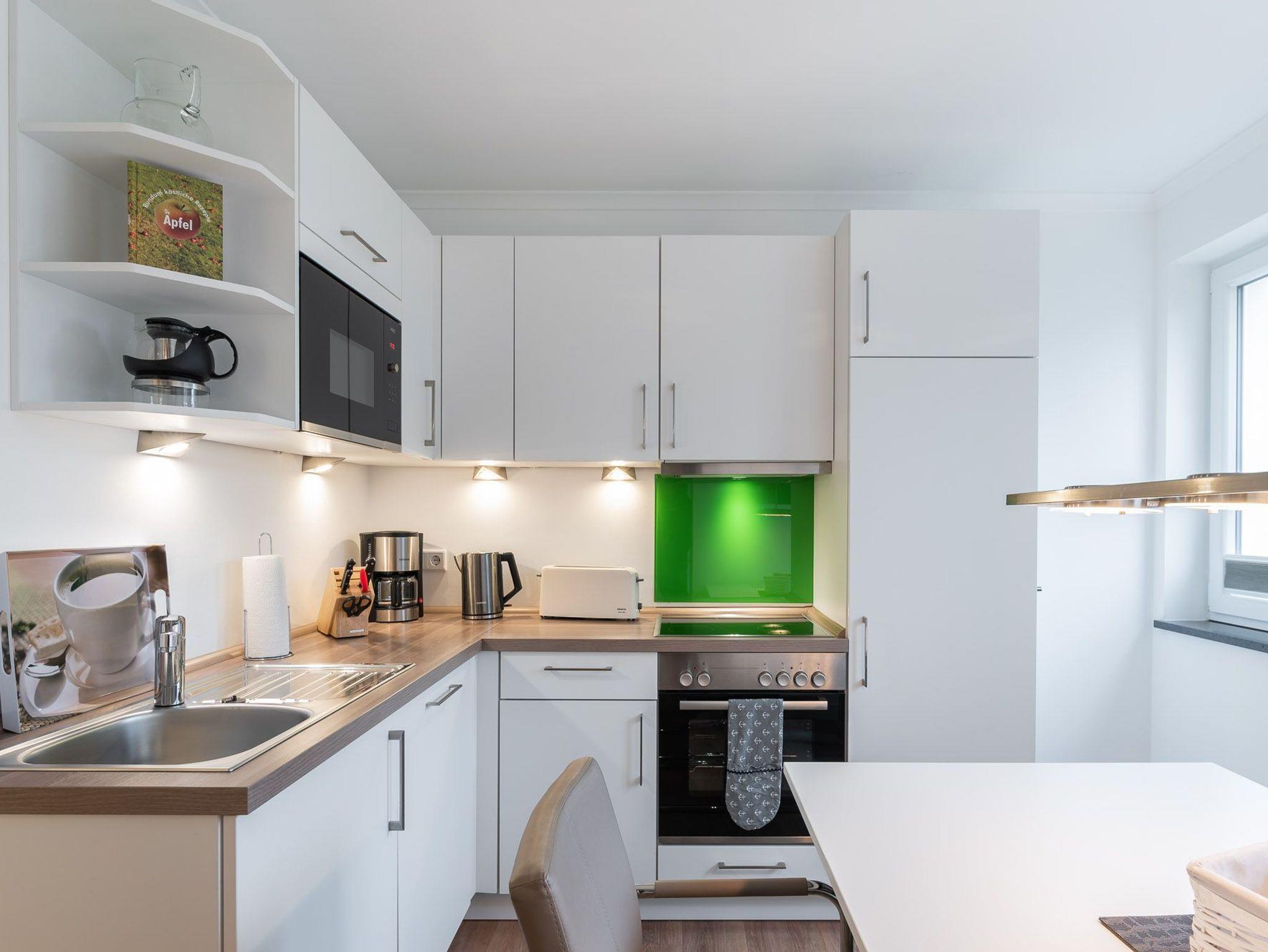 Die Küche ist ausgestattet mit einer hochwertigen Einbauküche, einem Esstisch und vier Stühlen, Geschirrspüler, Kühlschrank mit Gefrierfach, Kaffeemaschine, Wasserkocher, Toaster, Mixer, ausreichend Geschirr und Besteck, 4-Platten-Herd (Ceran) mit Backofen und einer Mikrowelle.