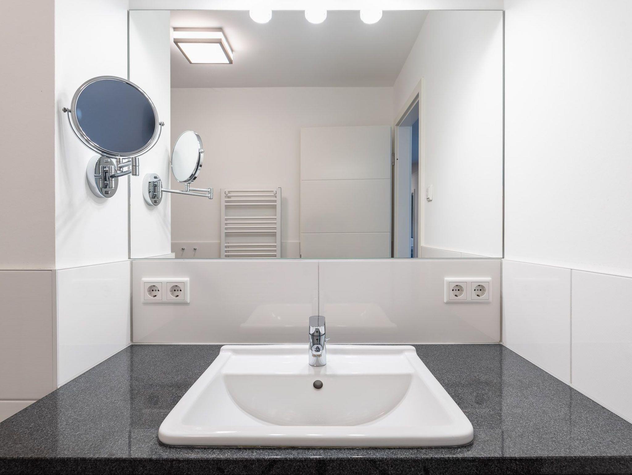 Weiterhin bietet die Ferienwohnung ein geräumiges Schlafzimmer mit einem großzügigen Kleiderschrank. Ein Boxspringbett mit einer durchgehenden Matratze/Topper (1,80x2,00 m) sorgt für einen erholsamen Schlaf. Das Badezimmer ist mit einer bodengleichen Dusche, einem großen Waschtisch, einem Wandspiegel und einem Fön ausgestattet.