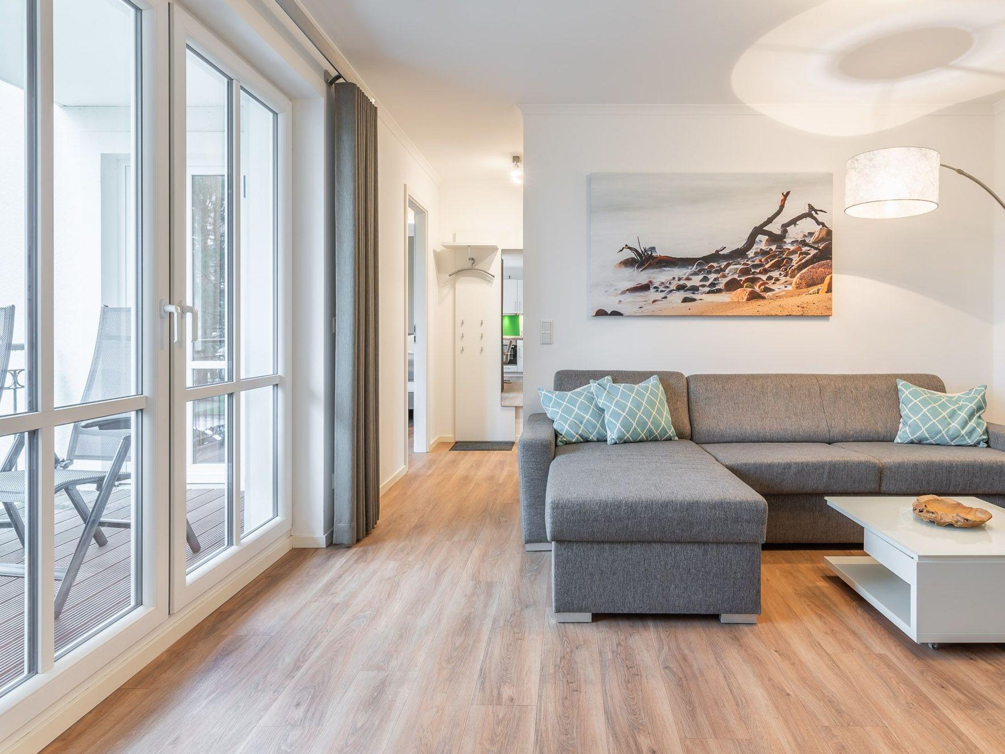 Die 2-Zimmer-Ferienwohnung im 1. OG des neu errichteten Ferienparks im Ostseebad Nienhagen lässt kaum Wünsche offen. Der Wohnbereich verfügt über eine große und gemütliche Schlafcouch, einen Couchtisch, ein 48-Zoll-Fernseher, ein Multimedia-Center