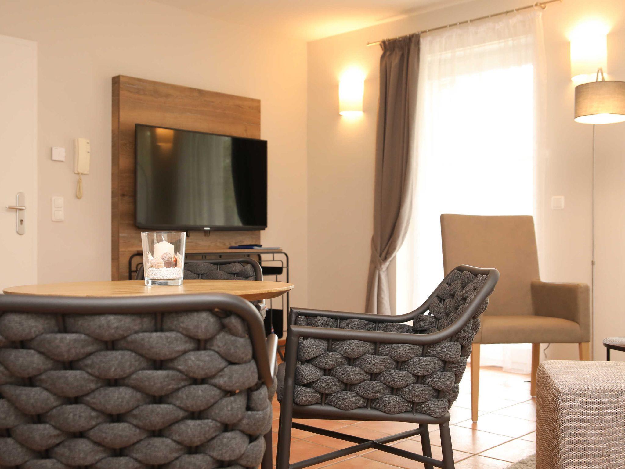 Die Ferienwohnungen sind alle in separate Schlaf- und Wohnbereiche unterteilt. Alle Apartments sind komplett mit Fußbodenheizung und einem Vollbad (außer die behindertenfreundliche Wohnung Nr. 3) ausgestattet und verfügen über einen eigenen Balkon oder eine Terrasse. Teilweise ist in den Wohnungen auch ein Kamin oder ein Whirlpool vorhanden, welche zum Wohlfühlerlebnis beitragen.