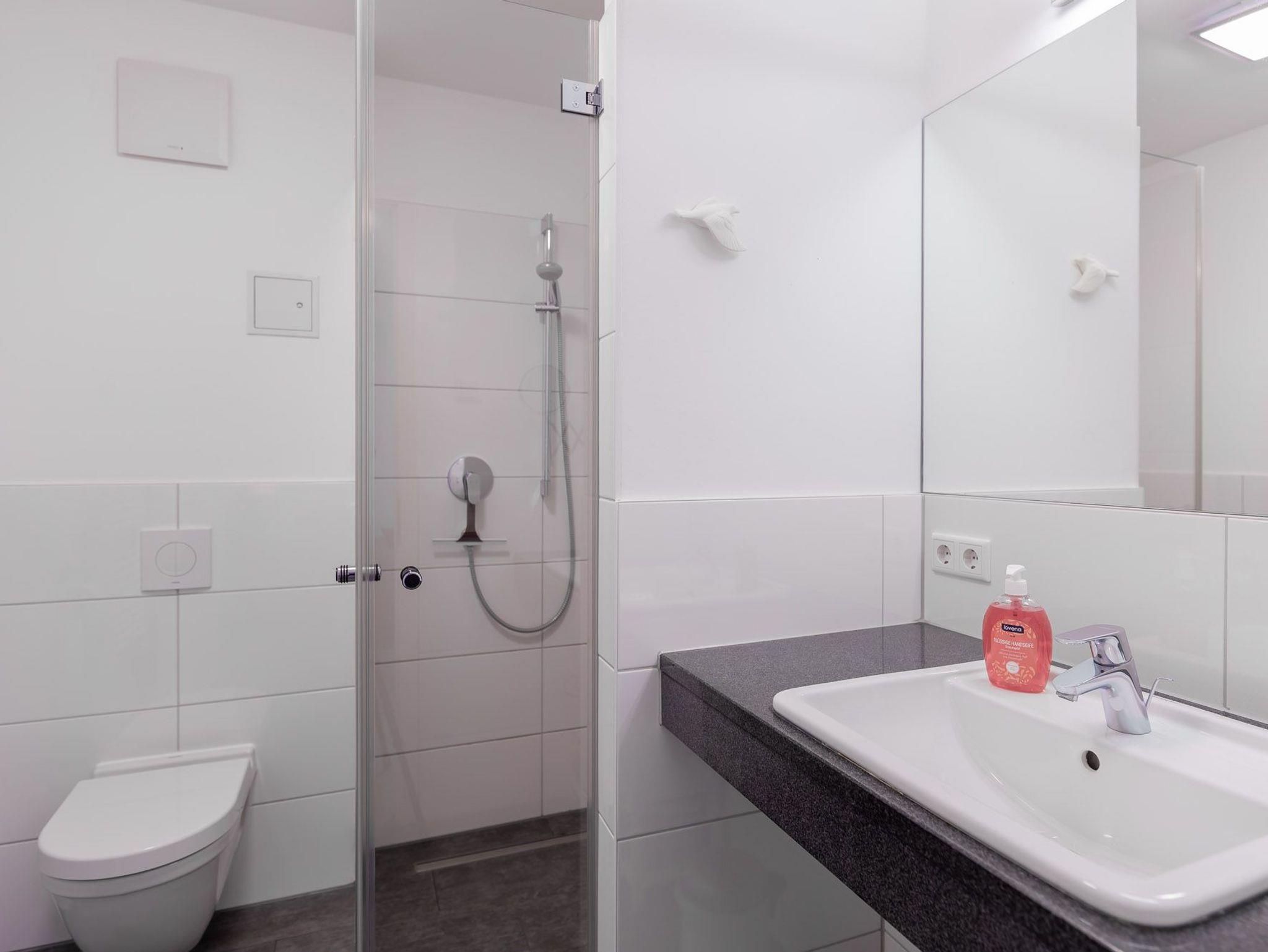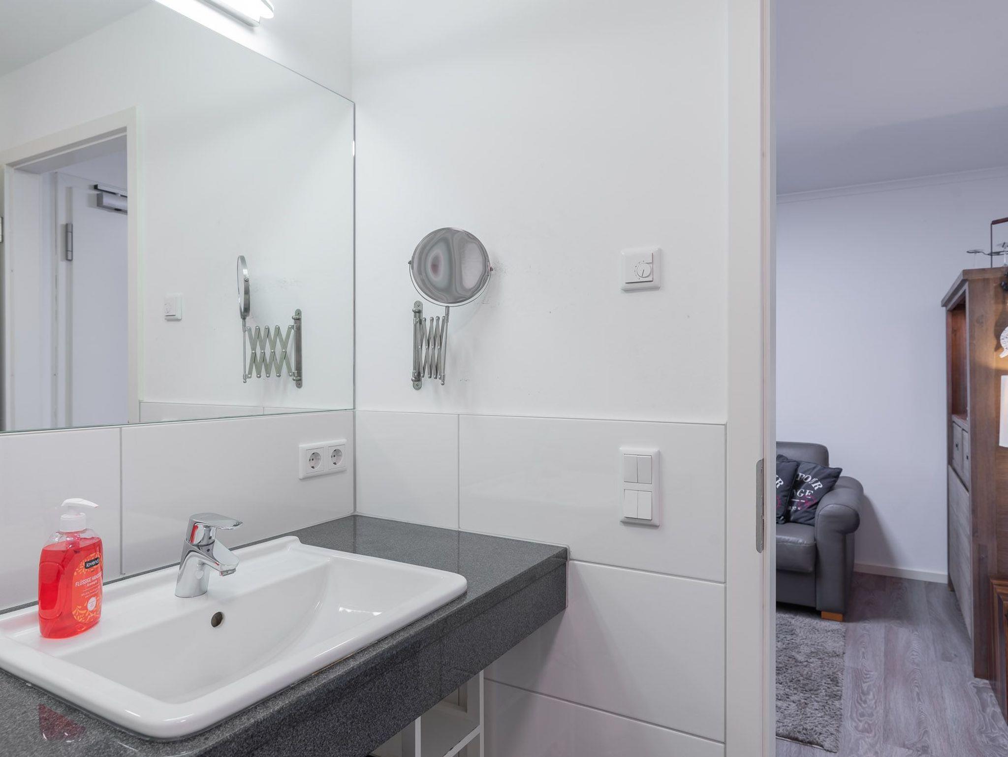 Das Badezimmer ist mit einer bodengleichen Dusche, einem großen Waschtisch, einem Wandspiegel und einem Fön ausgestattet.