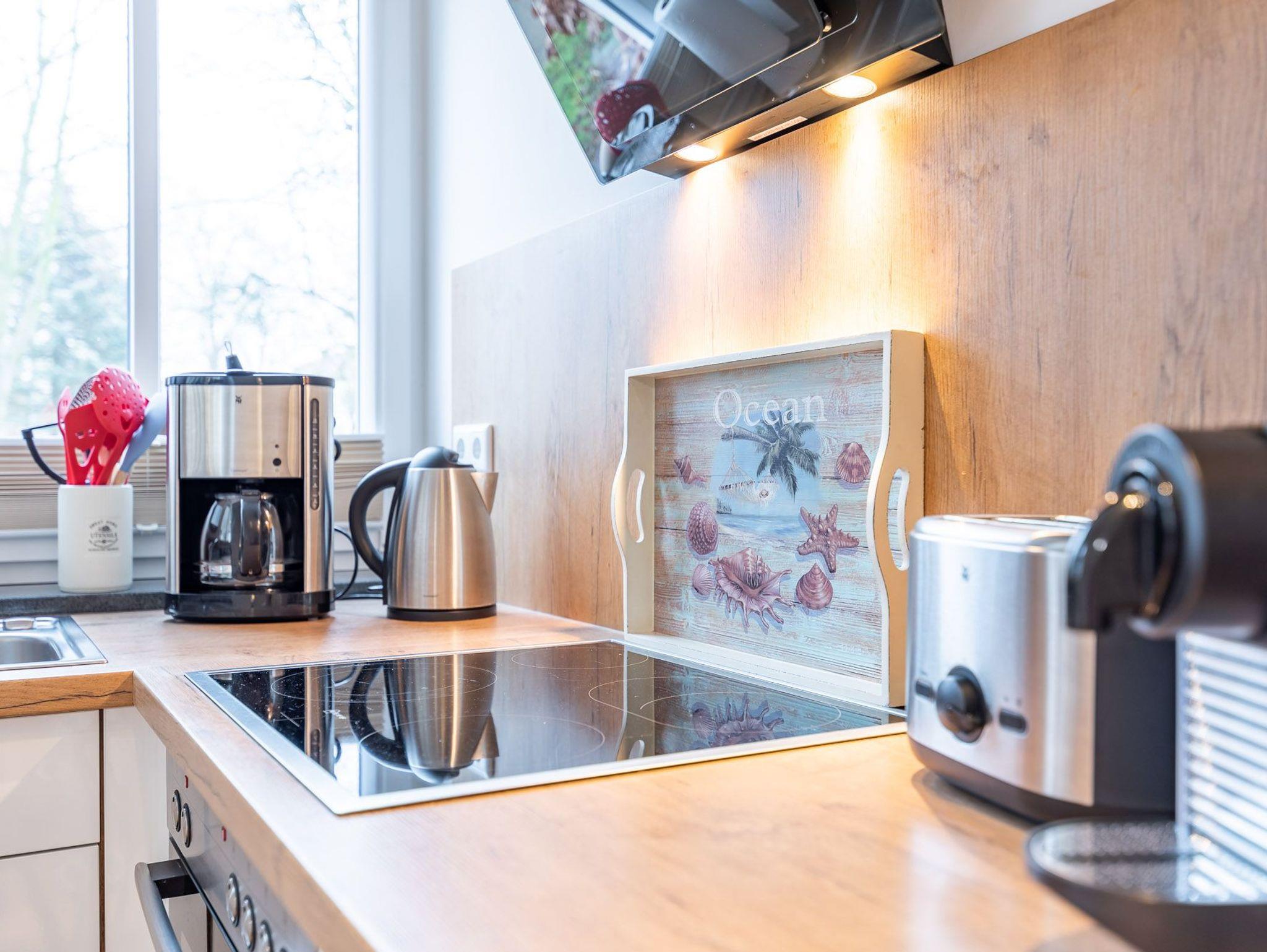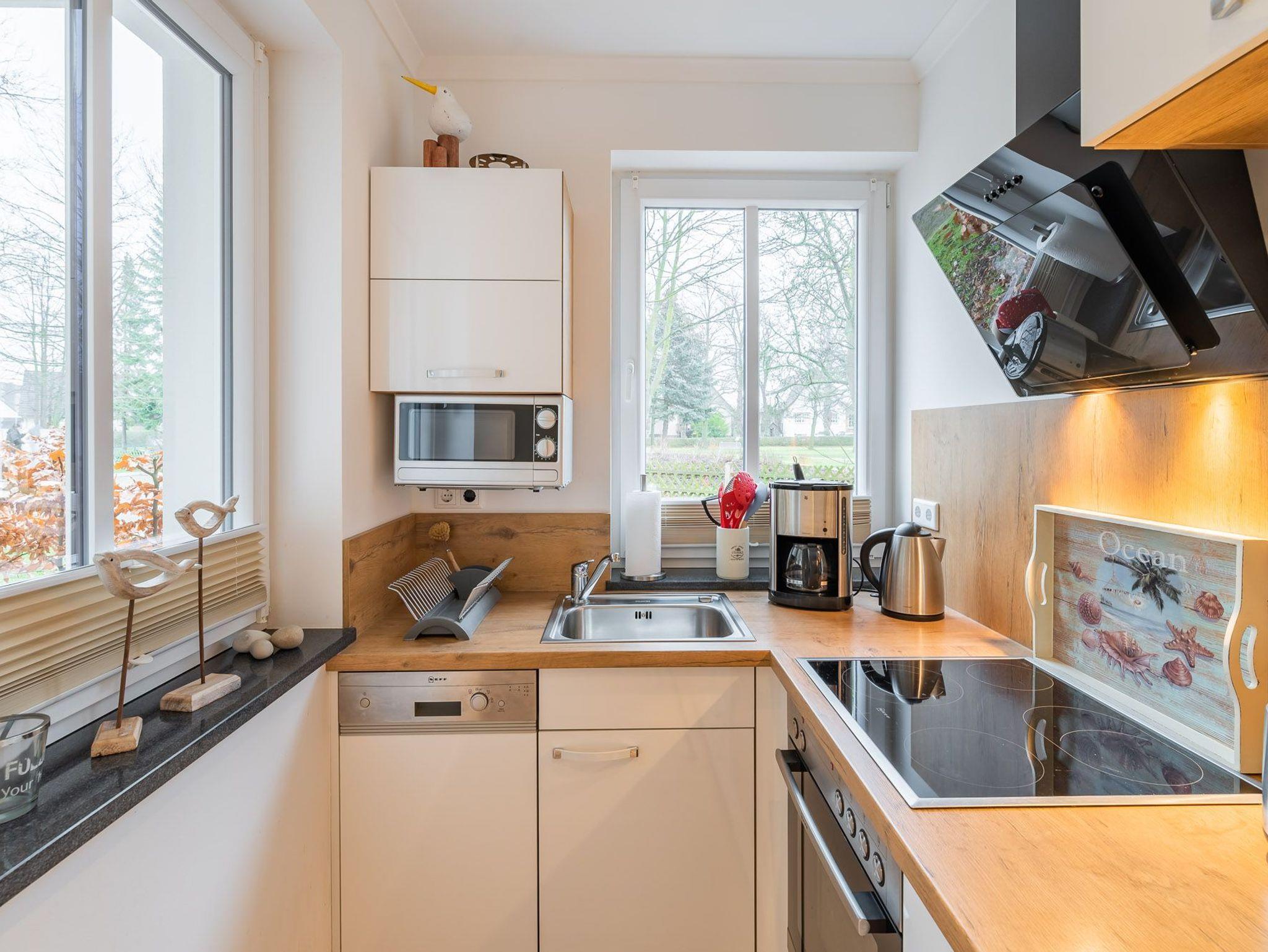 Die Wohnung ist ausgestattet mit einer hochwertigen Einbauküche, Geschirrspüler, Kühlschrank mit Gefrierfach, Kaffeemaschine, Wasserkocher, Toaster, ausreichend Geschirr und Besteck, 4-Platten-Herd (Ceran) mit Backofen und einer Mikrowelle.
