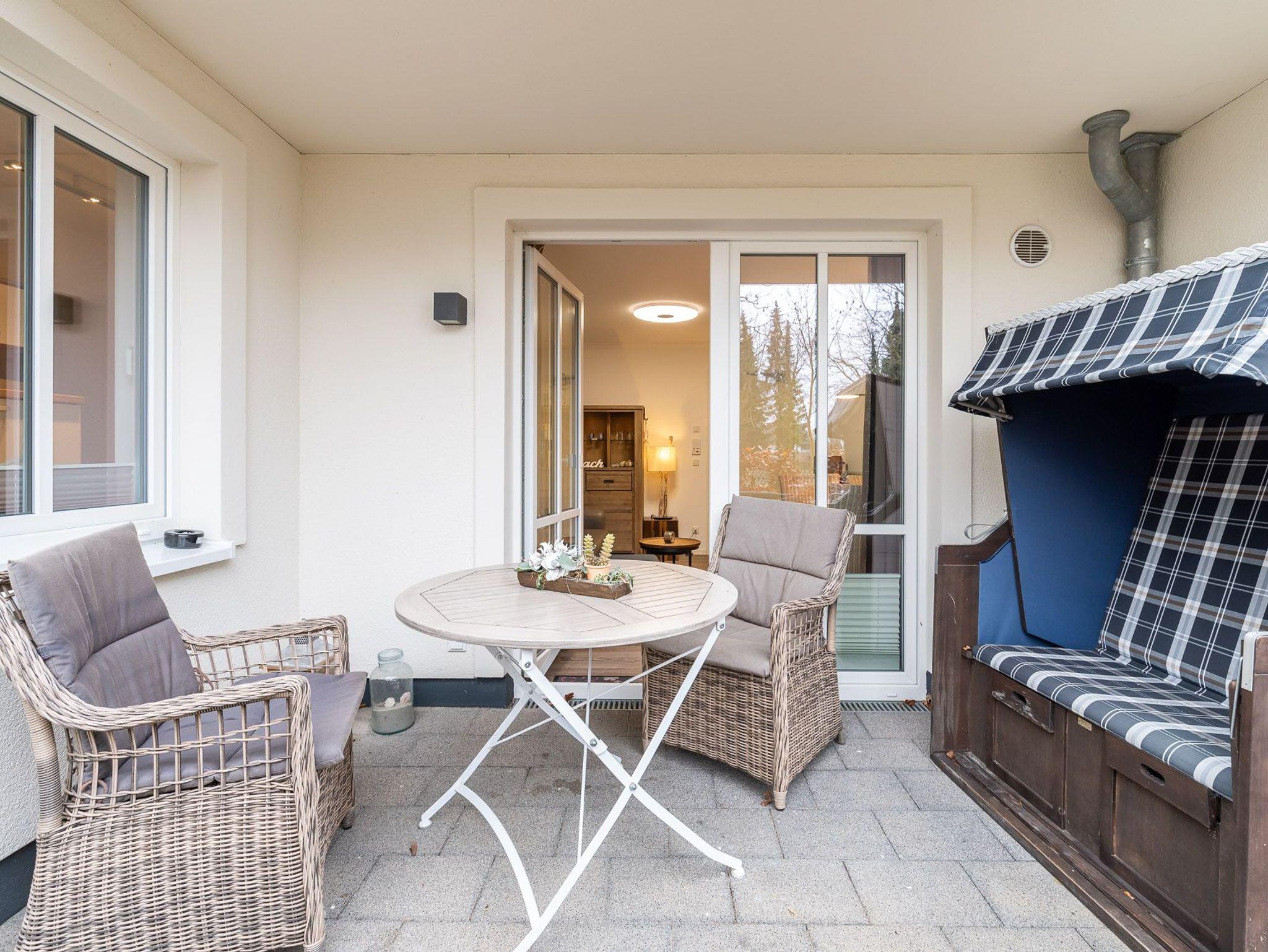 Auf der mit einem Tisch, 2 Rattan Sesseln und einem Strandkorb möblierten Terrasse (nordöstliche Ausrichtung) lassen sich gemütliche Sonnen- und Abendstunden verbringen.