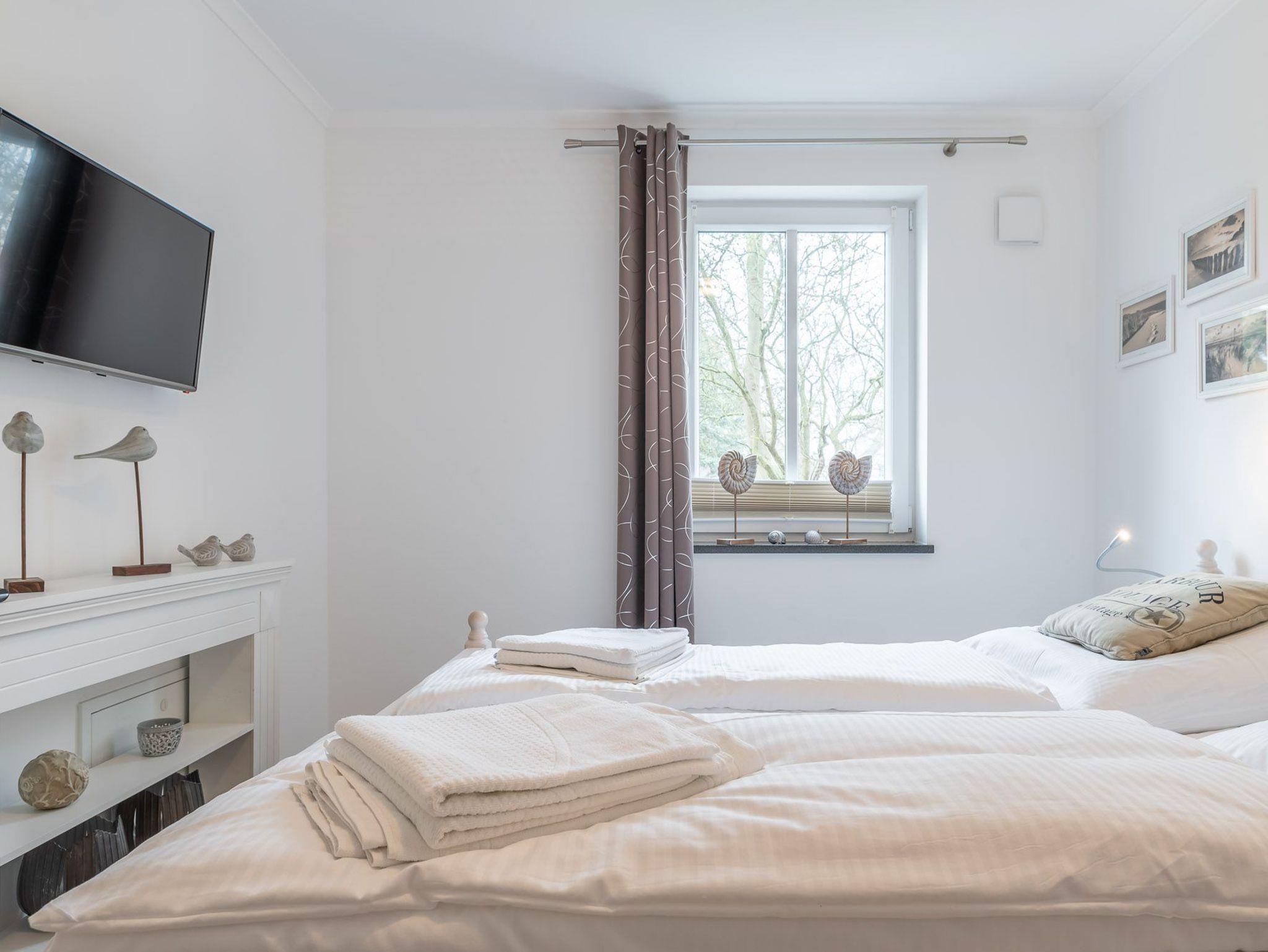 Im freundlichen Schlafzimmer finden Sie neben einem weiteren LED-TV ein komfortables Doppelbett (1,80 m) und einen geräumigen Kleiderschrank vor.