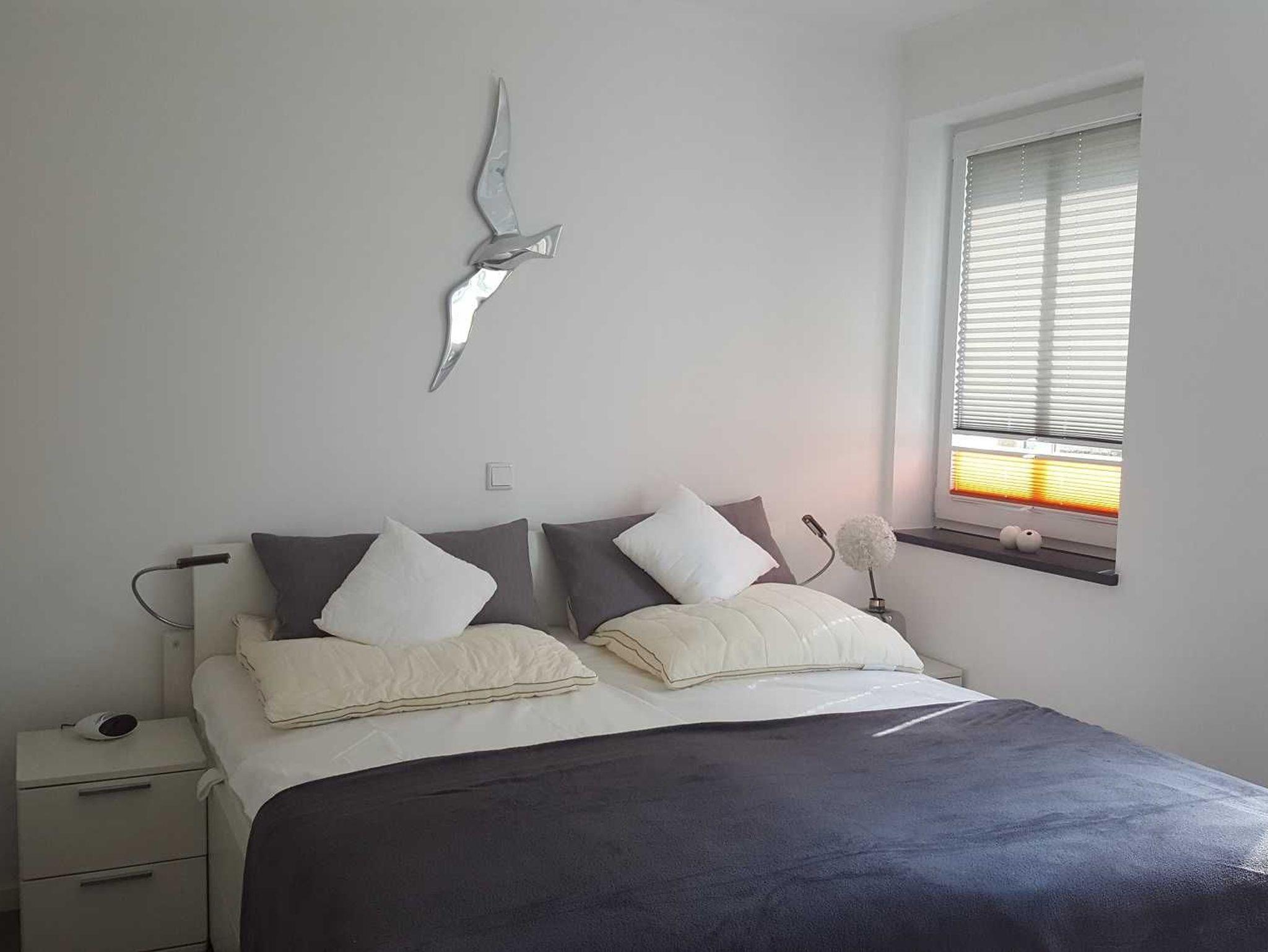 Im freundlichen Schlafzimmer haben Sie ein komfortables Doppelbett, einen geräumigen Einbaukleiderschrank und ein Flatscreen-TV. Das Badezimmer bietet eine ebenerdige Dusche sowie einen großen Waschtisch mit durchgehendem Spiegel und Fön. Die Ferienwohnung hat eine Fußbodenheizung und es gehört ein kostenfreier Außenstellplatz (ca. 30m vom Objekt entfernt) dazu.