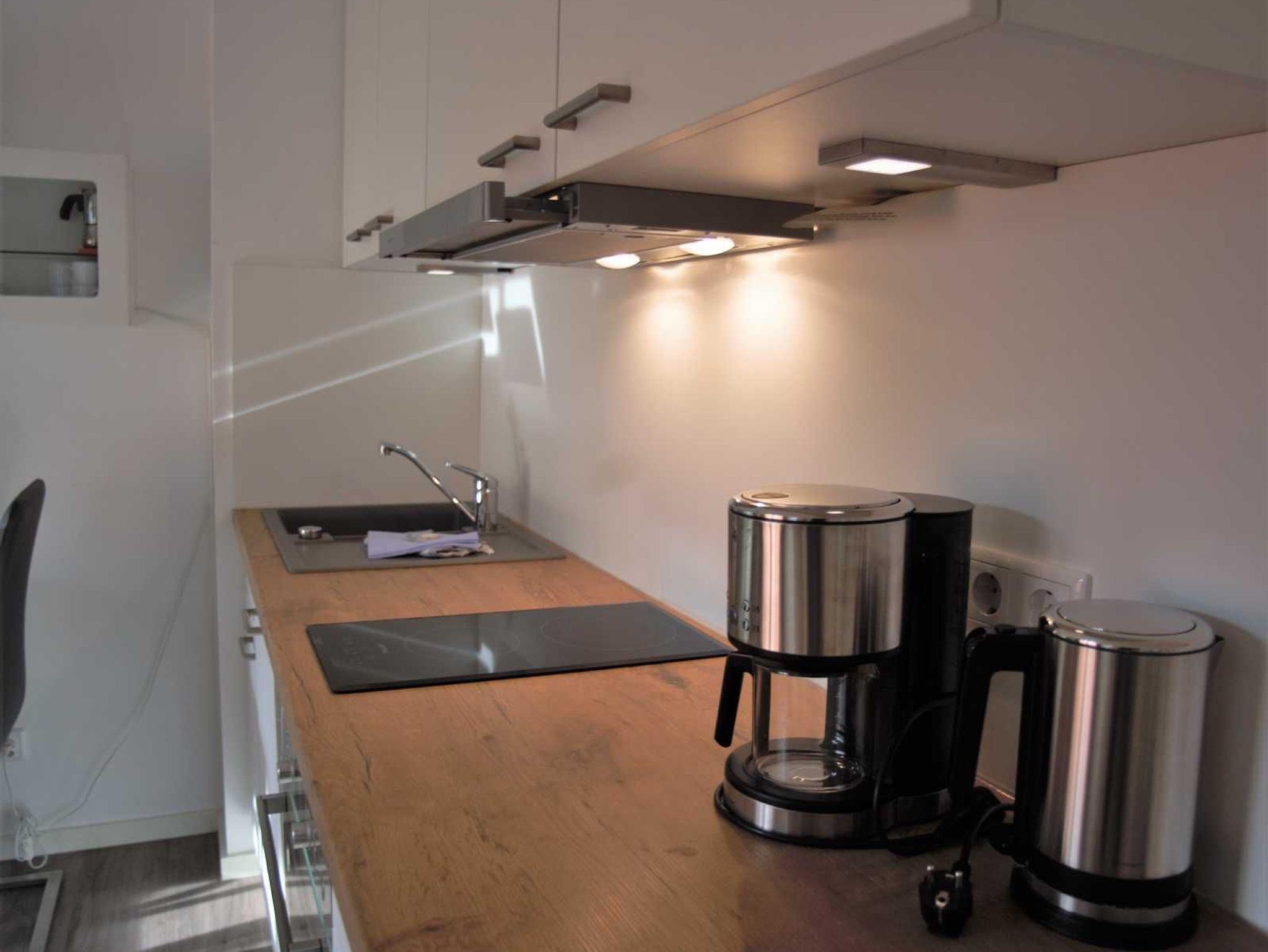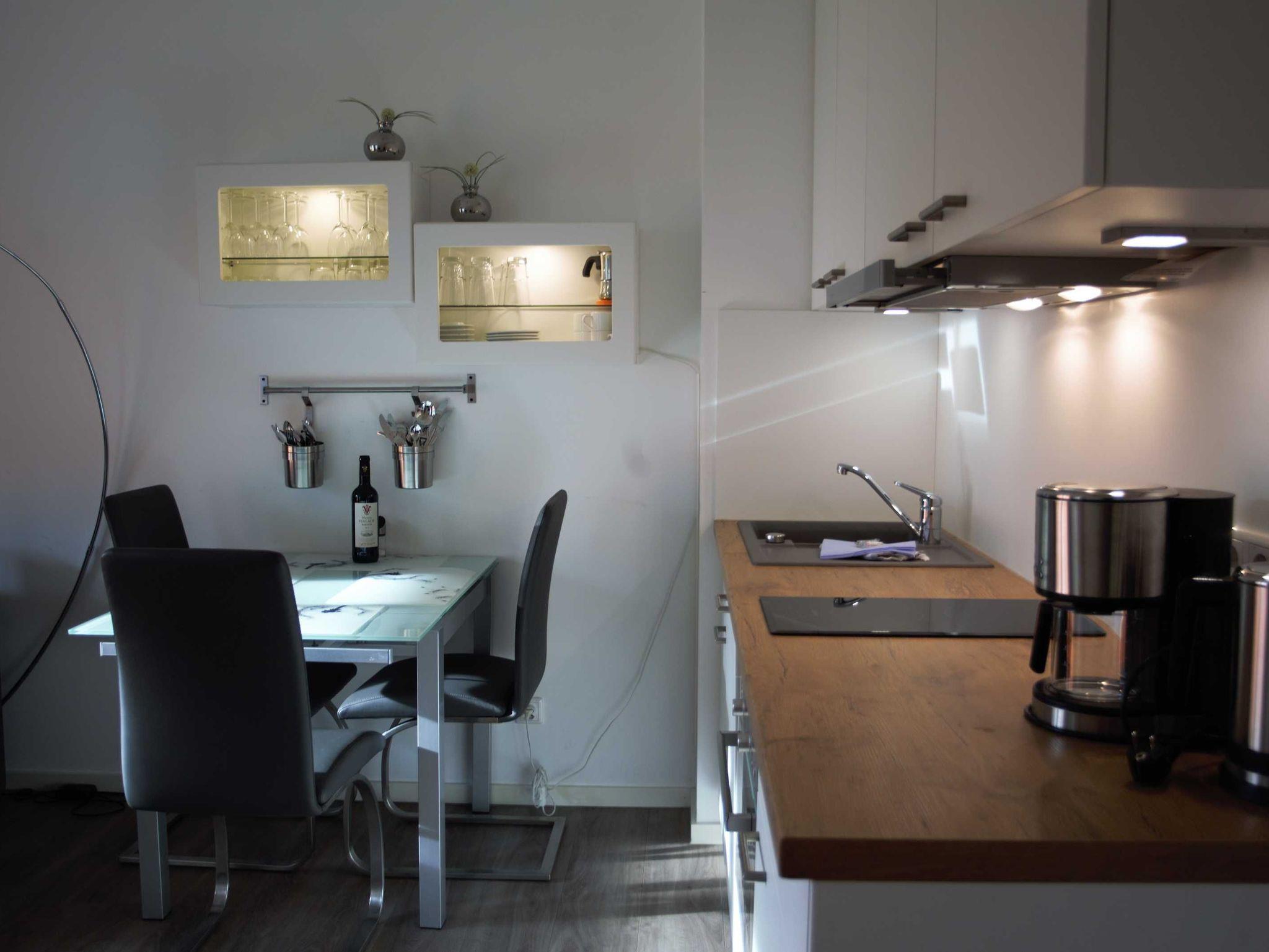 Im offenen Ess- und Küchenbereich finden Sie einen Tisch mit vier Stühlen und eine moderne Einbauküche mit einem Zwei-Feld-Ceranfeld, Geschirrspüler, Kühlschrank mit Gefrierfach, Backofen mit Mikrowellenfunktion, Kaffeemaschine, Wasserkocher und Toaster.