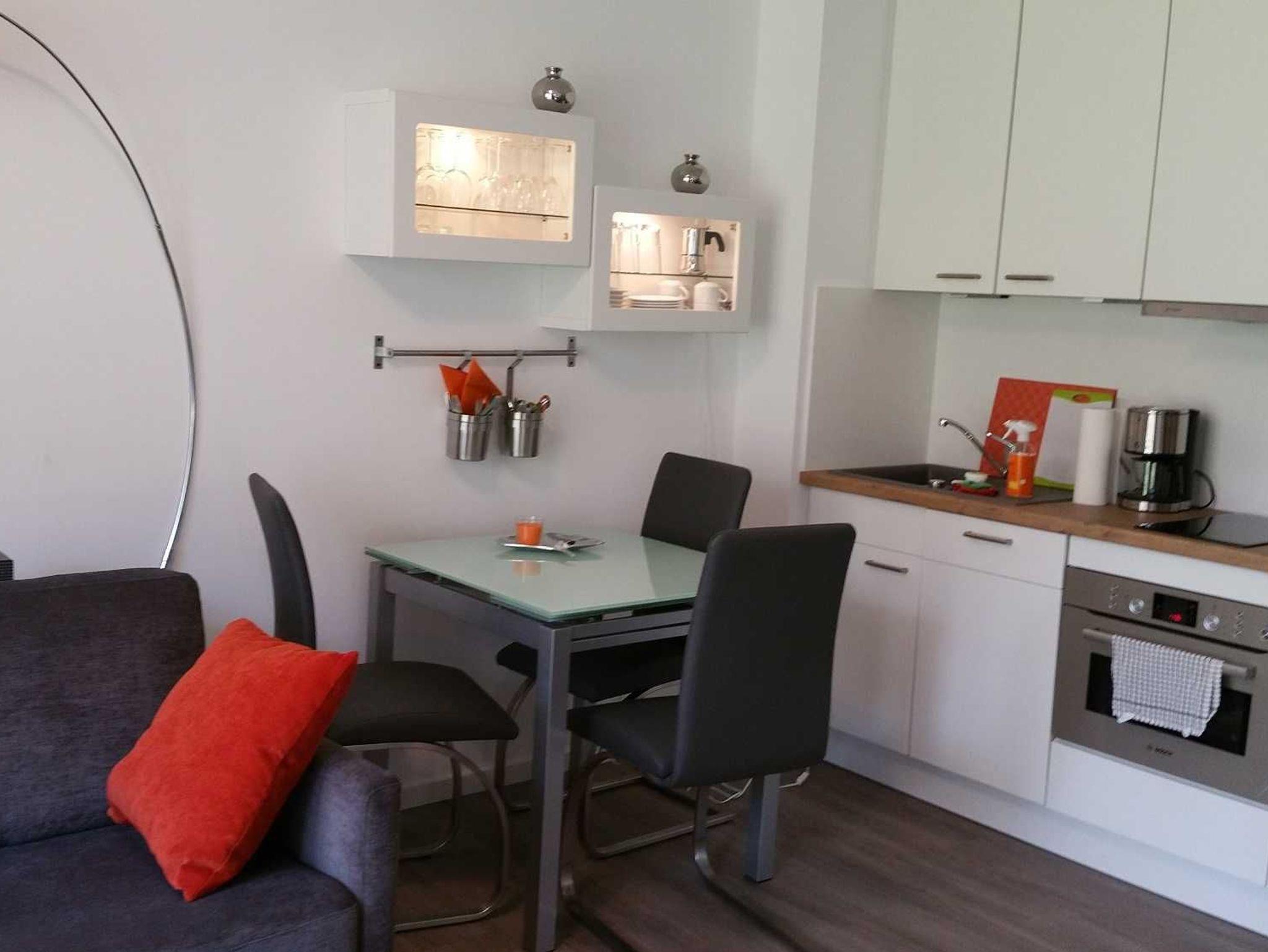 Diese für drei Personen ausgestattete Wohnung befindet sich im Erdgeschoss des Hauses Pamir. Vom Wohnbereich haben Sie Zugang zur geschützten Terrasse, von der Sie direkt auf die umzäunte Grünanlage mit altem Baumbestand gelangen. Auf der Couch, die sich zum Bett (140 x 200 cm) umfunktionieren lässt, lässt sich wunderbar relaxen. Flatscreen-TV, Blue Ray-Player und eine kleine Stereoanlage gehören zur Ausstattung.