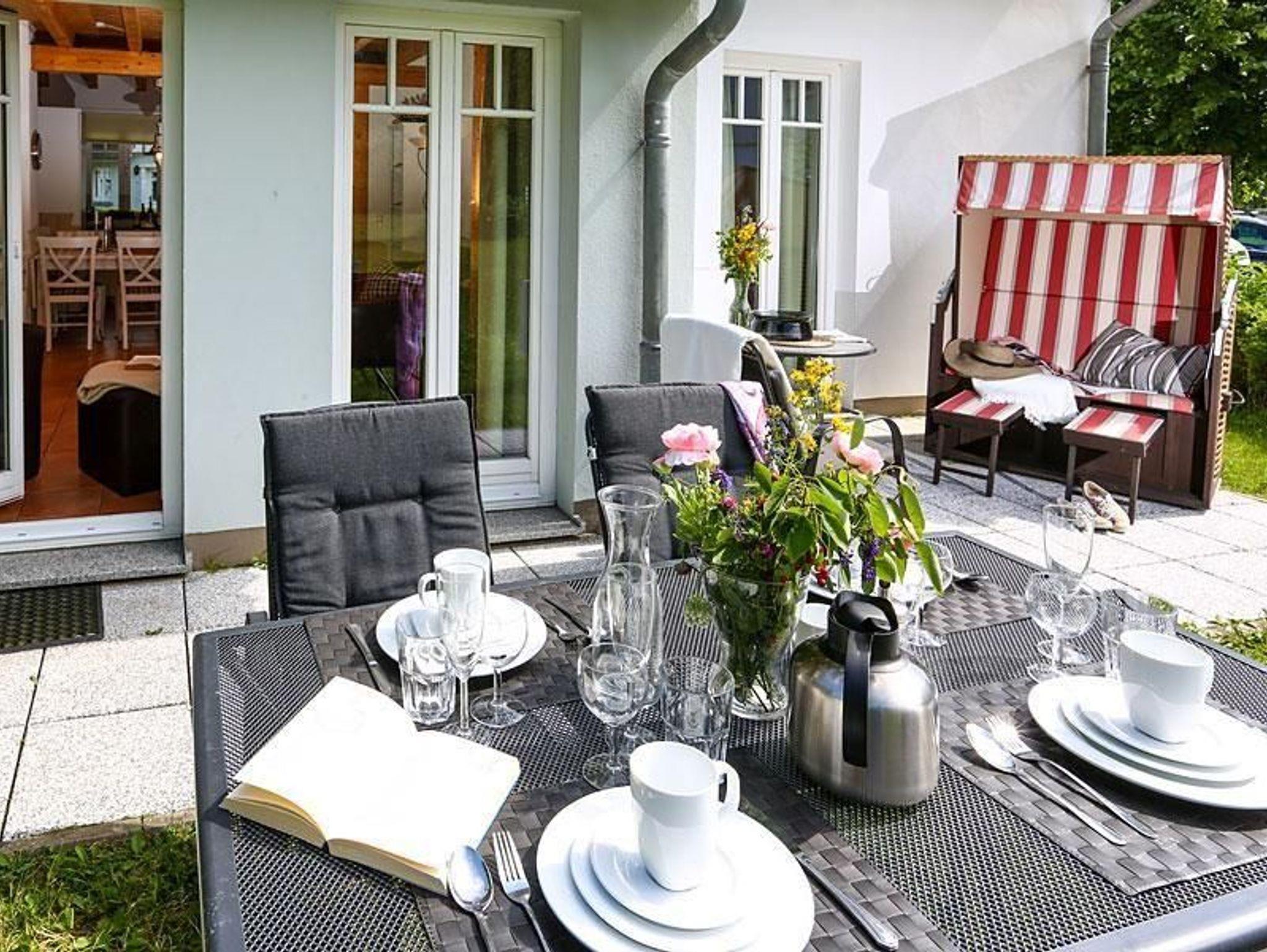 Große Terrasse mit Gartenmöbeln [&] Strandkorb (temporär, Saison)
