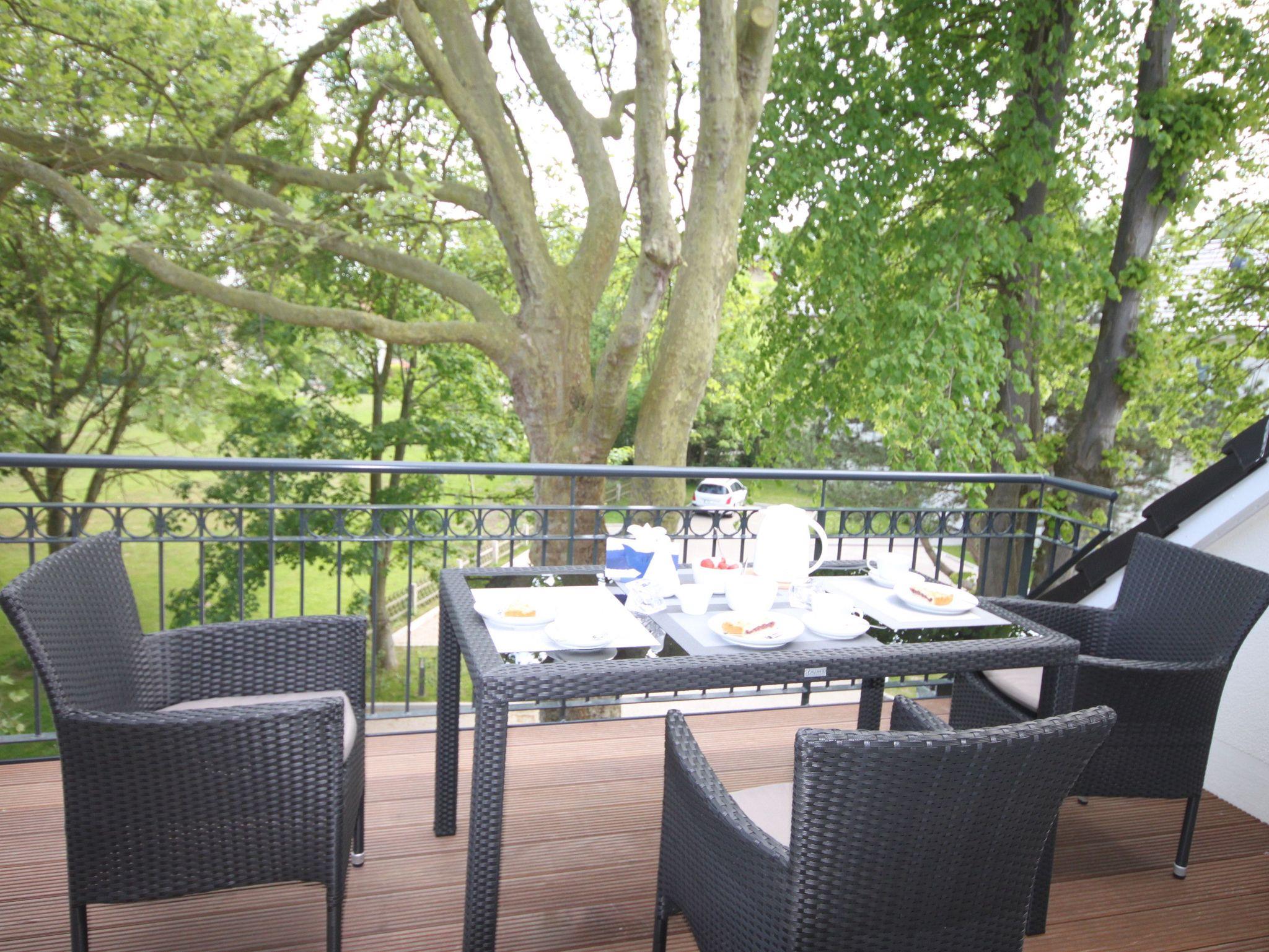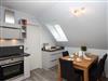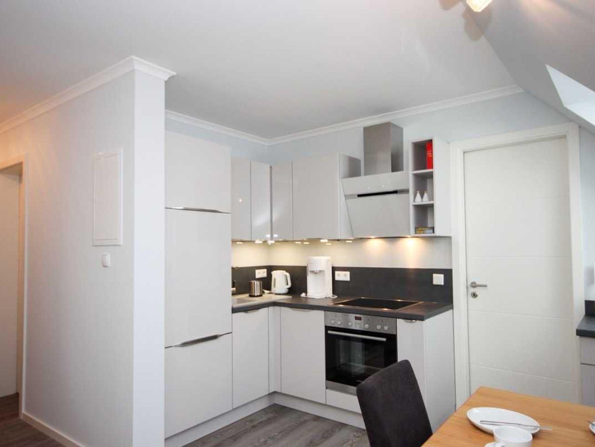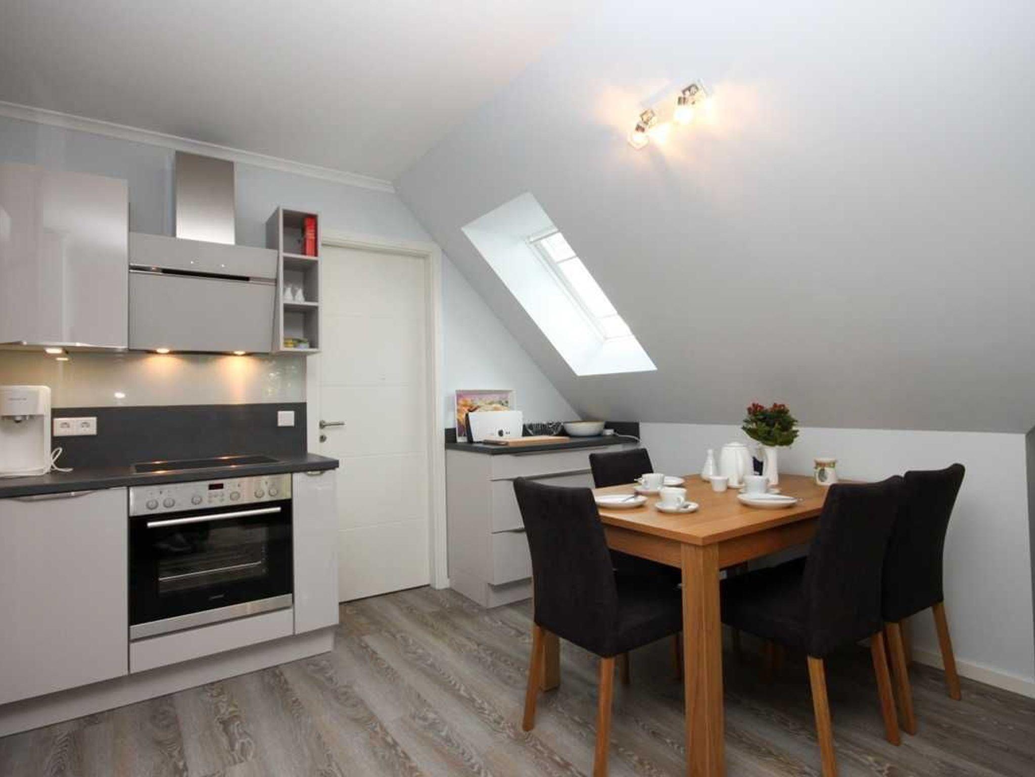 Vom Eingangsbereich gelangen Sie in den Wohnbereich mit offener Küche und dem Zugang zum Balkon mit Südausrichtung sowie zum Schlafzimmer im Türmchen. Im offenen Wohn- und Essbereich finden Sie eine gemütliche Couch zum Entspannen, eine kleine Auswahl an Büchern, einen Flat Screen-TV sowie eine DVD-Anlage, einen Esstisch mit sechs Stühlen und eine moderne Einbauküche mit Glaskeramik-Kochfeld, Backofen, Geschirrspüler, Toaster, Kaffeemaschine und Wasserkocher. Auf der mit einem Tisch und fünf Stühlen möblierten Terrasse können Sie viele gemütliche Sonnen- und ruhige Abendstunden verbringen.