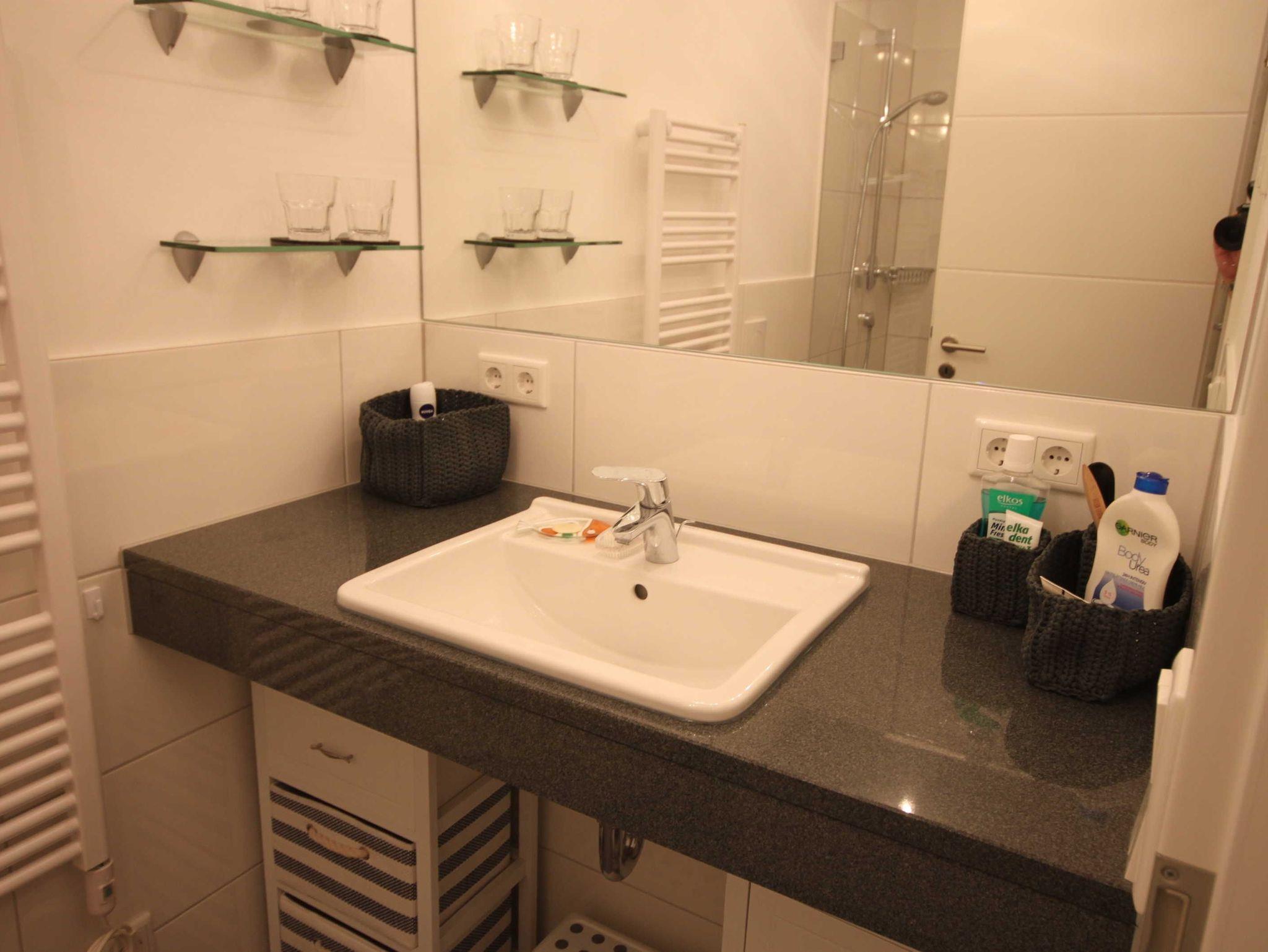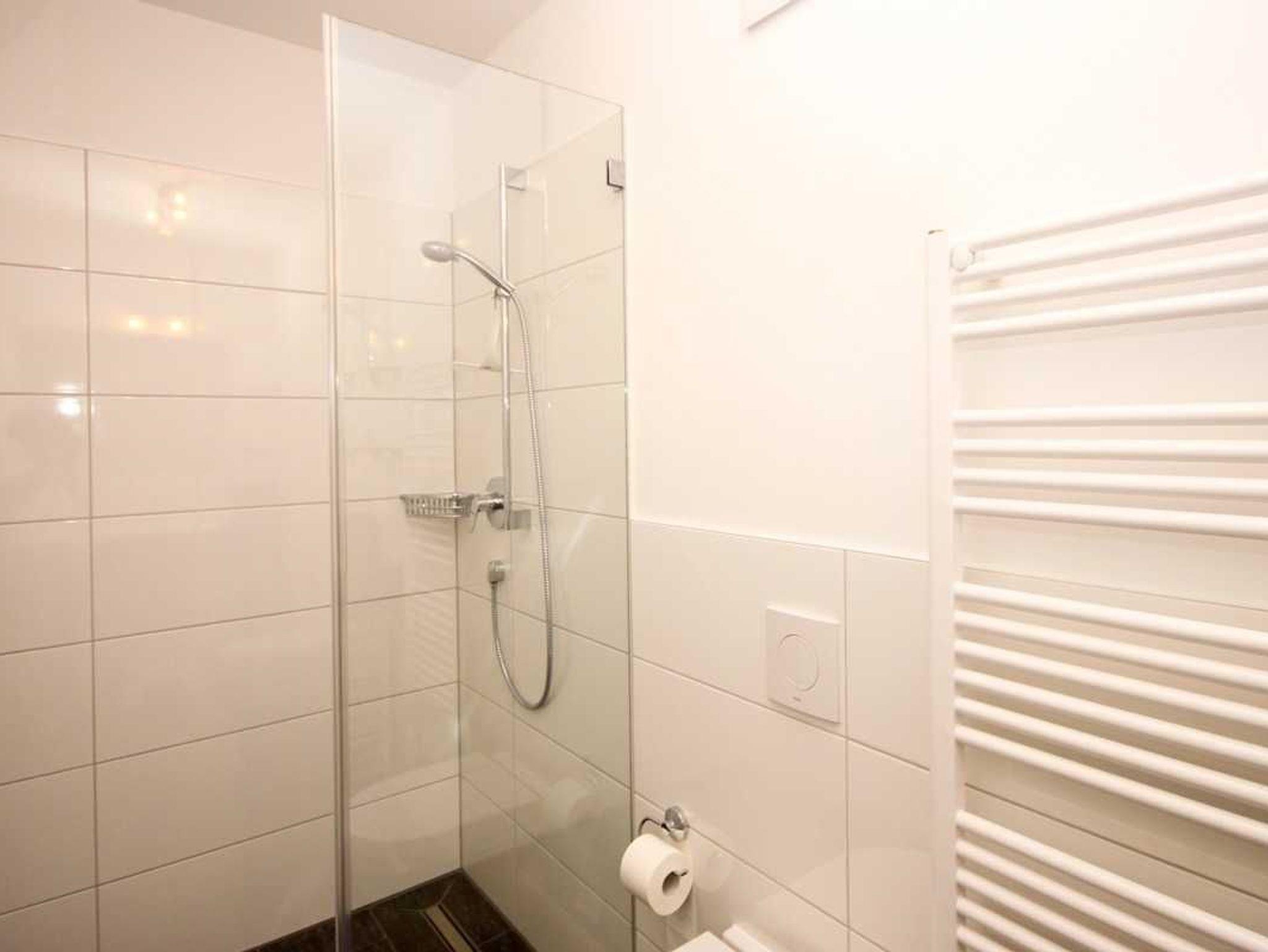 Das Badezimmer (innenliegend) bietet eine ebenerdige Dusche.