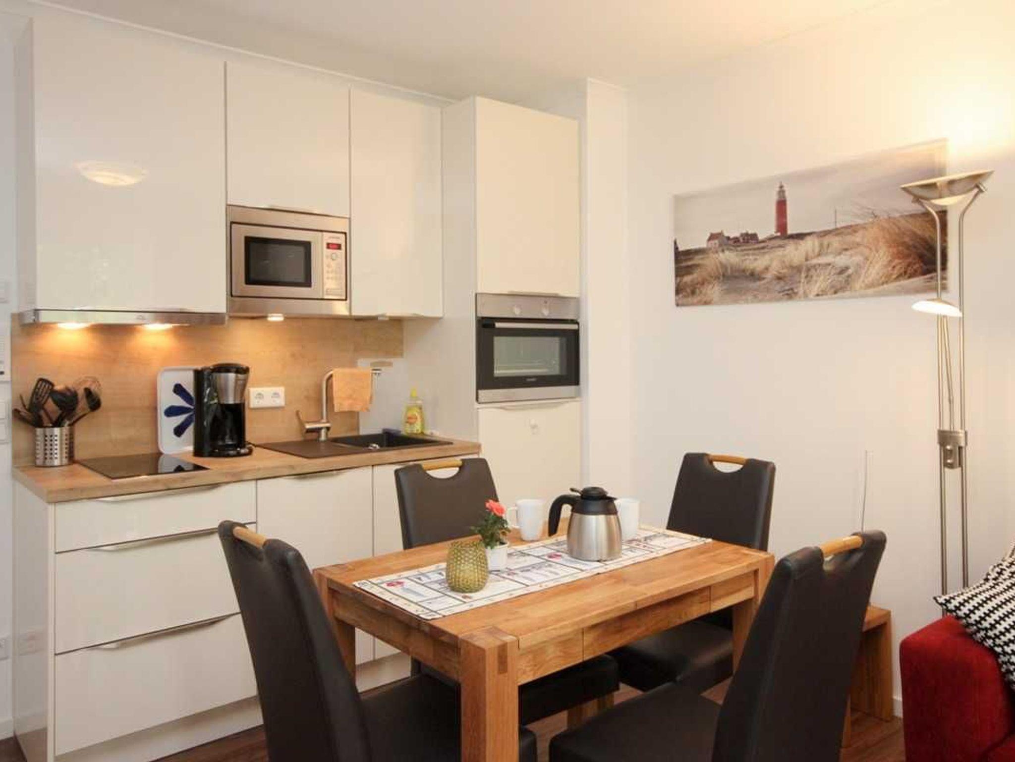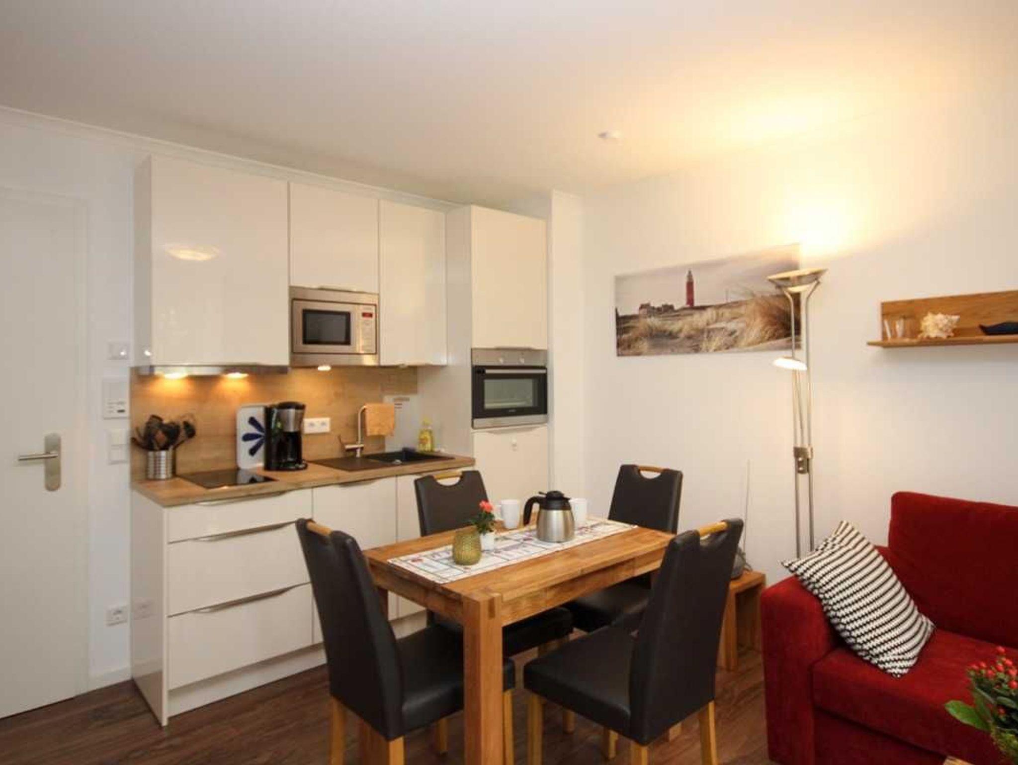 Freuen Sie sich auf wunderbare Tage am Strand und gleichzeitig auf die gediegene Atmosphäre Ihres 34 qm großen Appartements in der 1.Etage mit einem großzügigen Koch- ,Ess- und Wohnbereich. Der Wohnbereich verfügt über eine große und gemütliche Schlafcouch. Weiterhin bietet dieses wunderschöne Appartement ein Schlafzimmer mit Doppelbett (1,60x2,00 m / einzelne Matratzen) und Kleiderschrank. Das Duschbad ist mit einer bodengleichen Dusche, einem großen Waschtisch und Wandspiegel ausgestattet. Auf dem mit Tisch und 2 Relaxstühlen möblierten Balkon können Sie viele gemütliche Sonnen- oder Abendstunden verbringen.