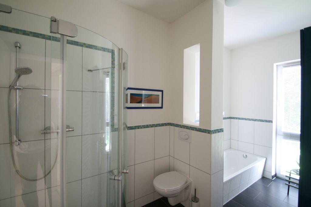 Die Ferienwohnung verfügt über ein modernes Bad mit Wanne und Dusche sowie ein zusätzliches Gäste-Duschbad.