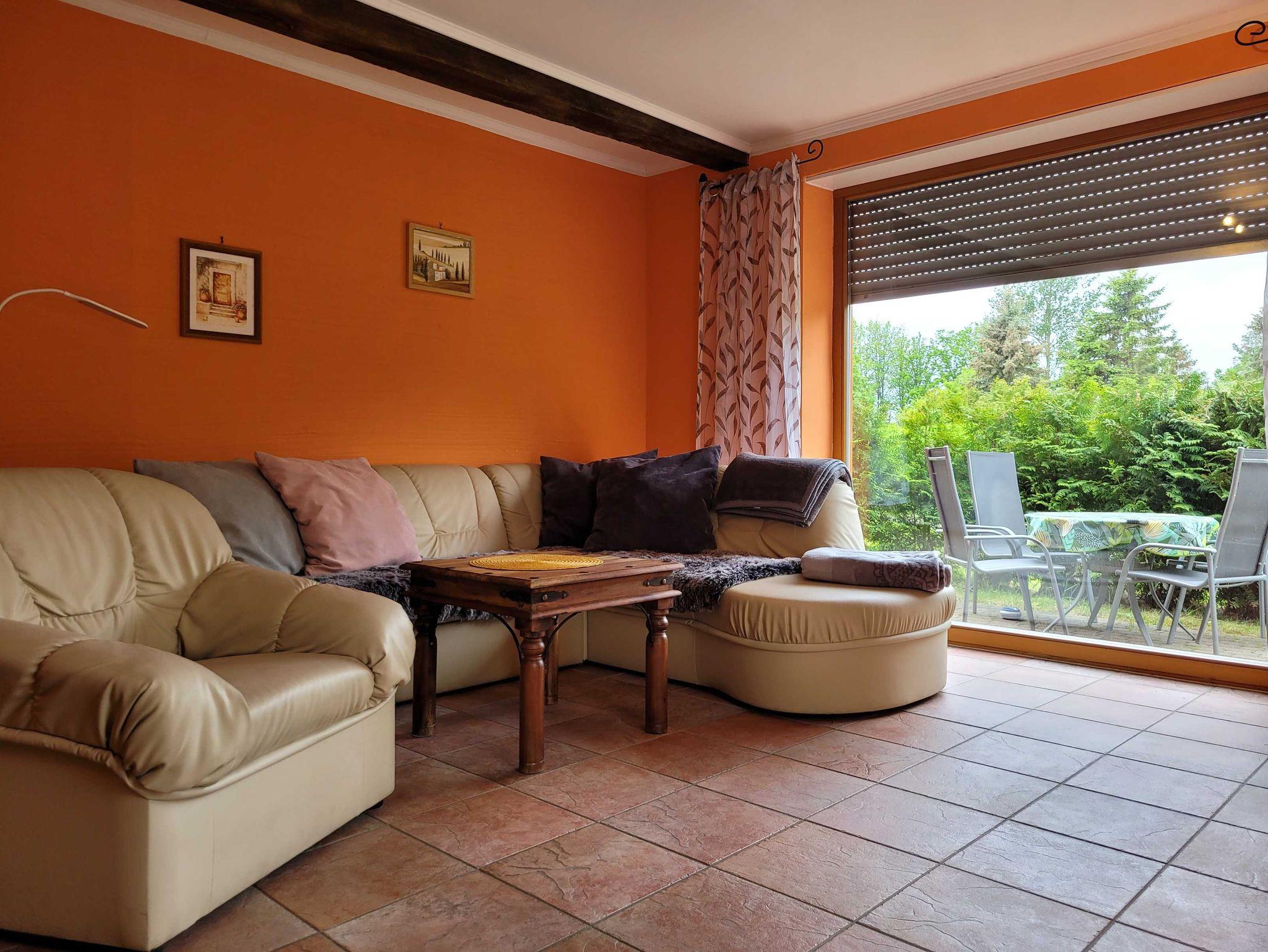 Die Erdgeschoss-Ferienwohnung ist 50 m² groß und und verfügt über ein Wohnzimmer mit einer Schlafcouch für 2 Personen, ein Schlafzimmer mit einem Doppelbett für 2 Personen sowie ein Schlafsofa für eine Person, Bad und Küchenzeile. Die gesamte Wohnung ist gefliest.