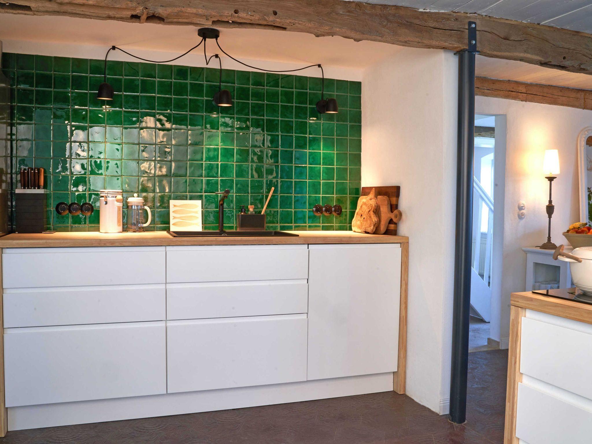 • Wohn- u. Essbereich mit schwenkbarem Wand-TV, Kaminofen und anliegender gut ausgestatteter Küche