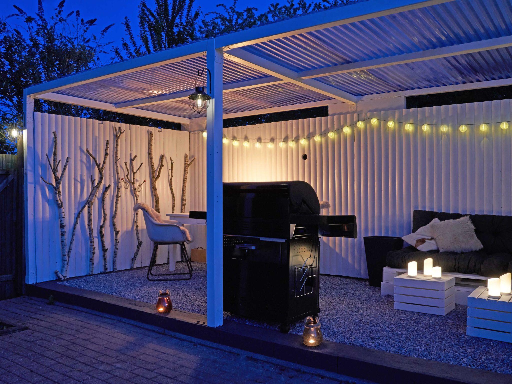 • Überdachte Terrasse mit Loungemöbeln, Essecke und Gasgrill