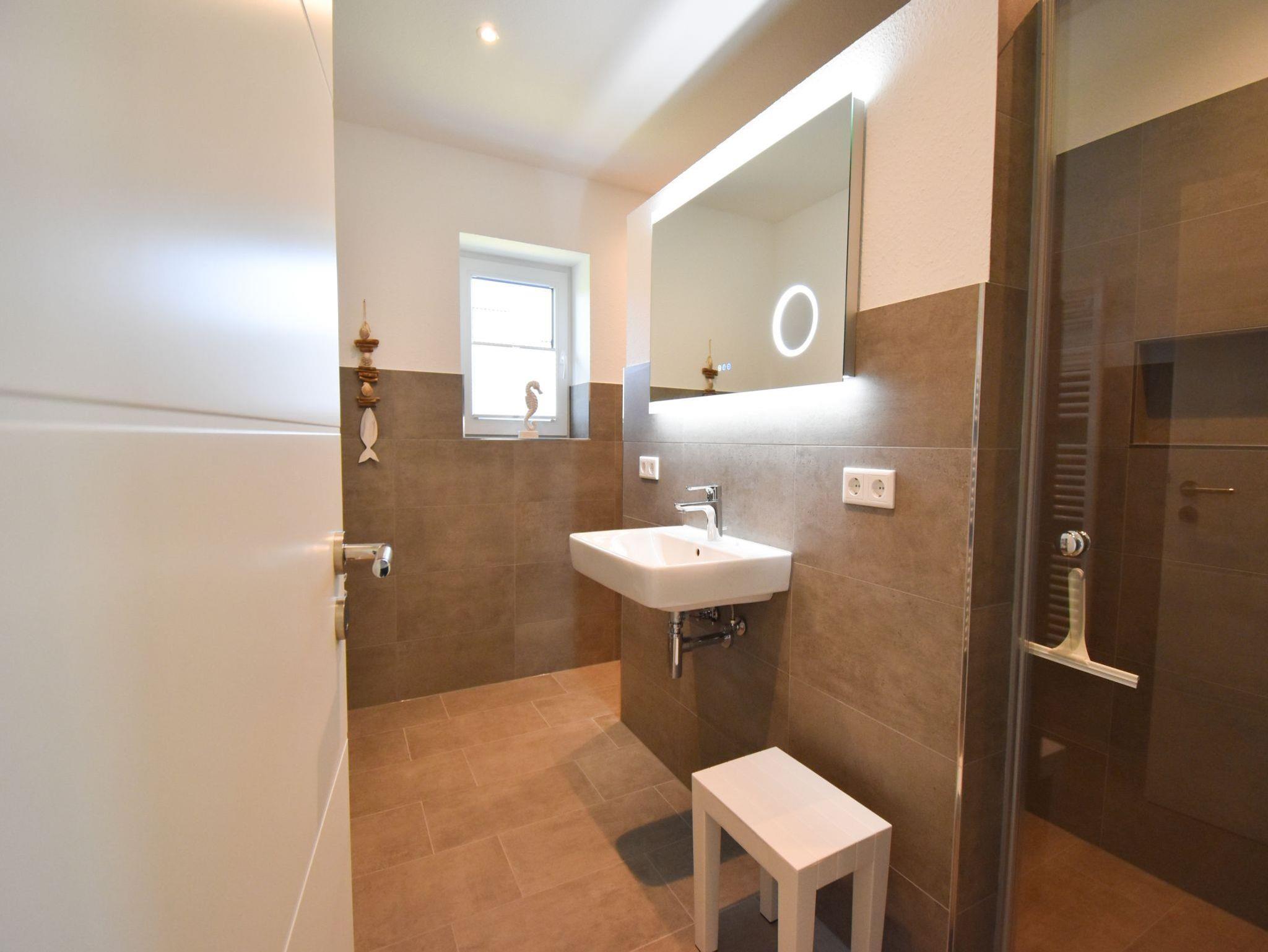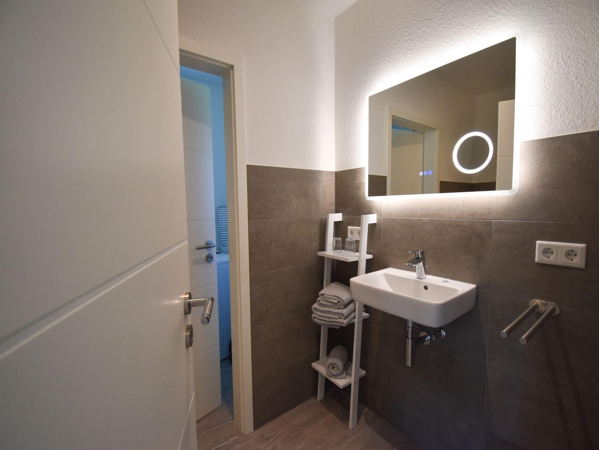 • Badezimmer mit bodengleicher Regendusche, Handtuchheizung und beheizbarem Spiegel mit LED Ambientebeleuchtung; Handtücher zu buchbar