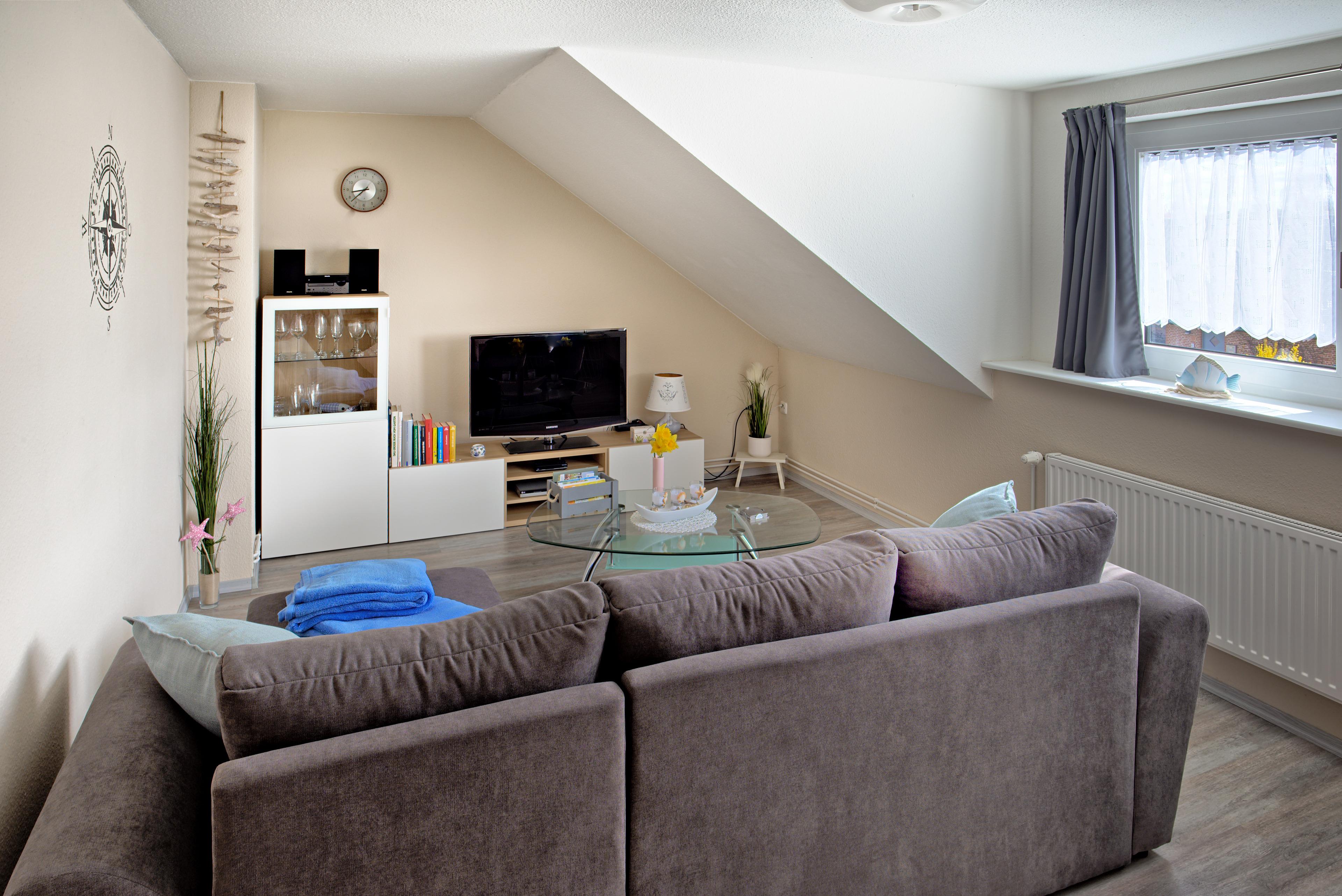 Die im 1. Stock gelegene, liebevoll eingerichtete Wohnung bietet auf 55 qm ein behagliches Wohn- Esszimmer, ein separates Schlafzimmer, eine separate Küche, ein Bad mit Dusche und WC und einen kleinen, nach Süd-/Ost ausgerichteten Balkon. Zusätzlich zur gemütlichen Sitzgarnitur gibt es noch einen elektrisch verstellbaren Sessel, der wunderbar zum Lesen oder relaxen einlädt. Der Essplatz bietet mit einem ausziehbaren Tisch und vier Stühlen hinreichend Platz. Die sehr gut ausgestattete Küche lässt kaum Wünsche offen. Im Schlafzimmer sorgt ein Kleiderschrank und eine Kommode für Ordnung und im 1,80m x 2,00 m großen Bett mit Bettwäsche in Übergröße lässt es sich herrlich träumen. Das helle Tageslichtbad ist ausgestattet mit Dusche, WC und Waschbecken.