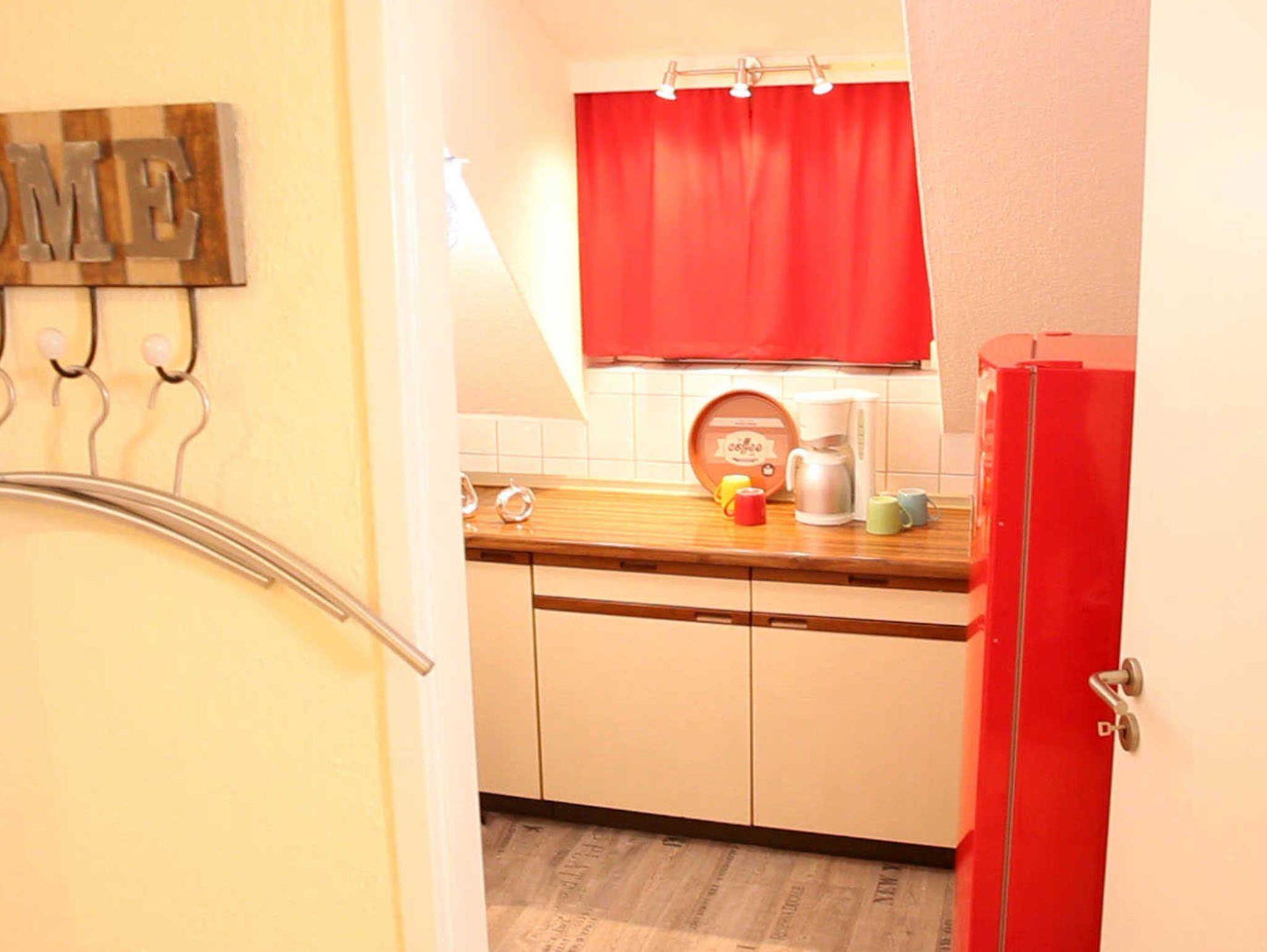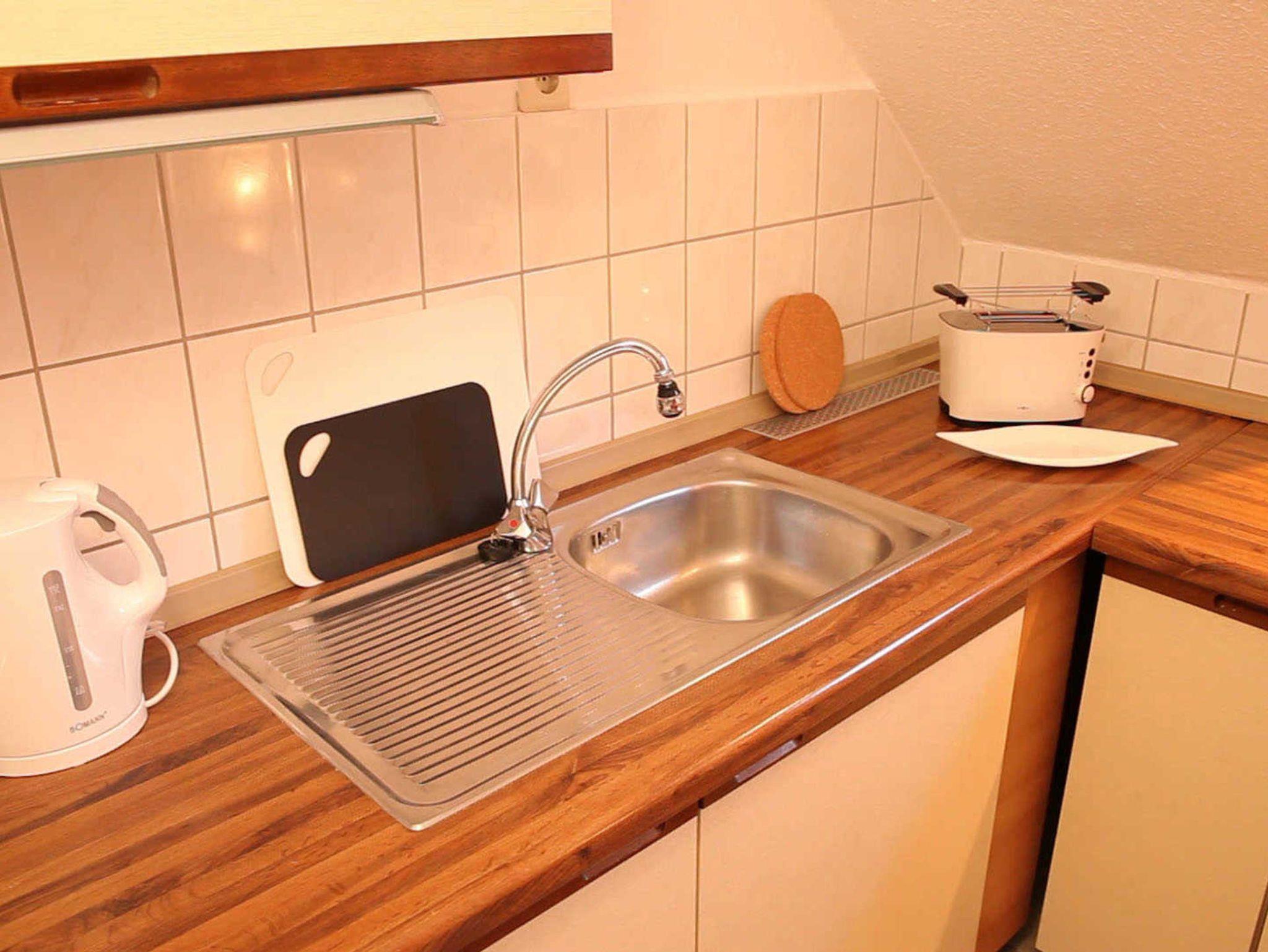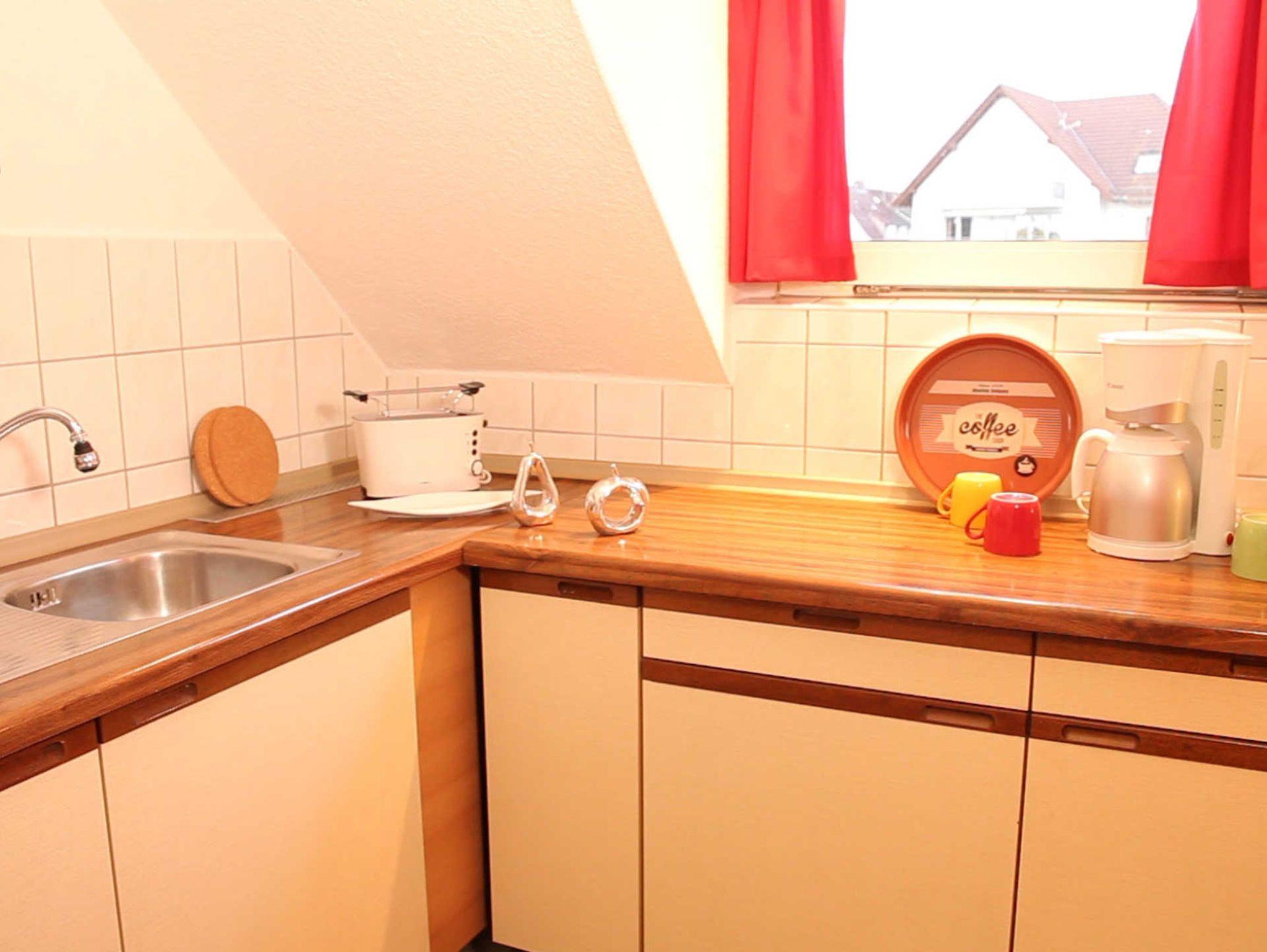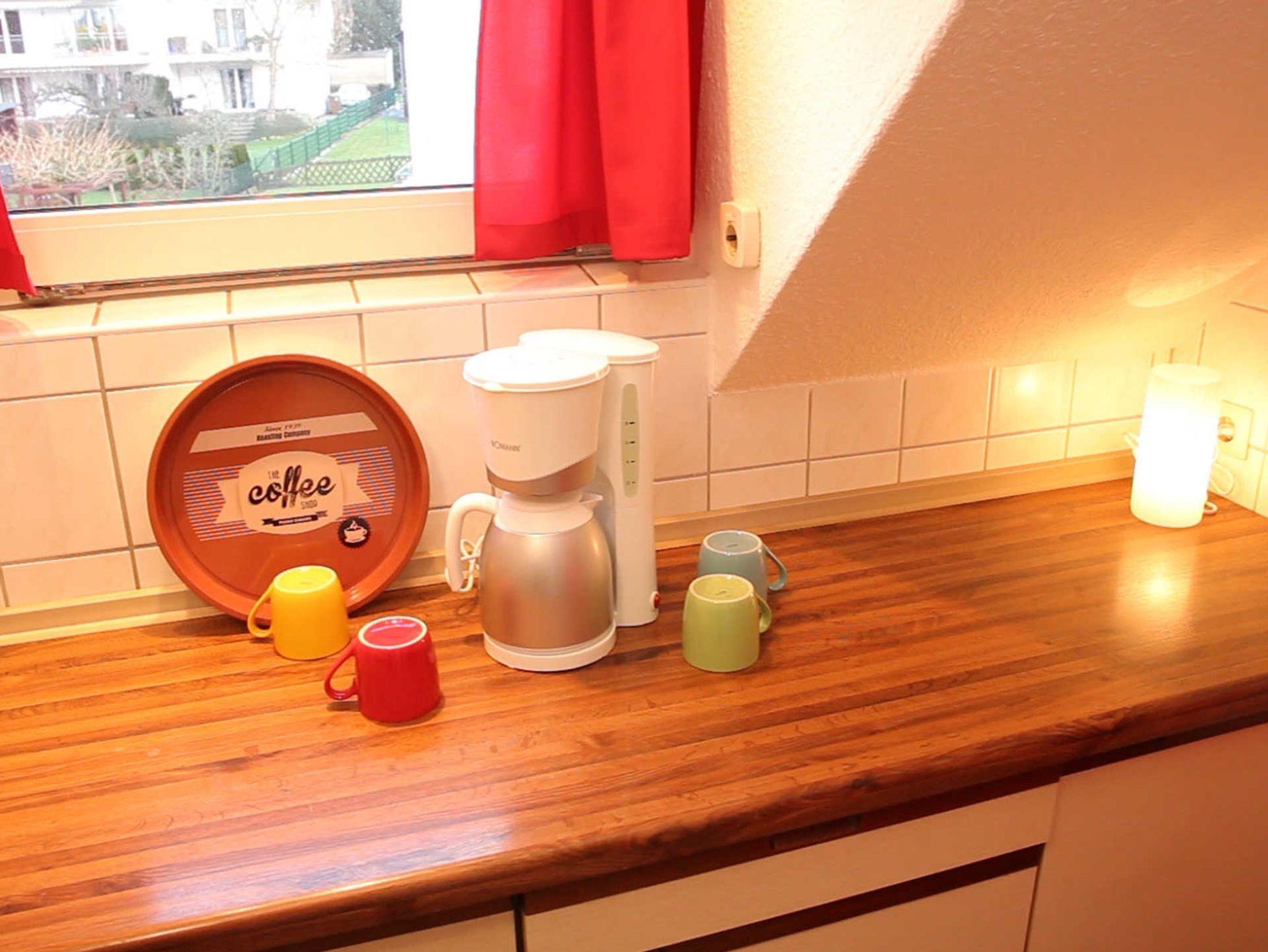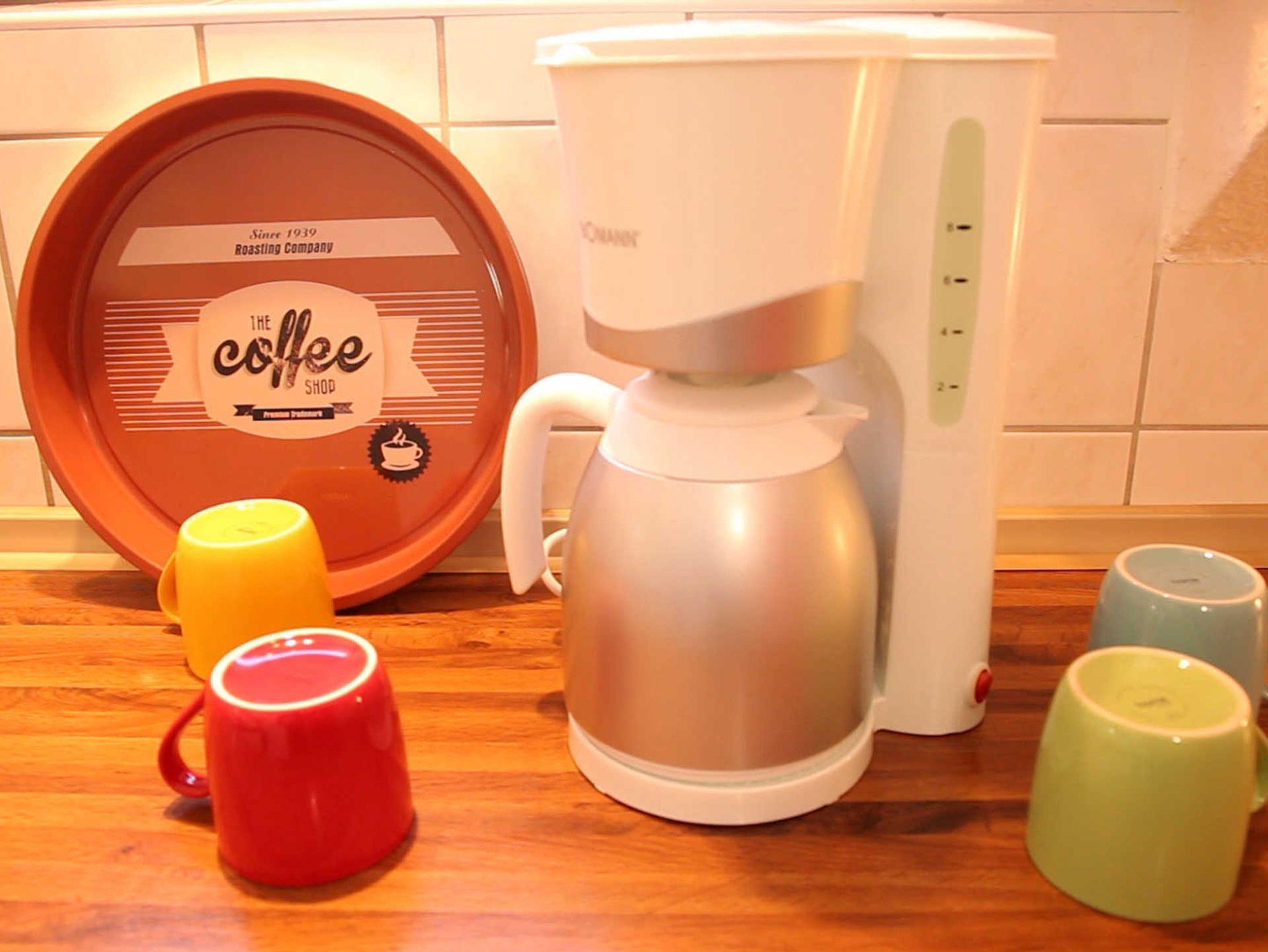 Die separate Küche ist u. a. mit einem Backofen ausgestattet. Eine Filterkaffeemaschine, Toaster, Wasserkochen etc. sind ebenfalls vorhanden.