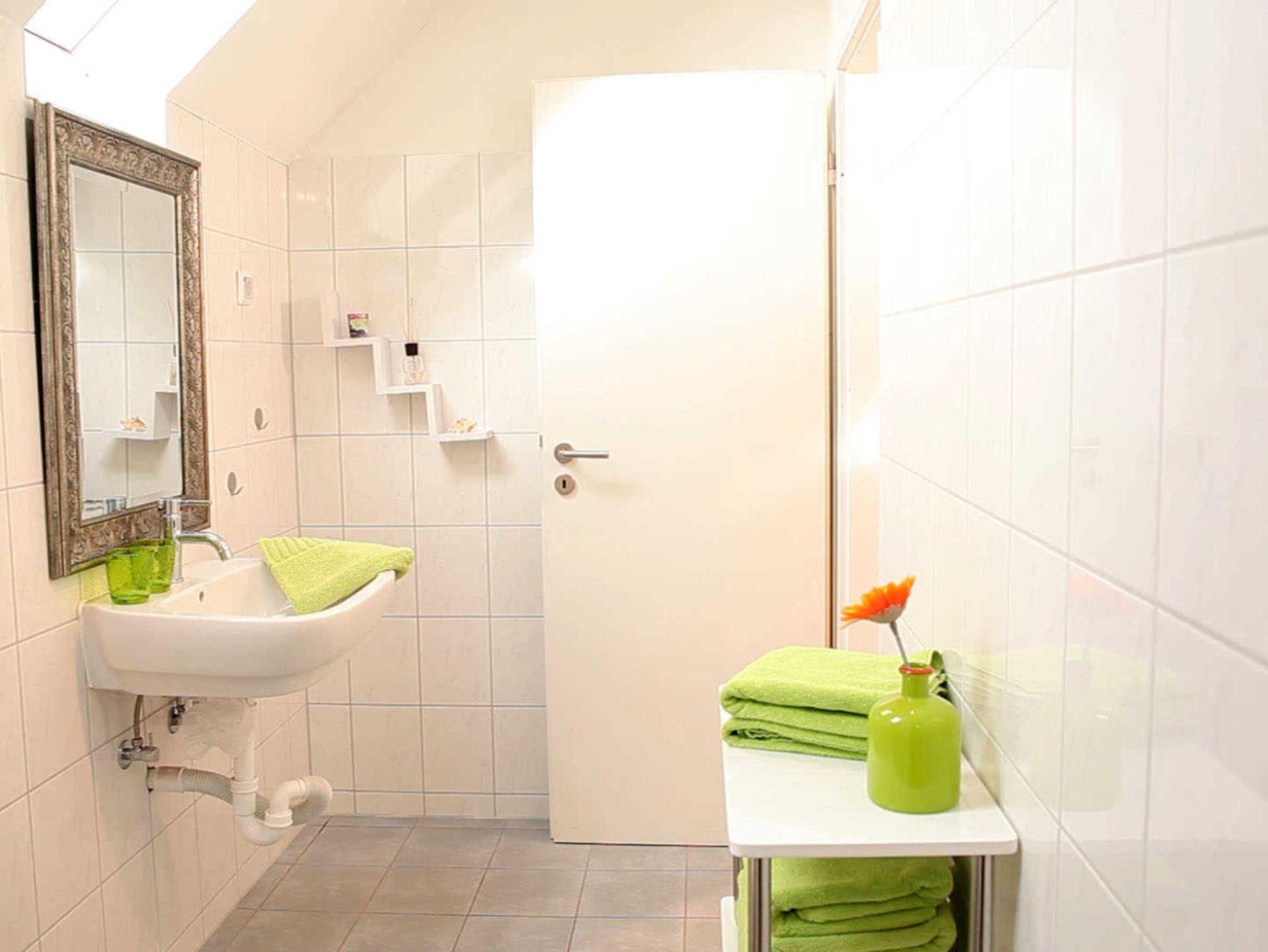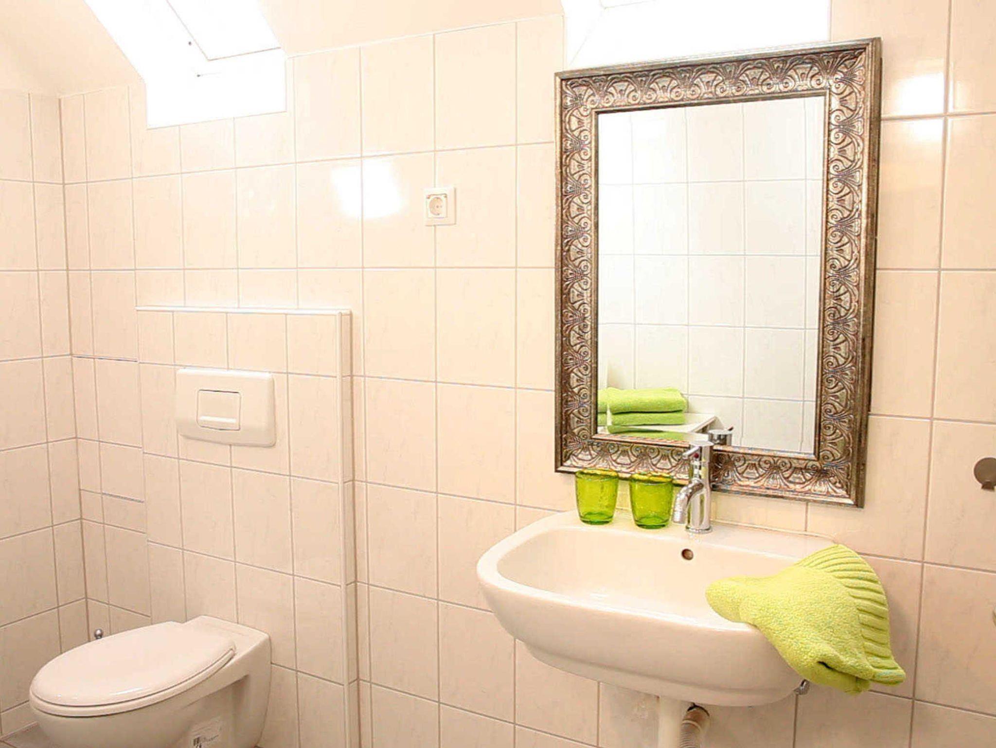Im Bad befinden sich Dusche, WC und Waschbecken.