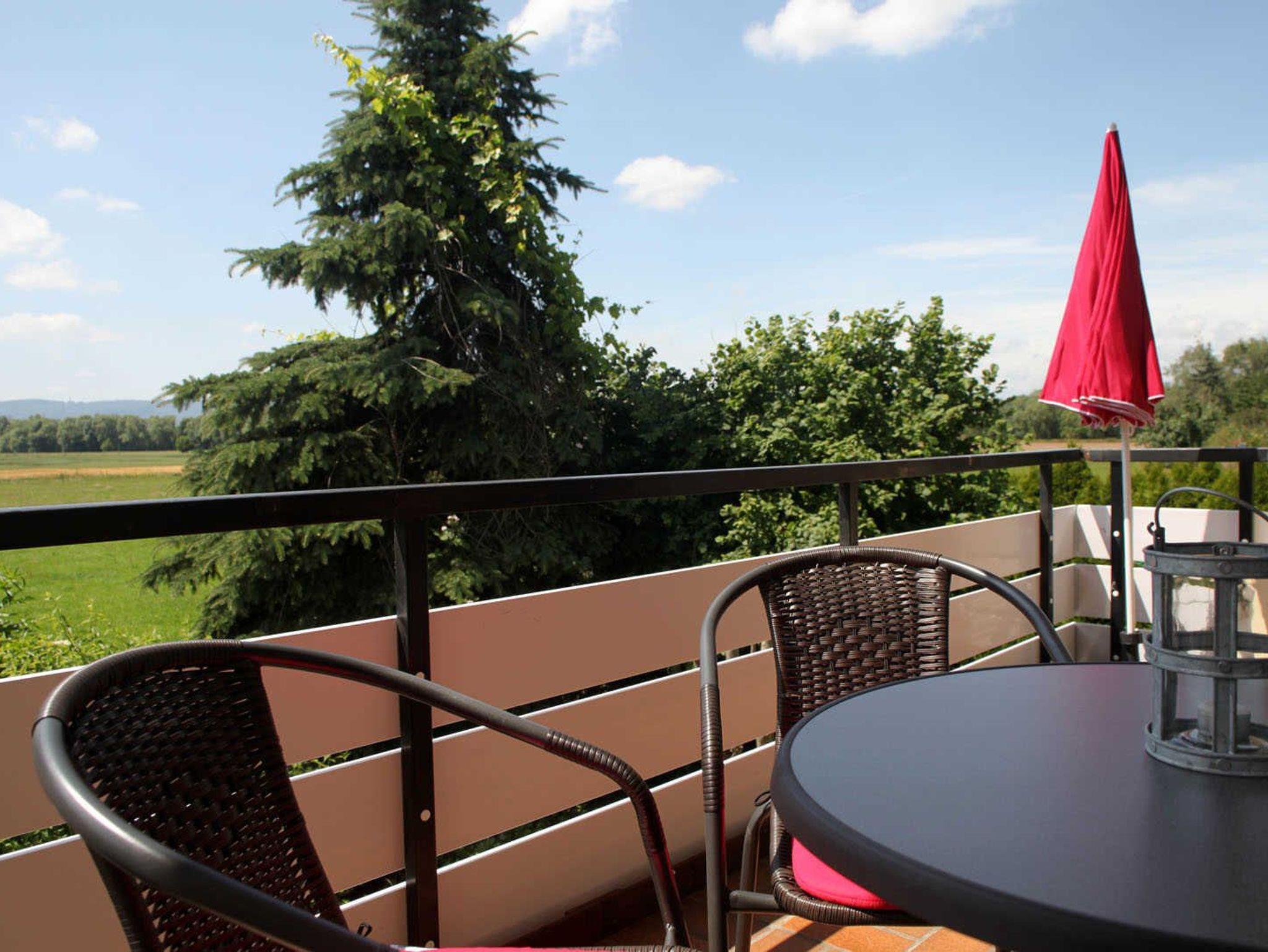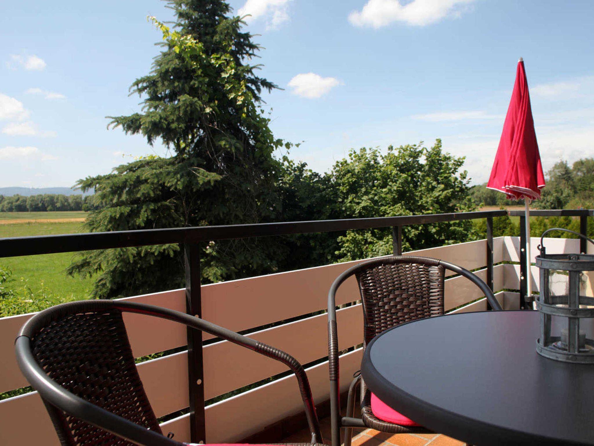 Der große Süd-Balkon besticht durch seinen Blick auf die weitläufige Fulda-Aue sowie auf den Herkules (Unesco-Weltkulturerbe). Mit Tisch und Stühlen lädt er zum Verweilen in der Sonne ein.