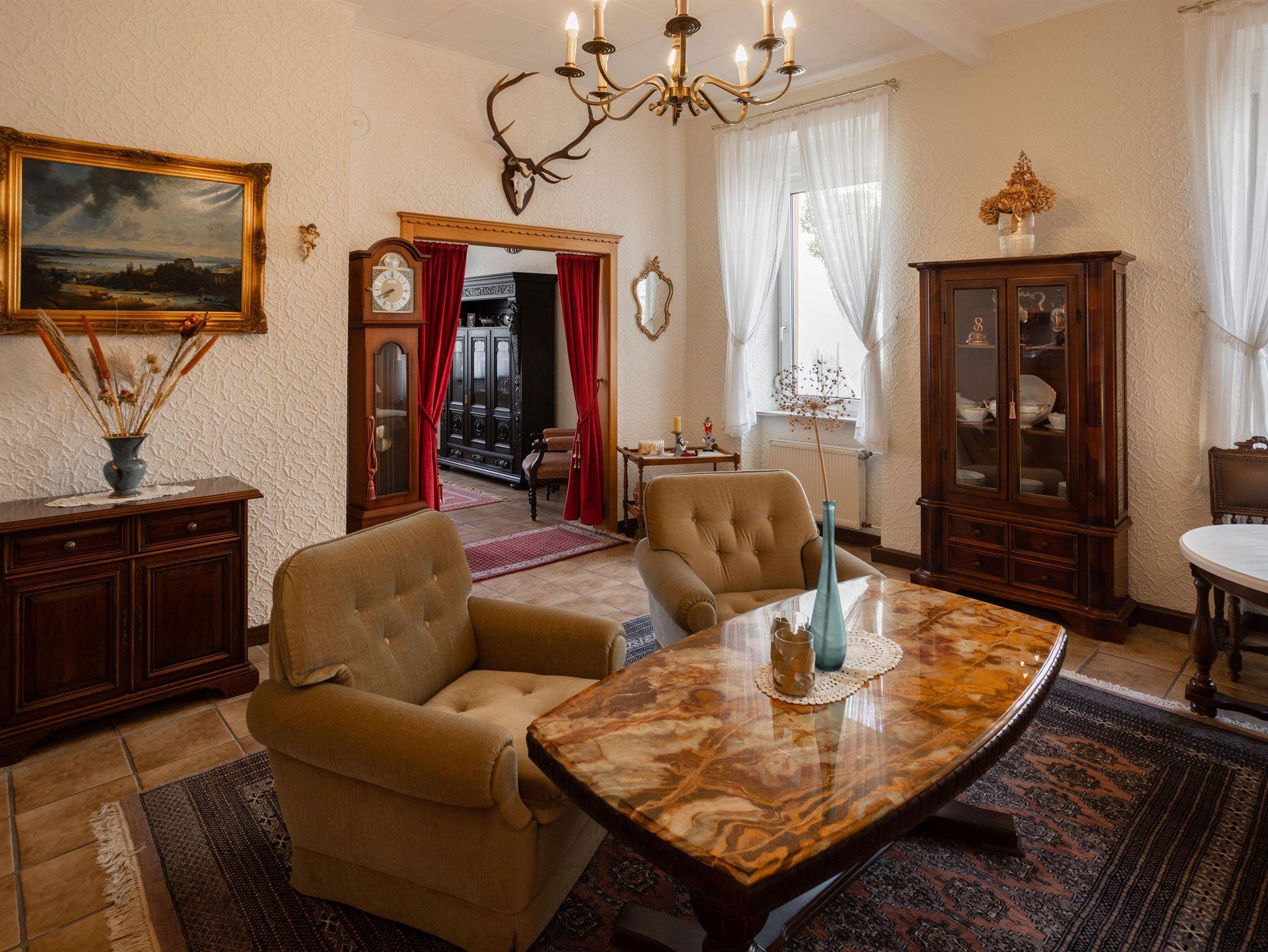Das Esszimmer besticht durch seinen traditionellen Charakter mit antikem Mobiliar, Kronleuchter und dekorativen Sammlerobjekten. Der perfekte Ort für ausgedehnte Mahlzeiten oder gesellige Abende mit einem Glas Moselwein.