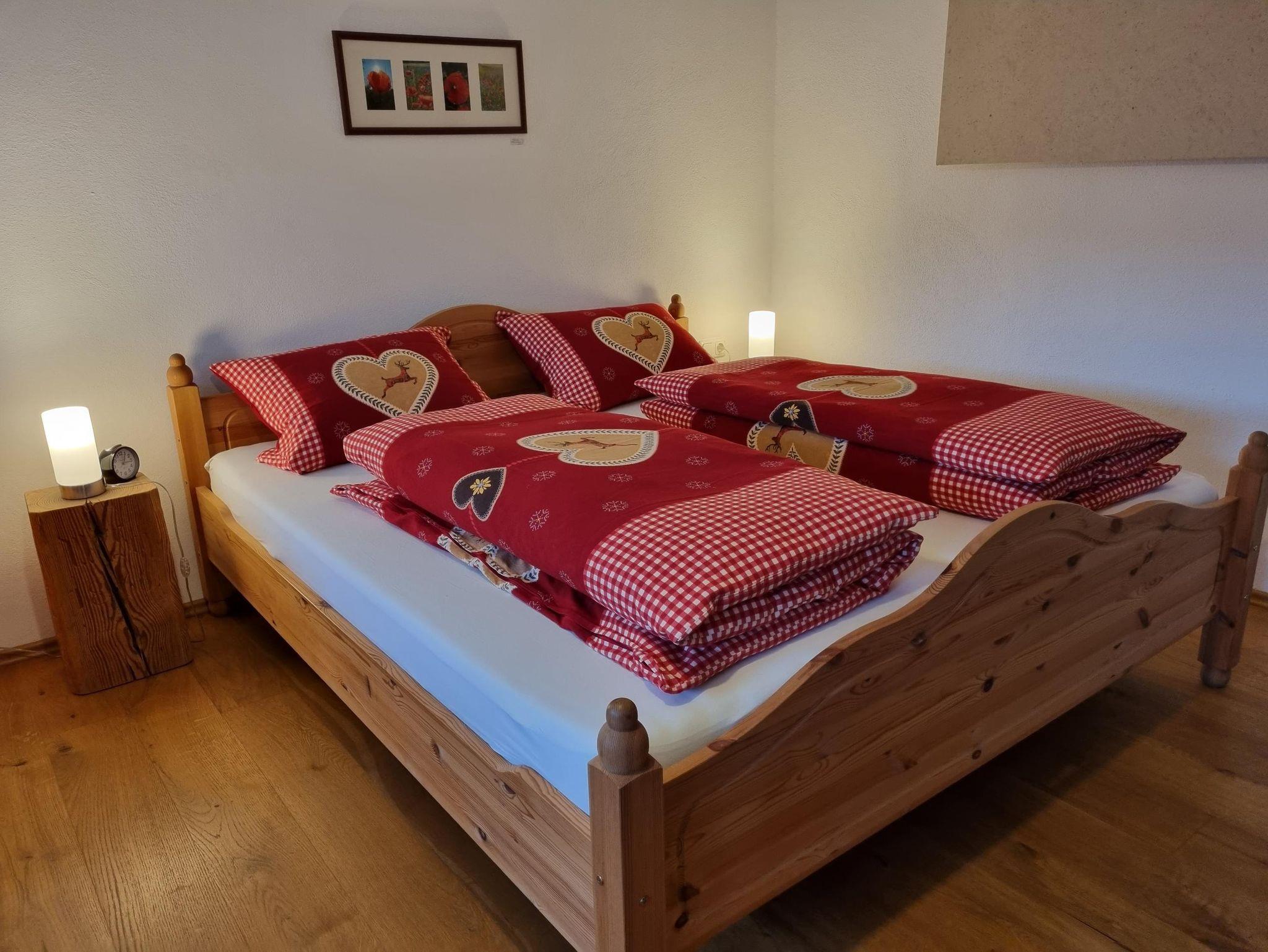 Die Ferienwohnung liegt abgeschlossen im Erdgeschoss des Bauernhauses mit eigenem Eingang. Sie ist mit 80 qm sehr großzügig bemessen - hier müssen Sie nicht auf beengtem Raum aufeinanderhocken. Eine geräumige Wohnküche, ein großer Wohn-/Schlafraum und ein kleineres Schlafzimmer bieten Platz für 4 Erwachsene. Die moderne, hochwertige Ausstattung wurde mit alten Bauernmöbeln aus dem Bestand kombiniert. Die wuchtigen Balken der abgerissenen Scheune dienen als Nachttische und ein abgeschliffenes Nachtkästchen als Badmöbel. Traditionelle Gebrauchsgegenstände aus alten Zeiten sind tolle Dekoobjekte. Die Familienfotogalerie in der Küche vermittelt eine Atmosphäre wie anno dazumal - sie gehören quasi zur Familie.