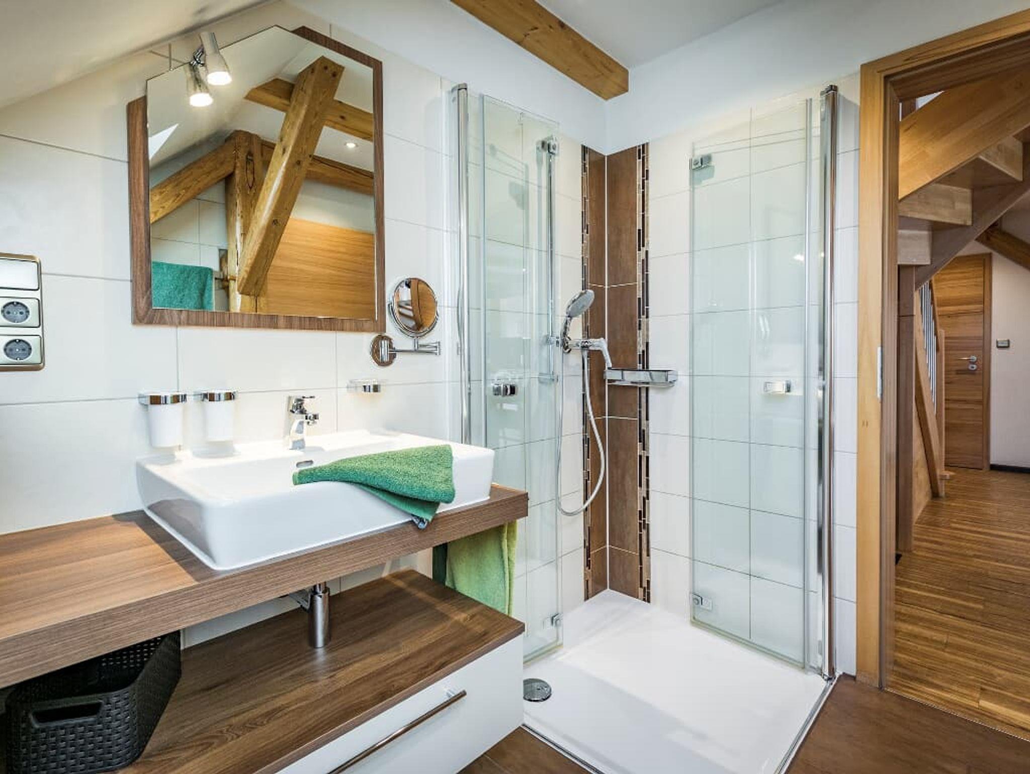 Im Bad befindet sich eine Dusche, ein Waschbecken, ein WC und ein Handtuchheizkörper.