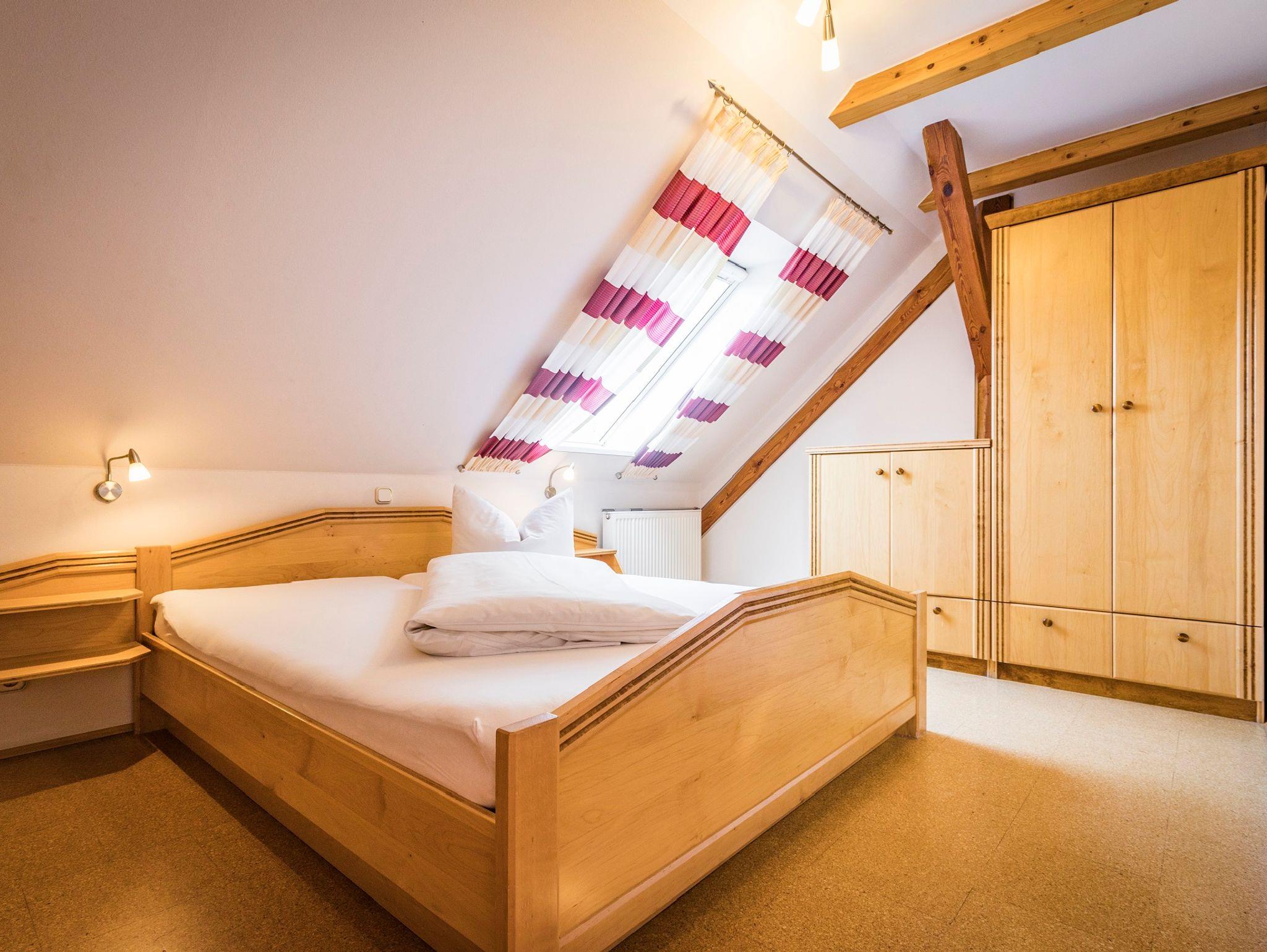 Die Wohnung befindet sich im Dachgeschoss und bietet 54qm. Die beiden Schlafzimmer sind je mit einem Doppelbett (180x200cm) ausgestattet. Auf Anfrage ist eine Aufbettung für weitere Personen möglich. Selbstverständlich ist die Küchenzeile komplett ausgestattet: Kühlschrank, Backofen, Ceranfeld, Geschirrspülmaschine, Wasserkocher, Toaster, Kaffeemaschine und sämtliches Kochgeschirr sind vorhanden.