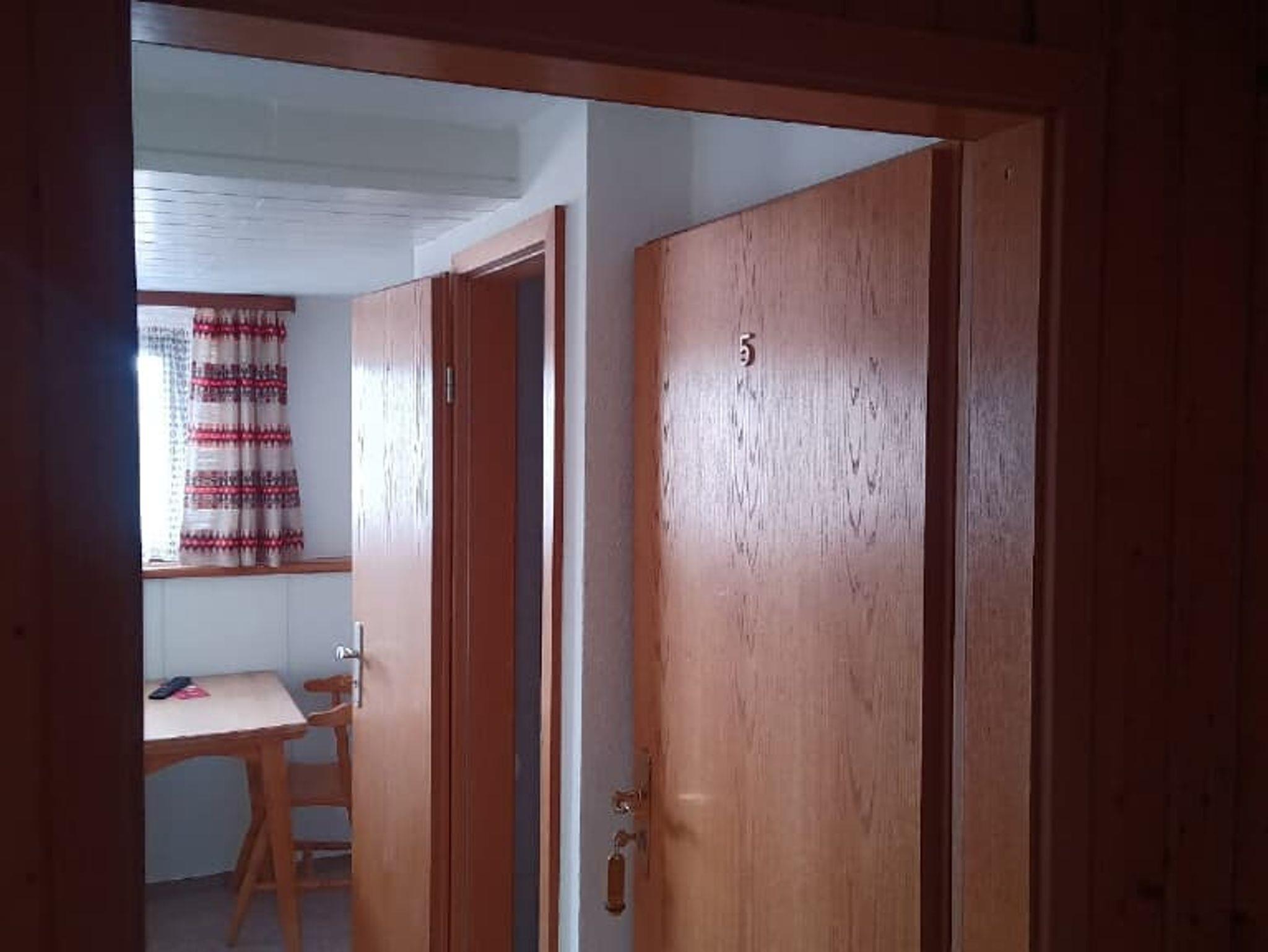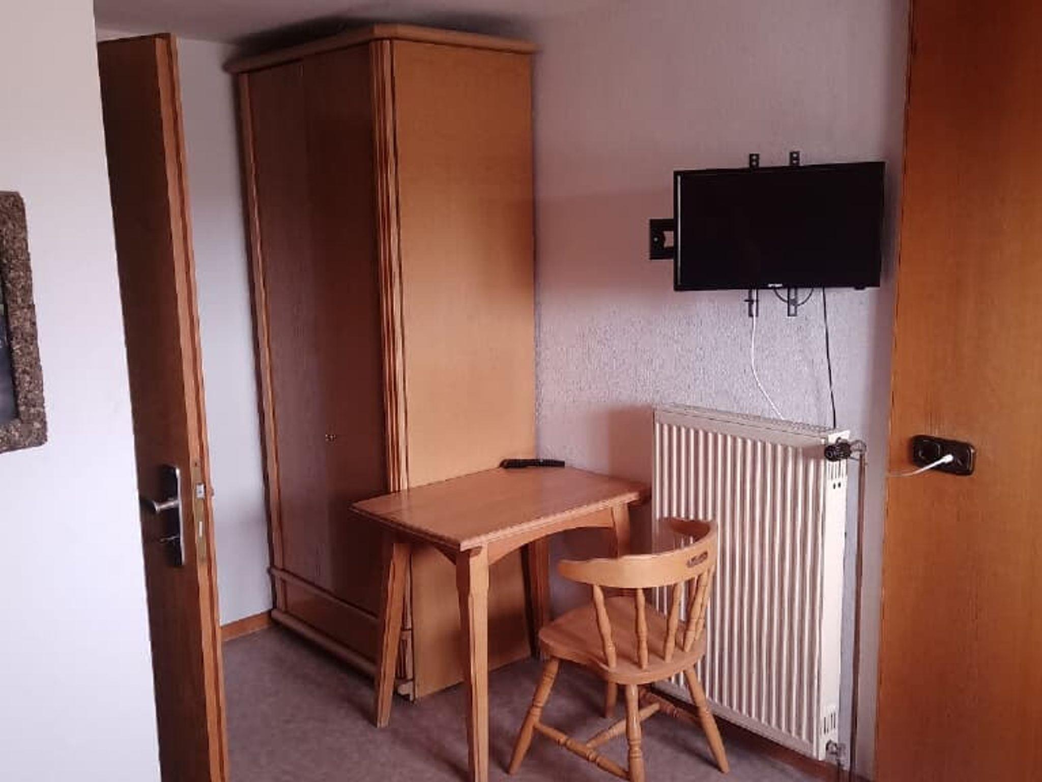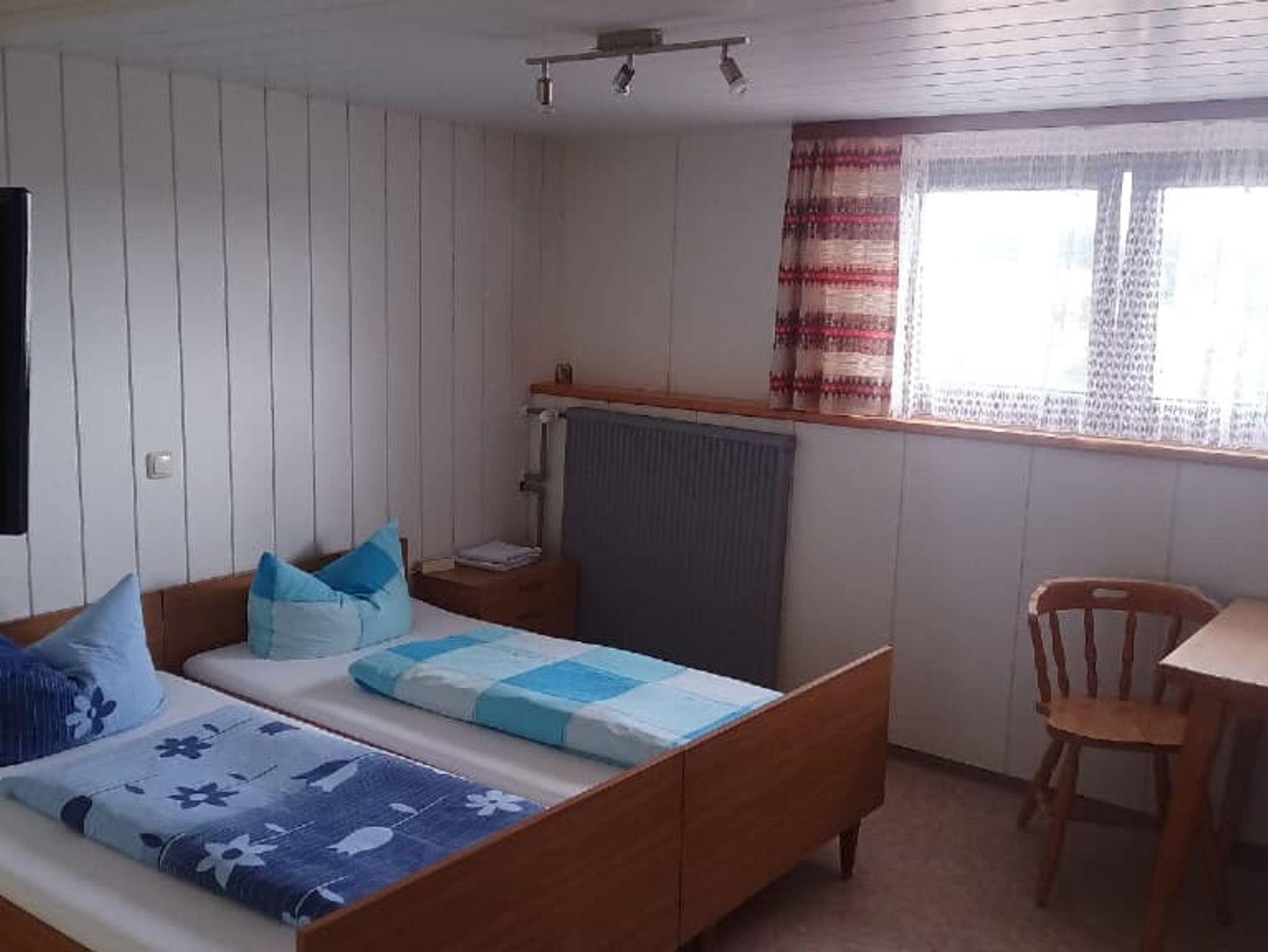 Einfaches Zweibettzimmer mit Tisch. Das Badezimmer verfügt über eine Dusche und ein WC.