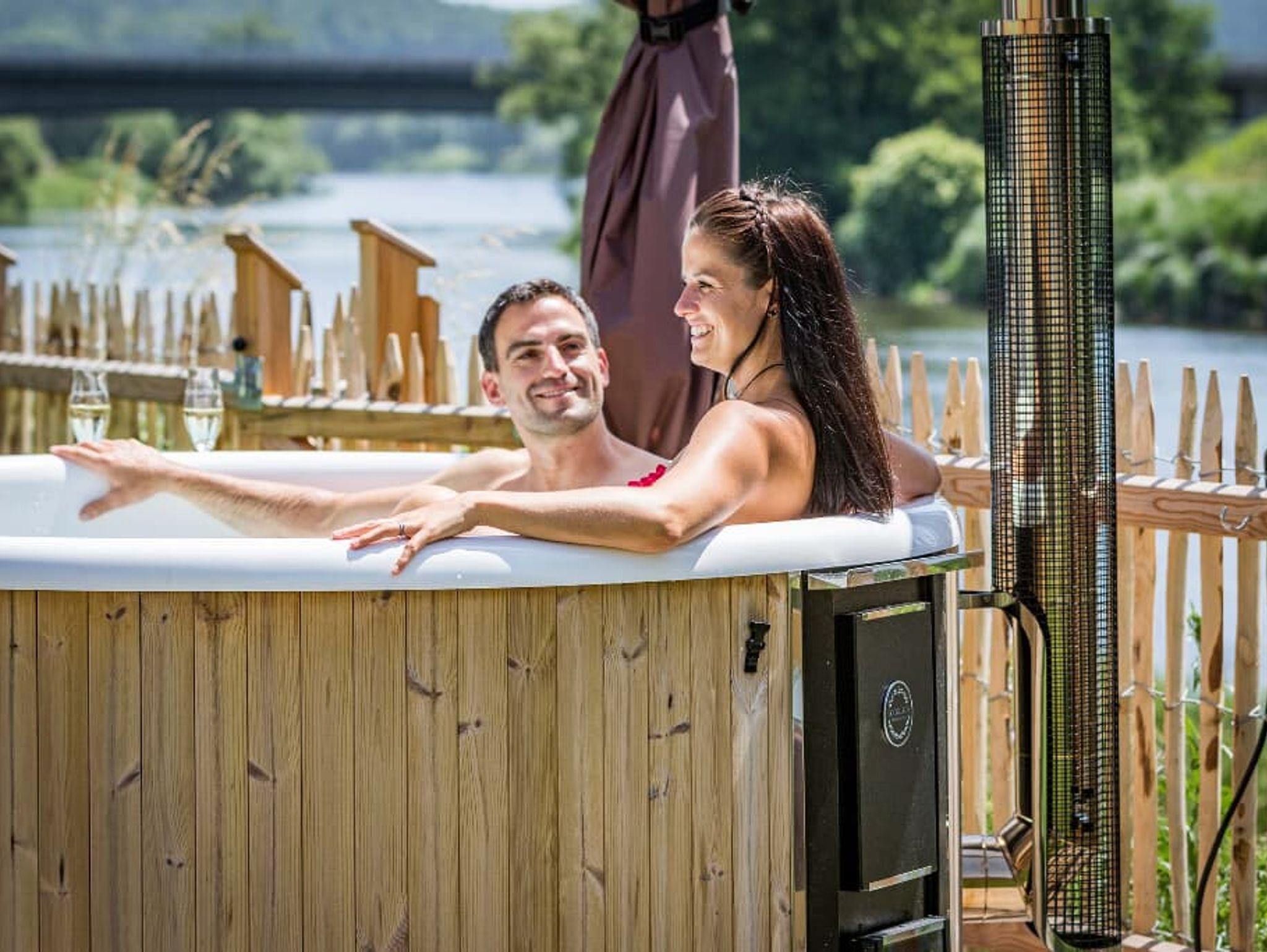 Übernachten Sie bei uns in Holzferienhäusern am Flussufer mit Kamin, großer Terrasse, Balkon, kleinem eingezäunten Garten und eigenem Hot Tub oder in einer von sieben gemütlichen Ferienwohnungen mit romantischem Kreuzgewölbe.