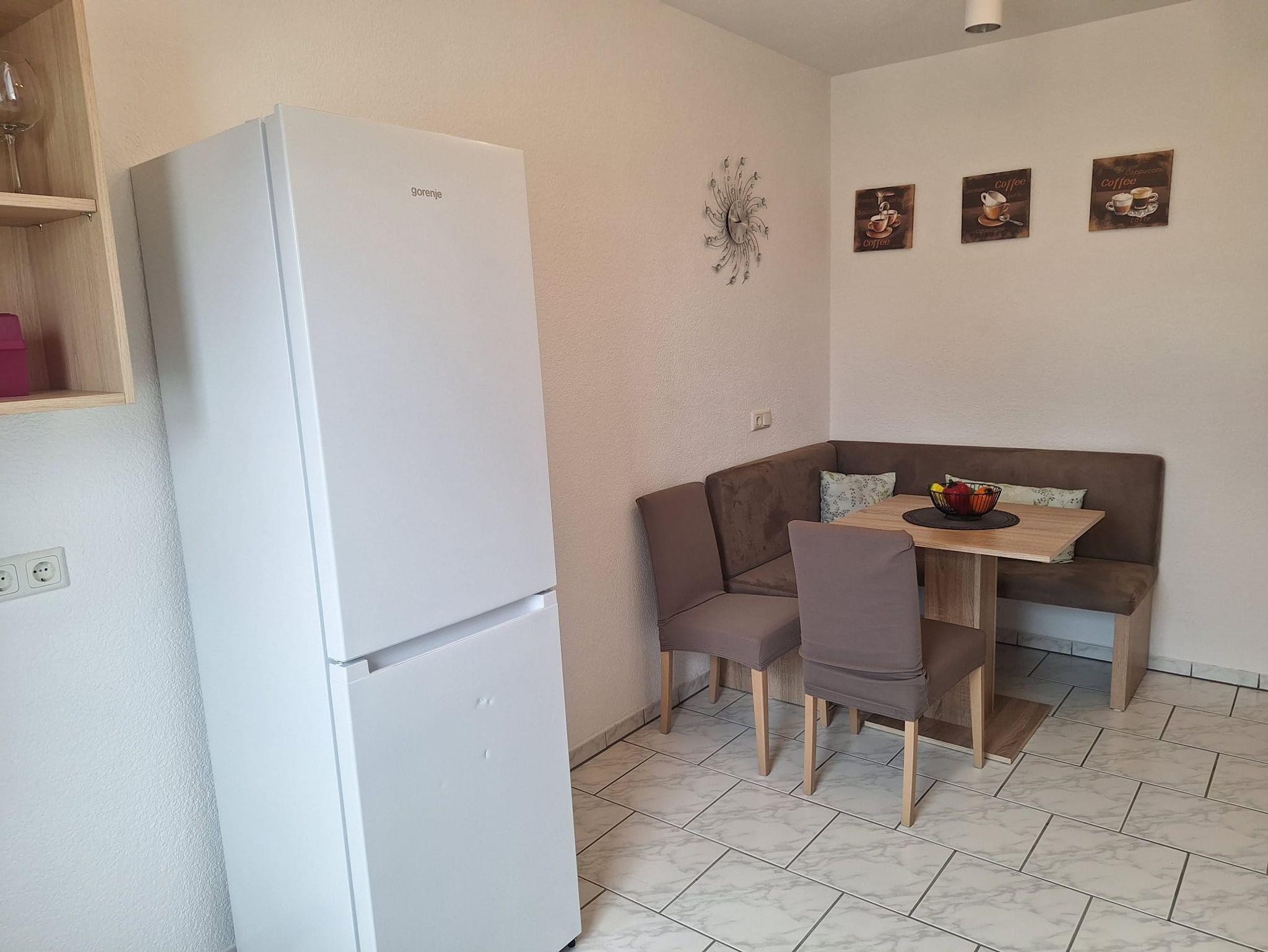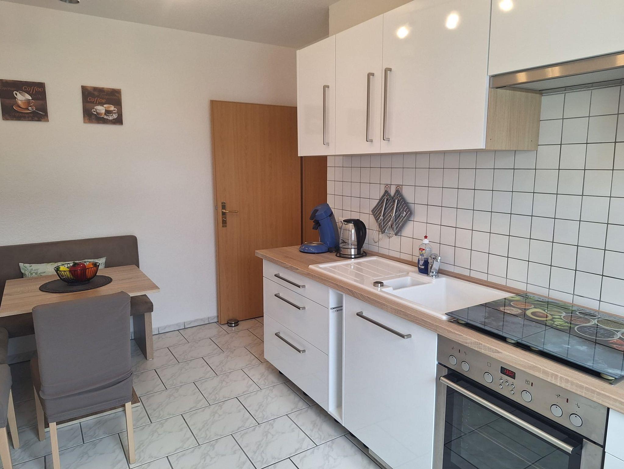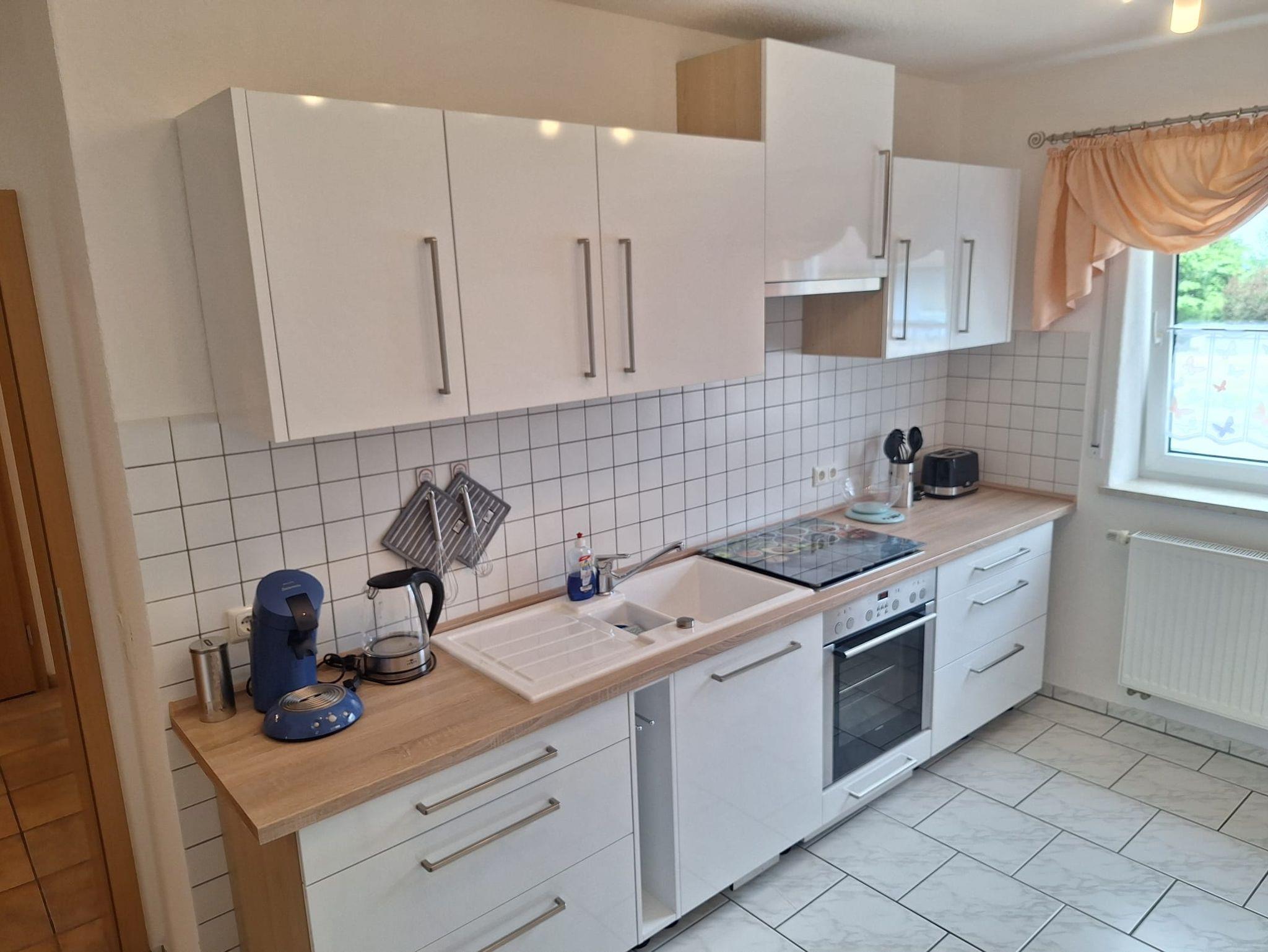 Die moderne Küchenzeile ist vollständig eingerichtet und verfügt über Herd, Backofen, Kühlschrank, Kaffeemaschine und alle wichtigen Küchenutensilien – ideal zur Selbstverpflegung.