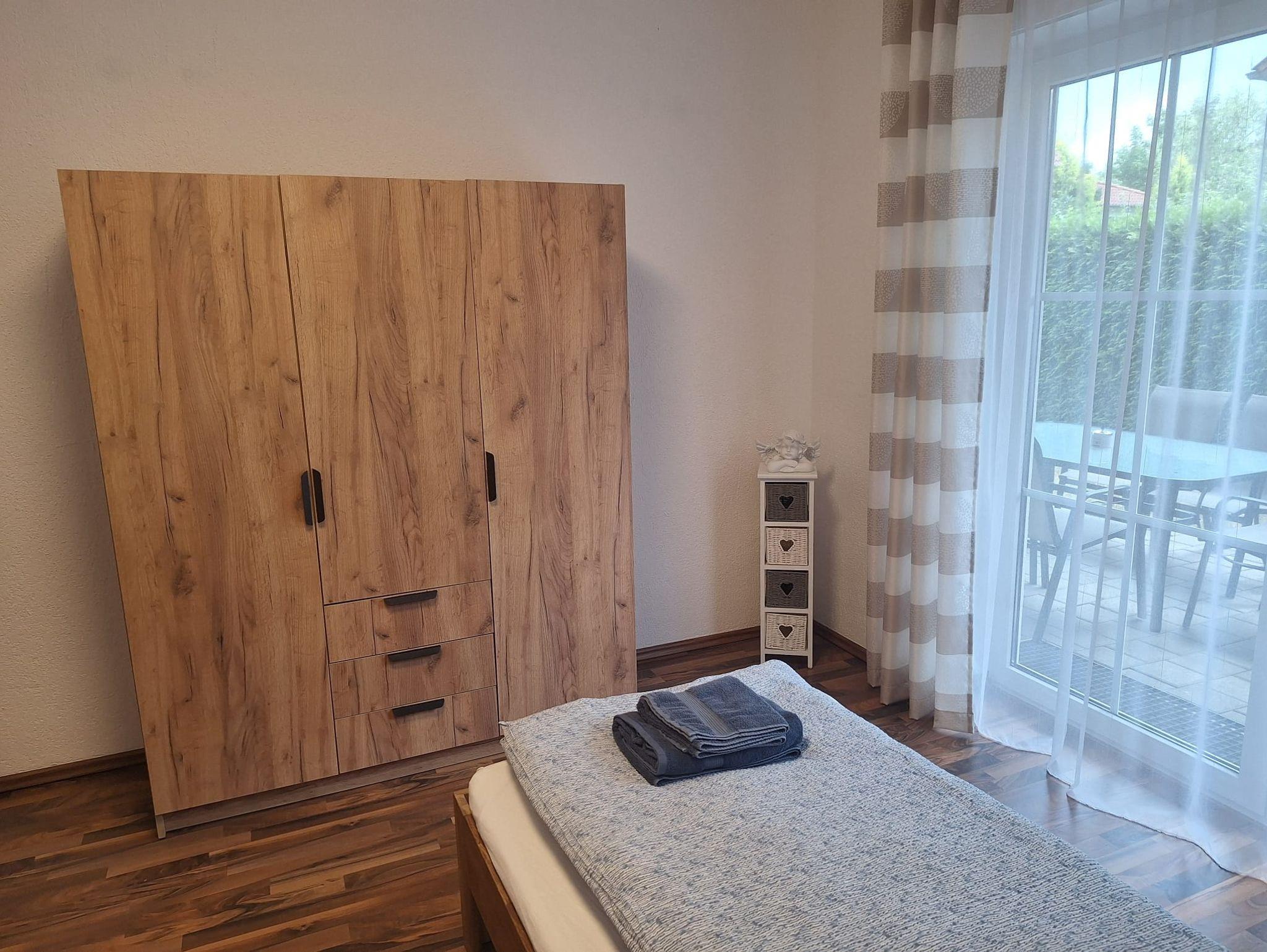 Im Schlafzimmer erwartet Sie ein komfortables Doppelbett, das bei Bedarf in zwei Einzelbetten getrennt werden kann – ideal für Paare oder Kollegen auf Geschäftsreise.