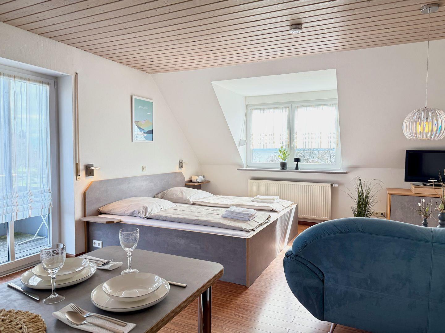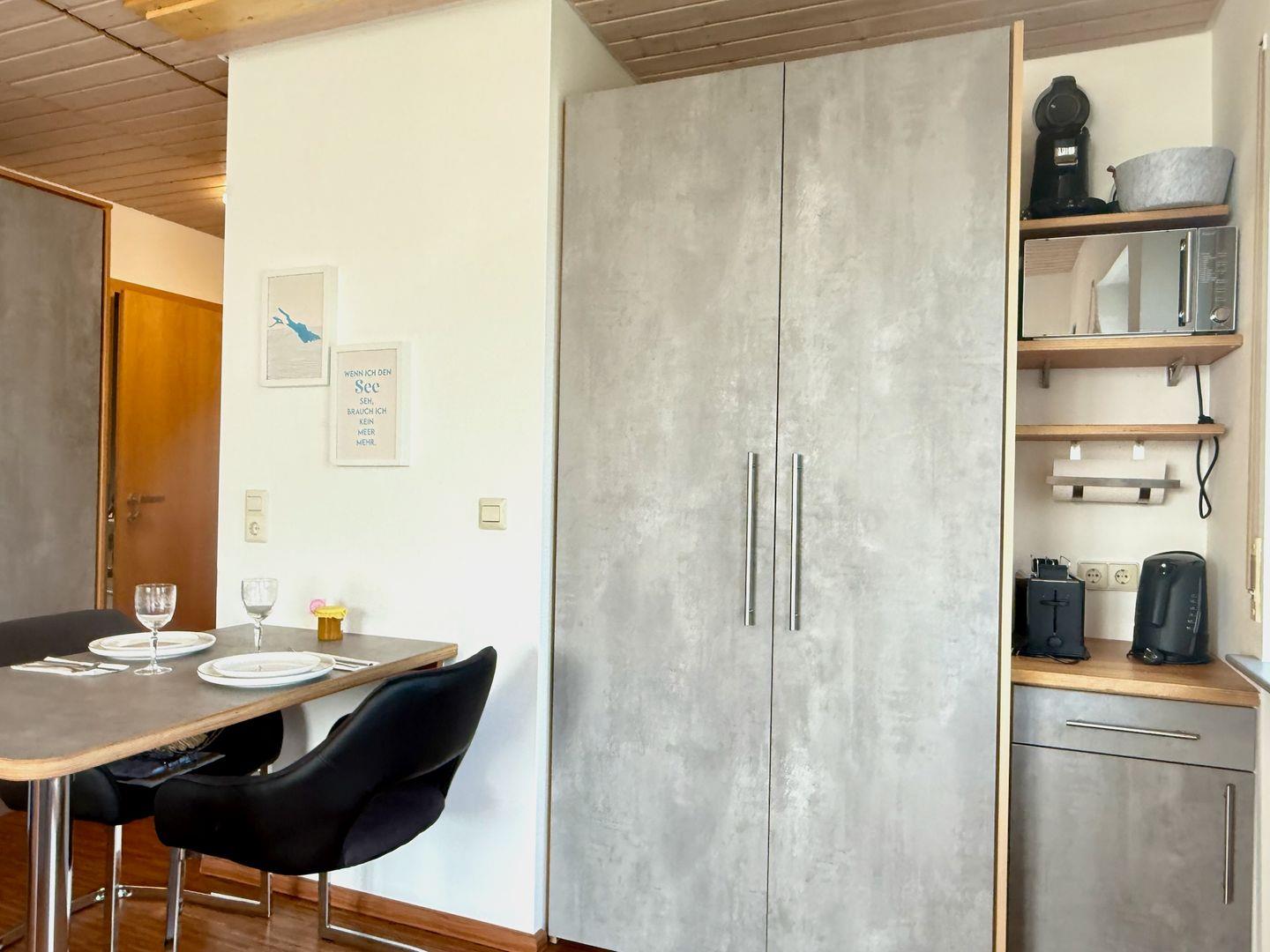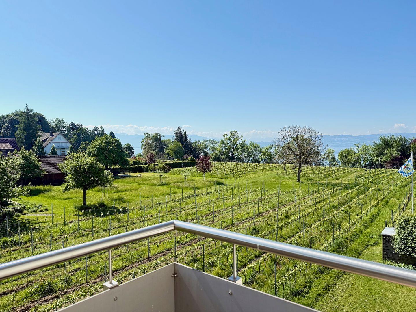 Ein besonderes Highlight ist der kleine, gemütliche Balkon. Ausgestattet mit zwei Stühlen, einem Tisch, einem Sonnenschirm und einem praktischen Wäscheständer, lädt er dazu ein, die malerische Aussicht auf den Bodensee und die umliegenden Berge zu genießen – ob bei einem morgendlichen Kaffee oder einem entspannten Abend.