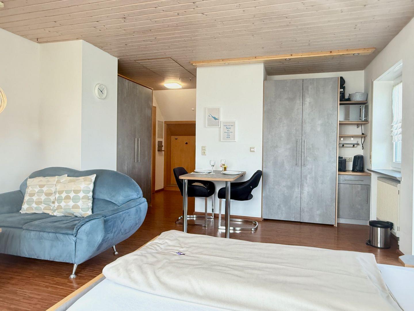 Der kombinierte Wohn- und Schlafraum ist komfortabel und praktisch gestaltet. Hier erwartet Sie ein bequemes Doppelbett, ein geräumiger Kleiderschrank, eine gemütliche Sitzgelegenheit mit Couch und Tisch sowie ein Farb-Sat-TV und ein anwählbares Telefon. Die integrierte Pantryküche ist mit einem 2-Plattenherd, Kühlschrank, Kaffeemaschine (Pads), Wasserkocher, Toaster, Eierkocher und allem nötigen Kochzubehör ausgestattet – ideal für kleinere Mahlzeiten oder ein Frühstück mit Aussicht.