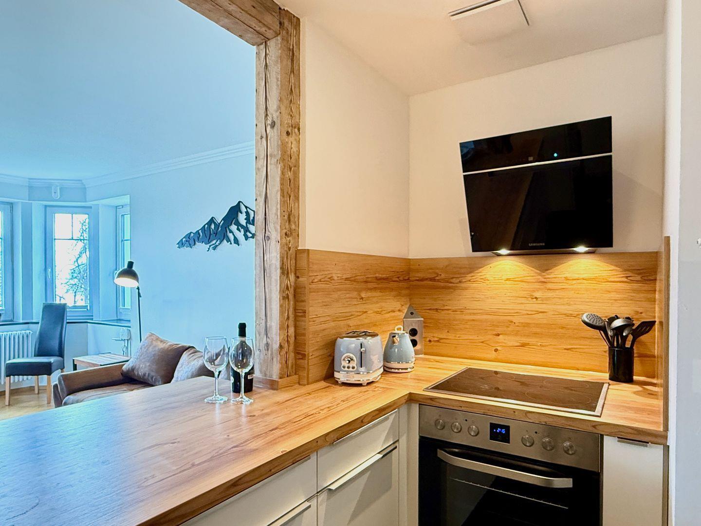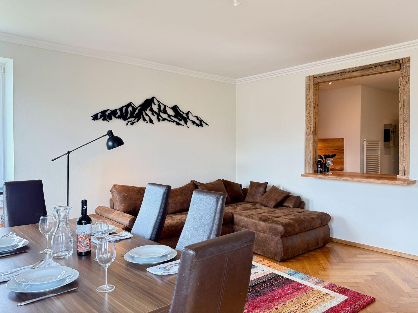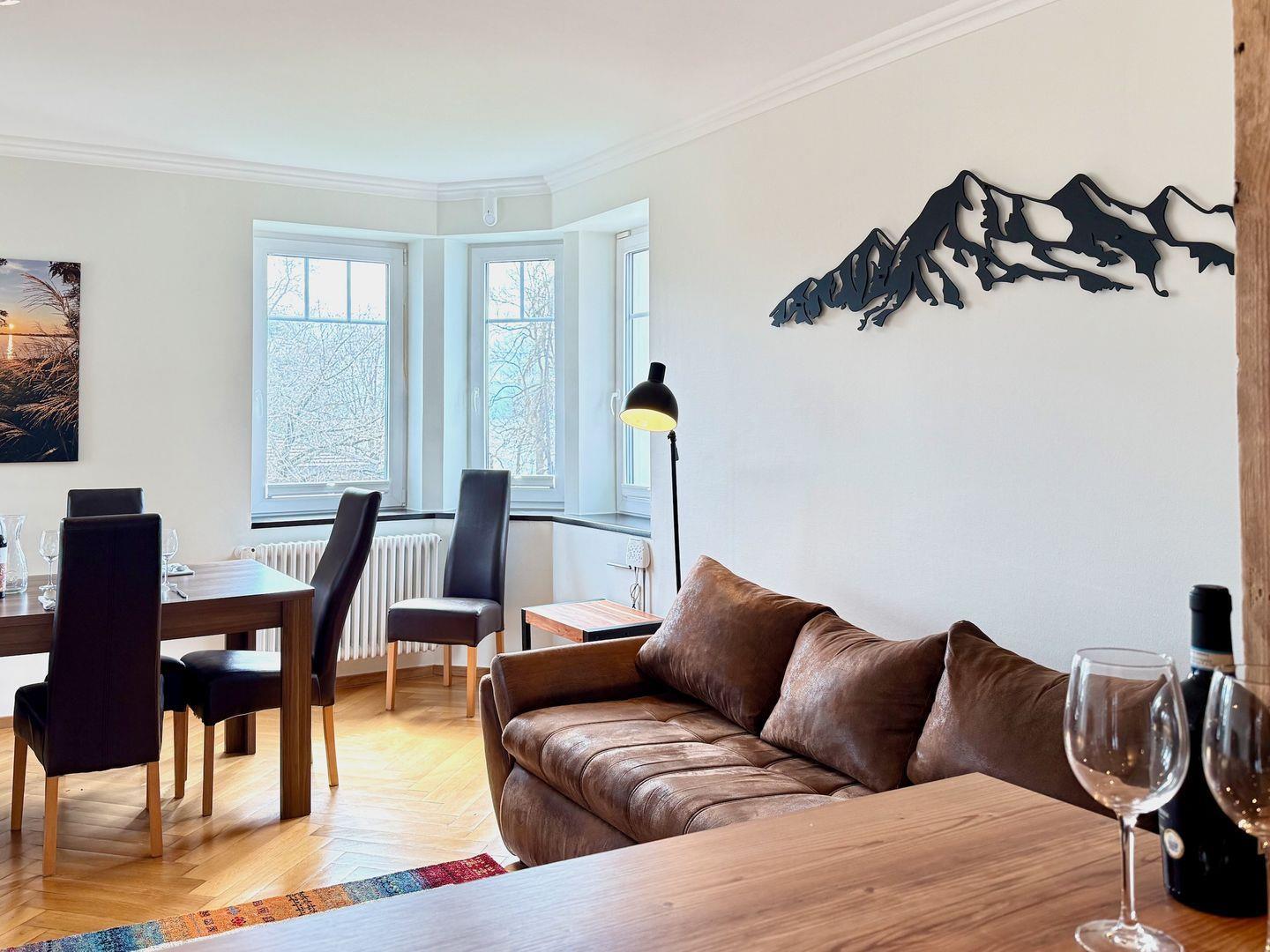 Ihr vollausgestattetes Domizil im 2. OG der Villa ist mit dem Aufzug erreichbar und auf dem neuesten technischen Stand. Eine neue Küche mit hochwertigen Geräten und einer praktischen Durchreiche zum Essbereich sorgt für kulinarischen Komfort. Der Ess-/Wohnbereich mit Couch und TV bietet Ihnen direkte abwechslungsreiche Sicht auf den Bodensee. Die Couch kann bei Bedarf zu einem Schlafsofa zur zusätzlichen Schlafgelegenheit für Kinder und junge Erwachsene umfunktioniert werden.