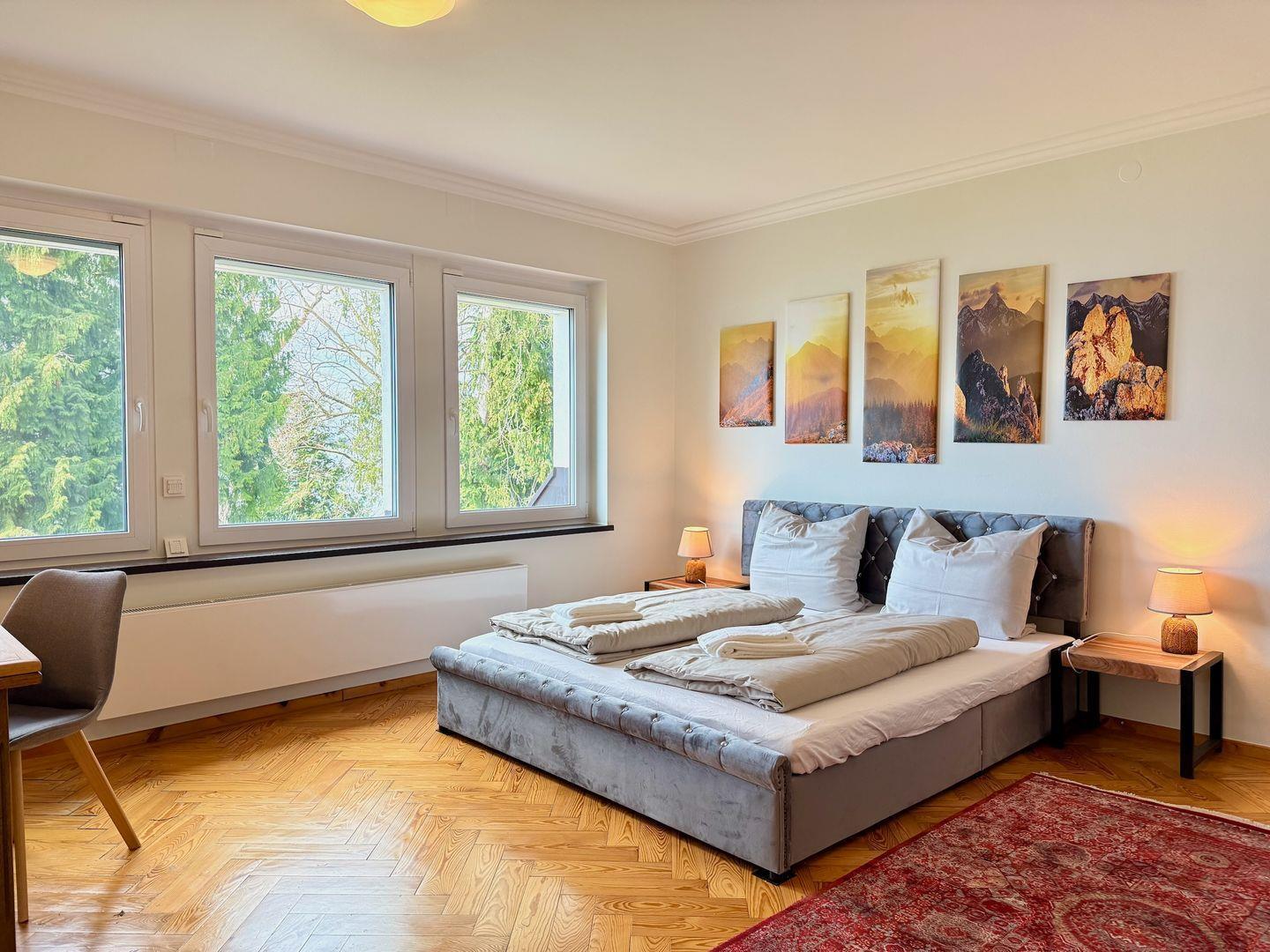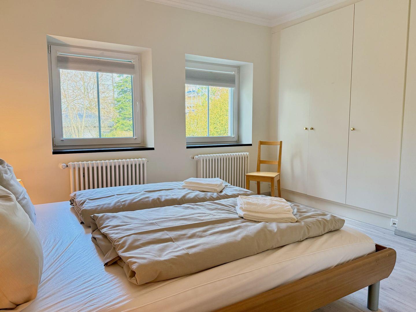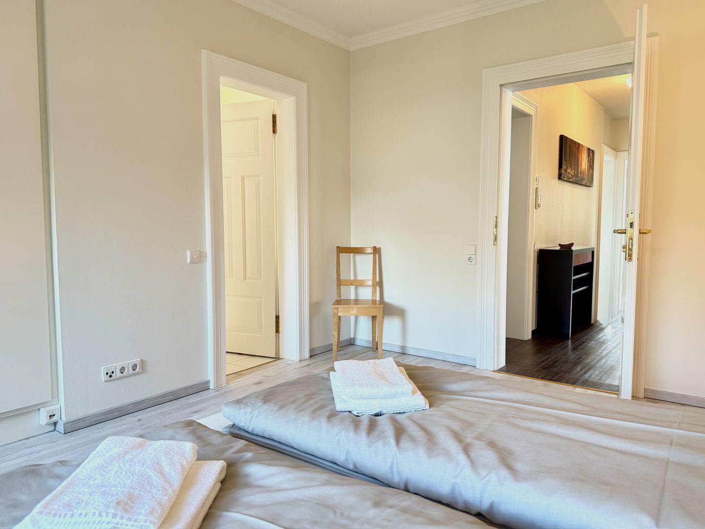 Zwei der drei Schlafzimmer sind mit einem Doppelbett ausgestattet, das dritte Schlafzimmer mit einem großzügigen Einzelbett mit 140 cm Breite und verfügen über jeweils ein eigenes, direkt angeschlossenes Bad mit WC und Badewanne. Das Bad des Elternschlafzimmers ist zusätzlich mit einem Bidet ausgestattet. Die Unterkunft bietet ideale Voraussetzungen zur Umsetzung der modernen Work-Life-Balance und verfügt über sehr gutes Internet für Ihr Homeoffice im Urlaubsdomizil mit Schreibtisch im Hauptschlafzimmer. Für längere Aufenthalte stehen eine Waschmaschine und ein Trockner zur gemeinsamen Nutzung mit anderen Ferienwohnungen zur Verfügung.