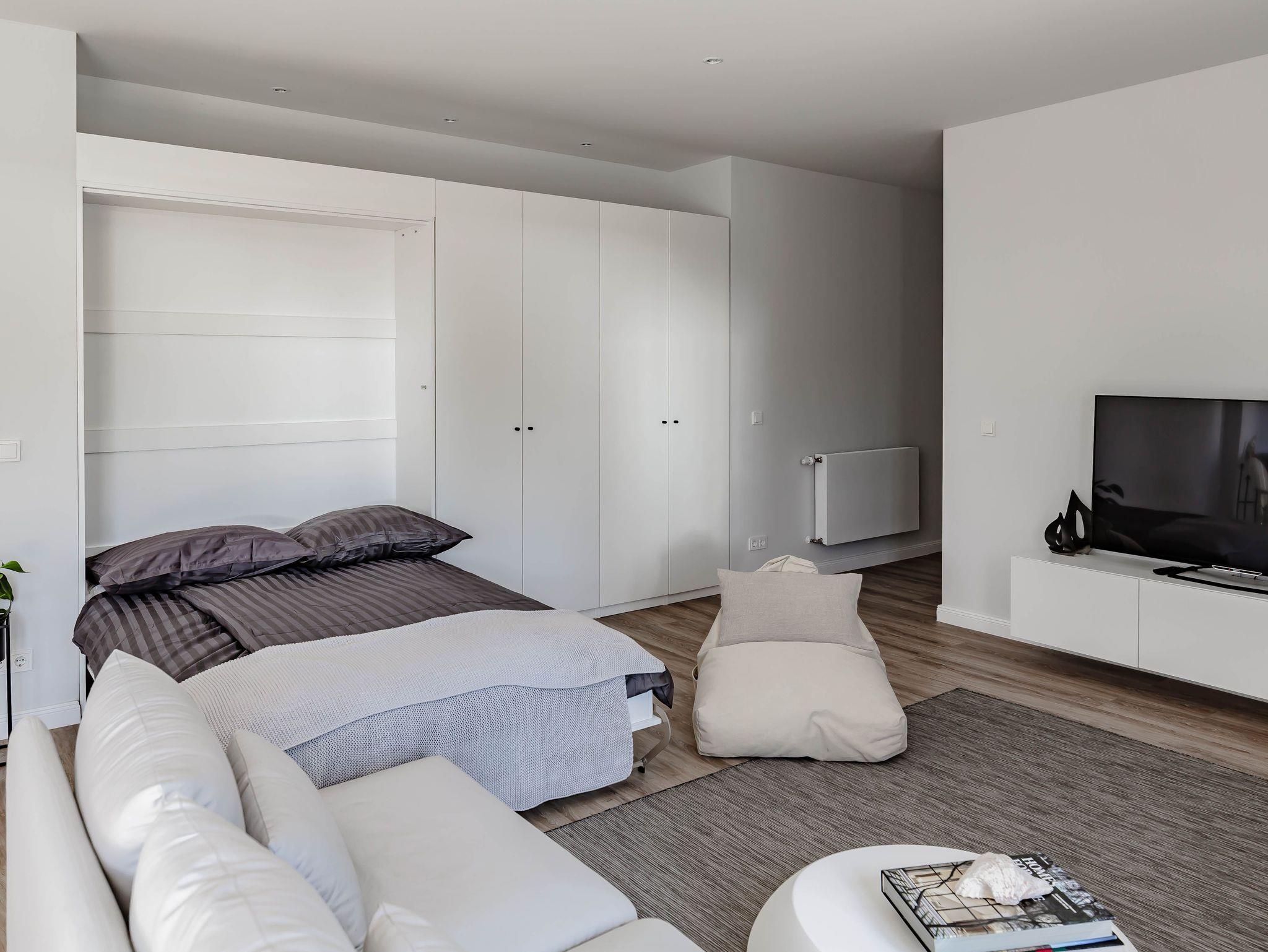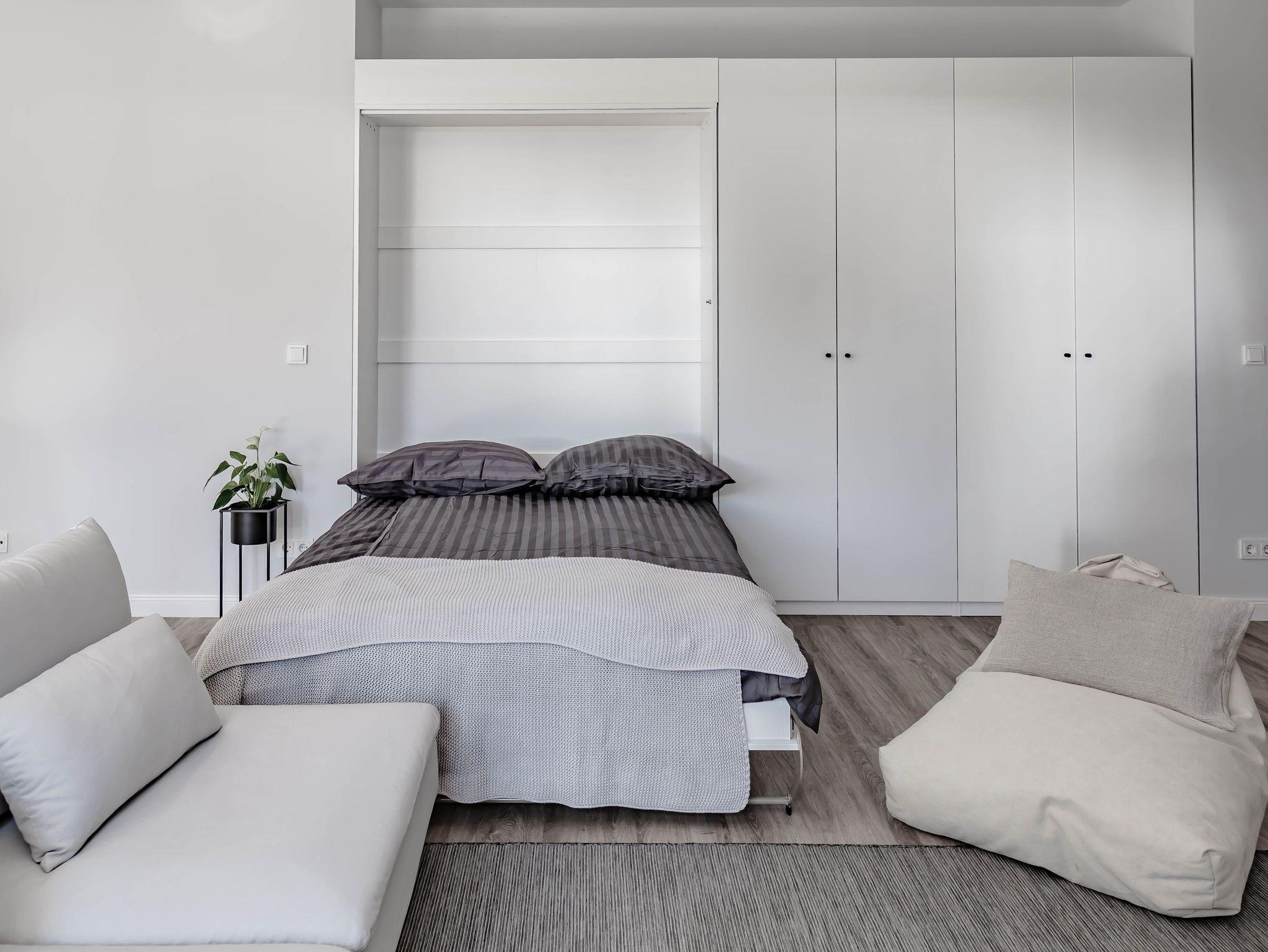 besticht durch sehr viel Liebe zum Detail: großzügiges Studio/Loft mit hohen Decken und einem sensationellen Lichteinfall durch die großen bodentiefen Fenstern. Mit zwei gemütliche Doppelbetten (Alkoven-Doppelbett, ausklappbares Doppelbett im Schrank) und der offenen Küche ist die Raumaufteilung modern und zeitgemäß und bietet mit dem großzügigen Wohn-Essbereich Platz für 4 Personen.