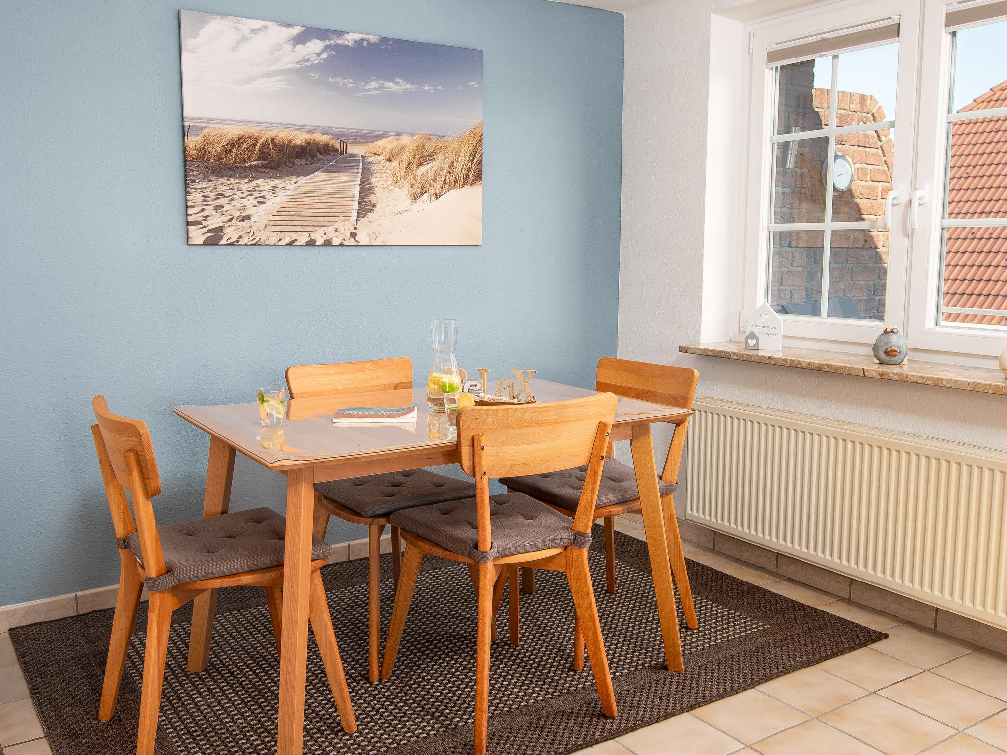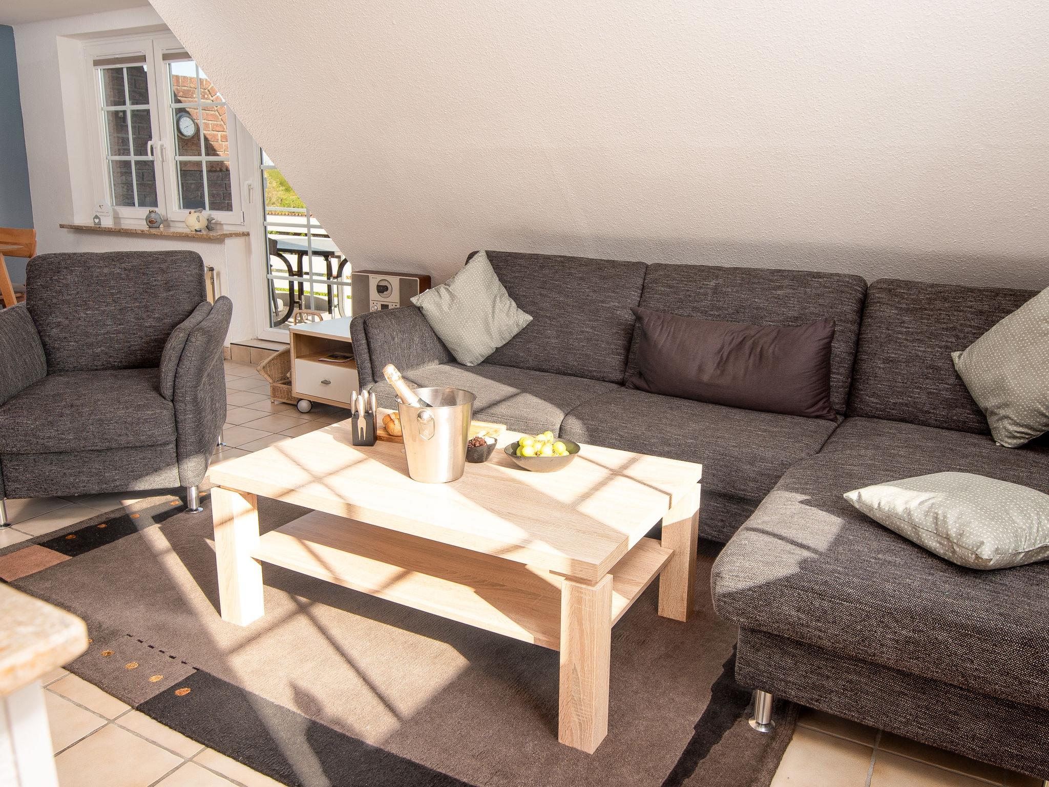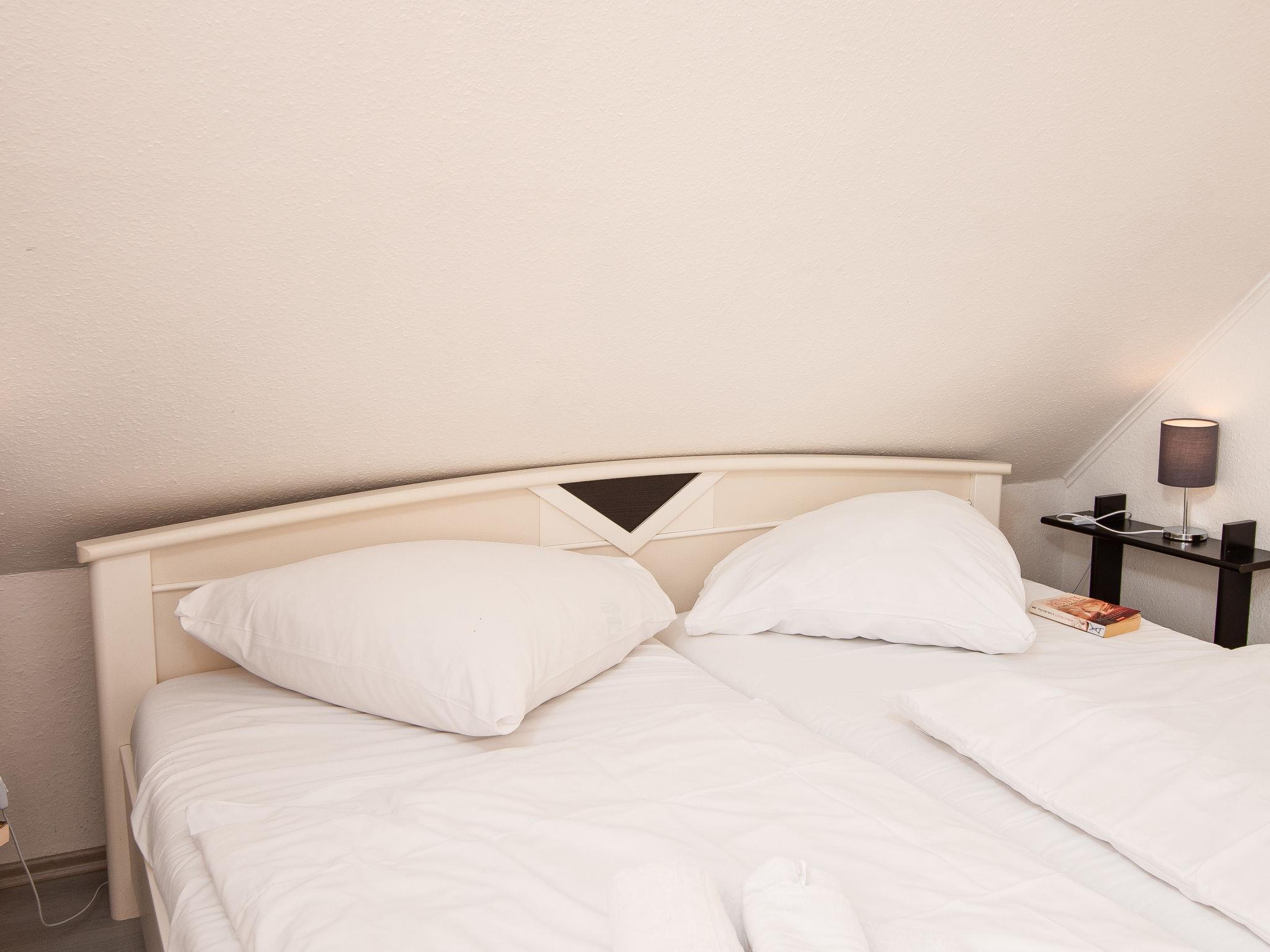 3-room apartment 65 m2, on the upper floor. Bright, partly with sloping ceilings, cosy furnishings: living/dining room 28 m2 with cable TV (flat screen), hi-fi system. Exit to the balcony. 1 room 9 m2 with 1 double bed (2 x 100 cm, length 200 cm). 1 room 8 m2 with 2 beds (90 cm, length 200 cm). Small kitchenette (4 hot plates, oven, dishwasher, toaster, kettle, microwave, electric coffee machine). Shower/WC. Balcony. Balcony furniture. Facilities: iron, children's high chair (extra). Internet (WiFi, free). Please note: non-smokers only. Smoke alarm. DE40827