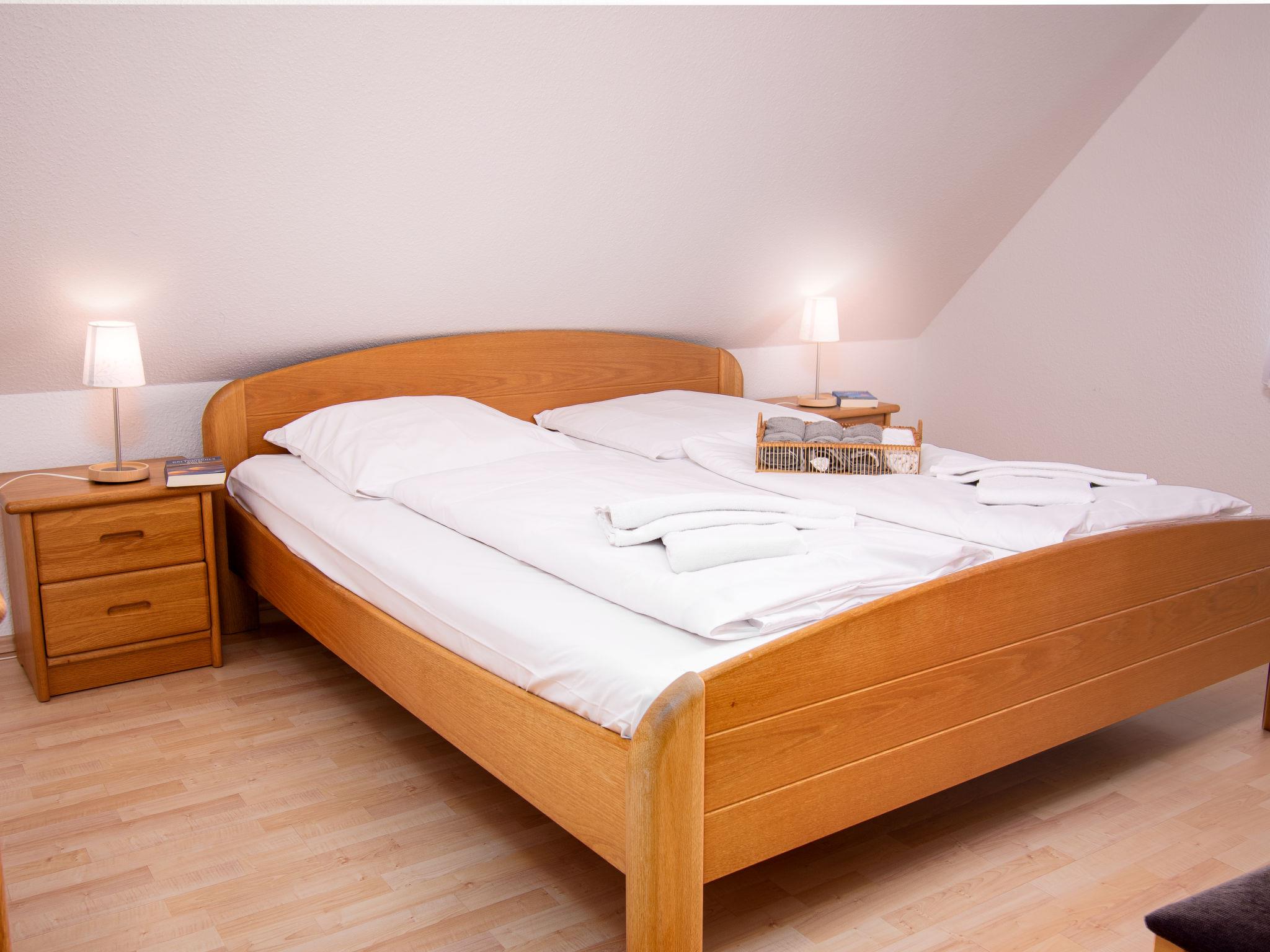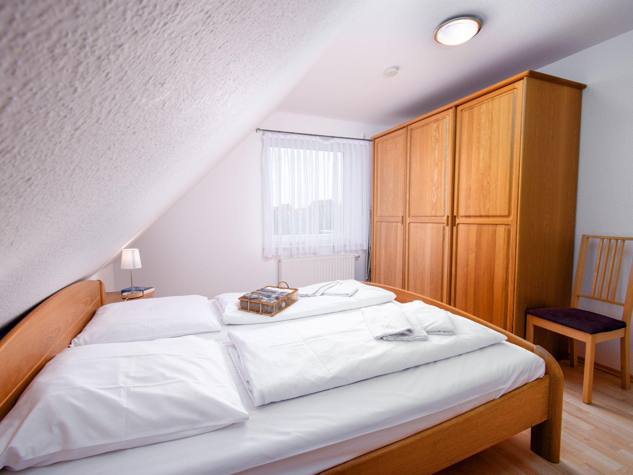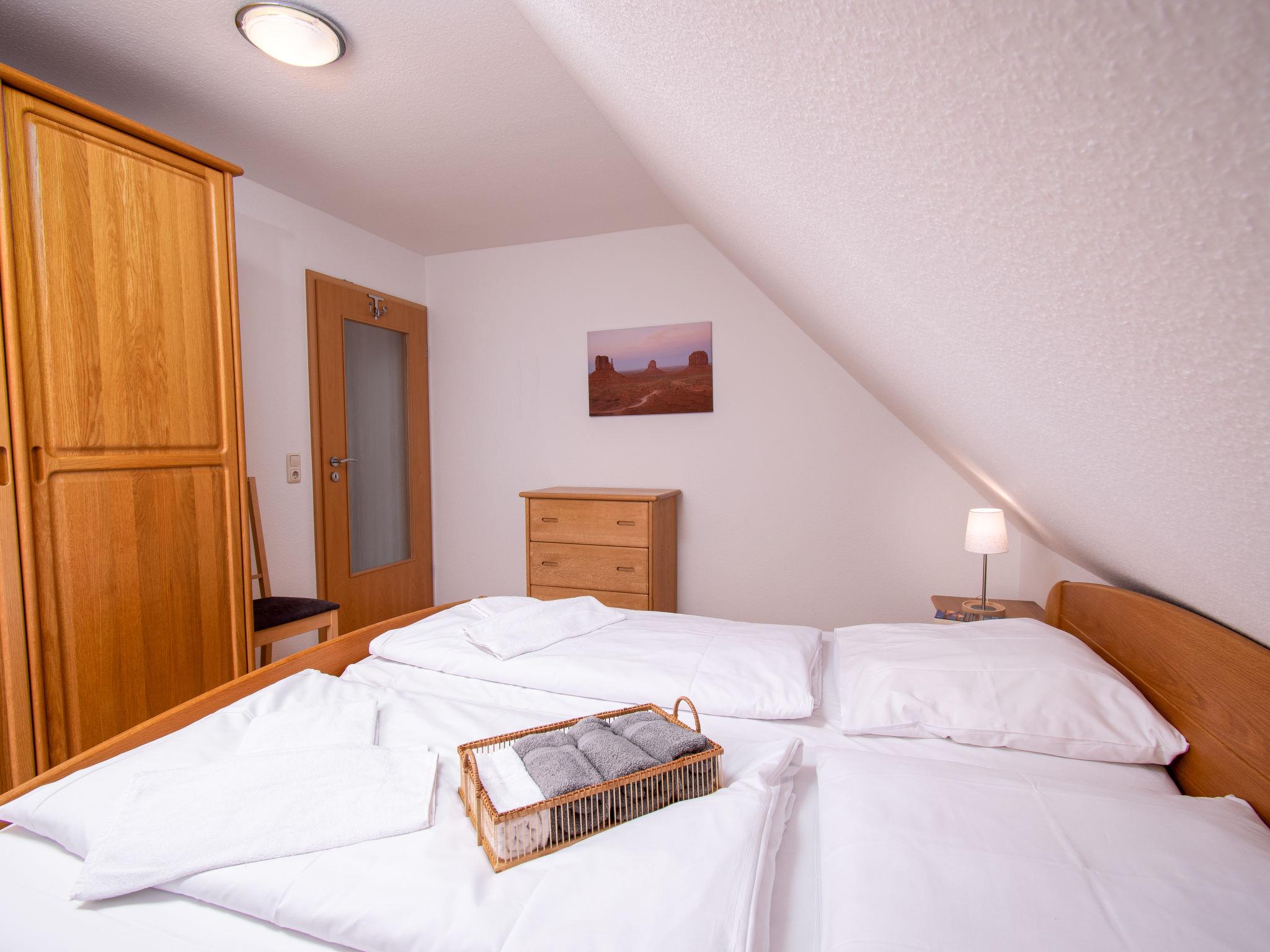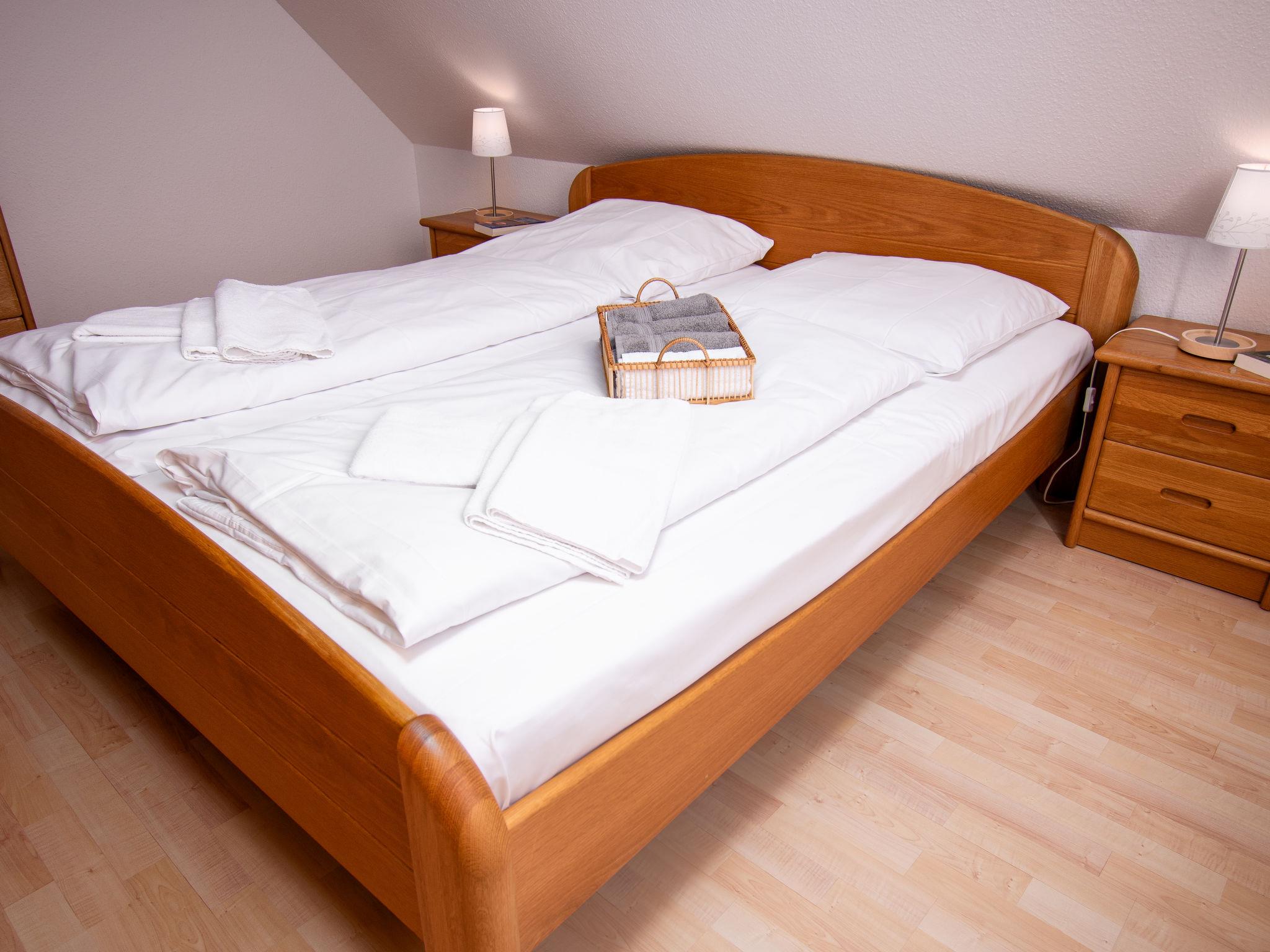 4-room apartment 78 m2 on 2 levels, on the upper floor. Beautiful and cosy furnishings: living/dining room with satellite TV (flat screen), radio, CD-player, DVD and electric shutters. Exit to the balcony. 1 room with 1 double bed (2 x 90 cm, length 200 cm). 1 room with 2 beds (90 cm, length 200 cm). Kitchenette (oven, dishwasher, 4 ceramic glass hob hotplates, toaster, kettle, electric coffee machine). Shower/WC. Top floor: 1 room with sloping ceilings with 2 beds (90 cm, length 200 cm). Sep. WC. Balcony furniture. Facilities: washing machine, children's high chair (extra). Internet (WiFi, free). Please note: non-smokers only. Smoke alarm.