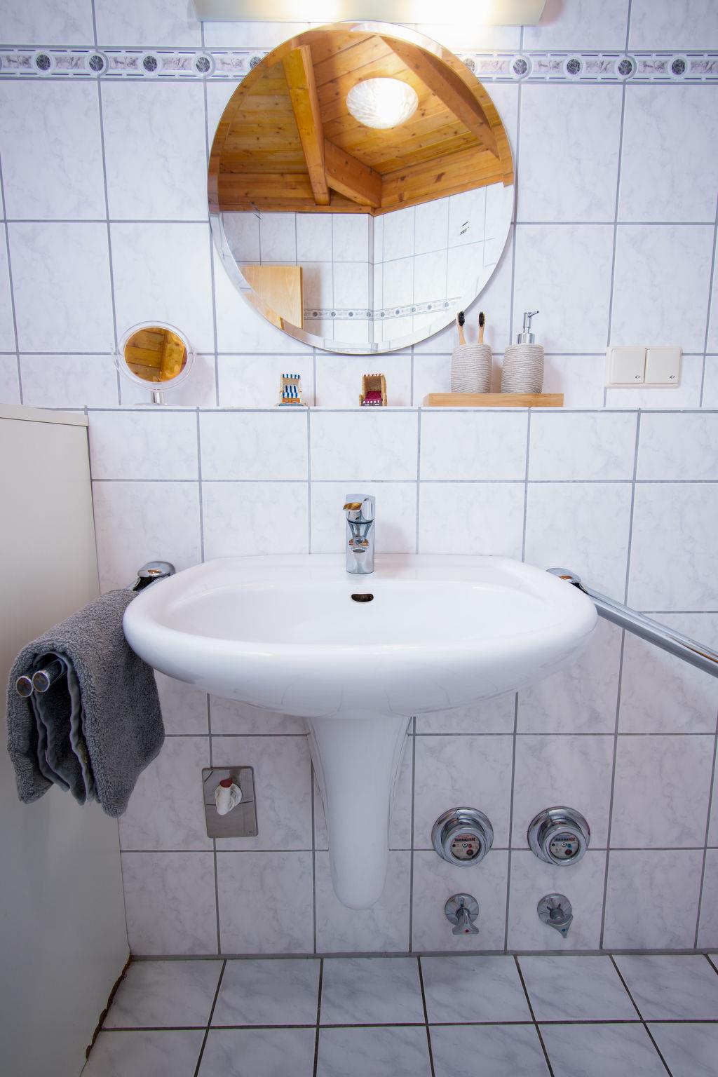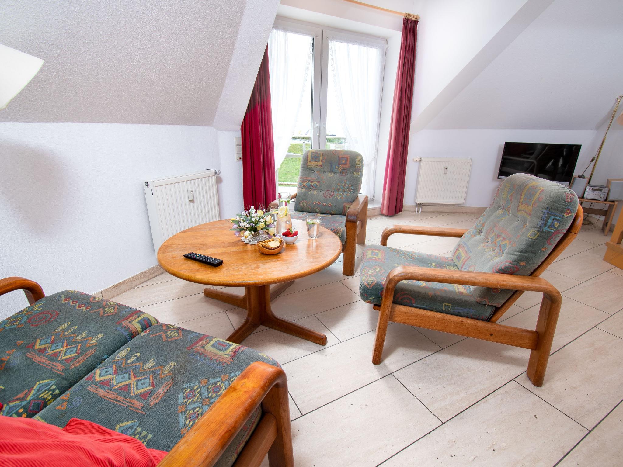"Meerblick", 2-room apartment 60 m2 on 3rd floor. Cosy furnishings: living room 17 m2 with satellite TV (flat screen). 1 room 11 m2 with 2 fold-away beds (80 cm, length 190 cm). Kitchen 6 m2 (4 ceramic glass hob hotplates, toaster, kettle, microwave, electric coffee machine) with dining table. Shower/WC. Small balcony 4 m2. Balcony furniture. Beautiful view of the sea. Facilities: children's high chair (extra). Please note: non-smokers only. Smoke alarm, no lift.