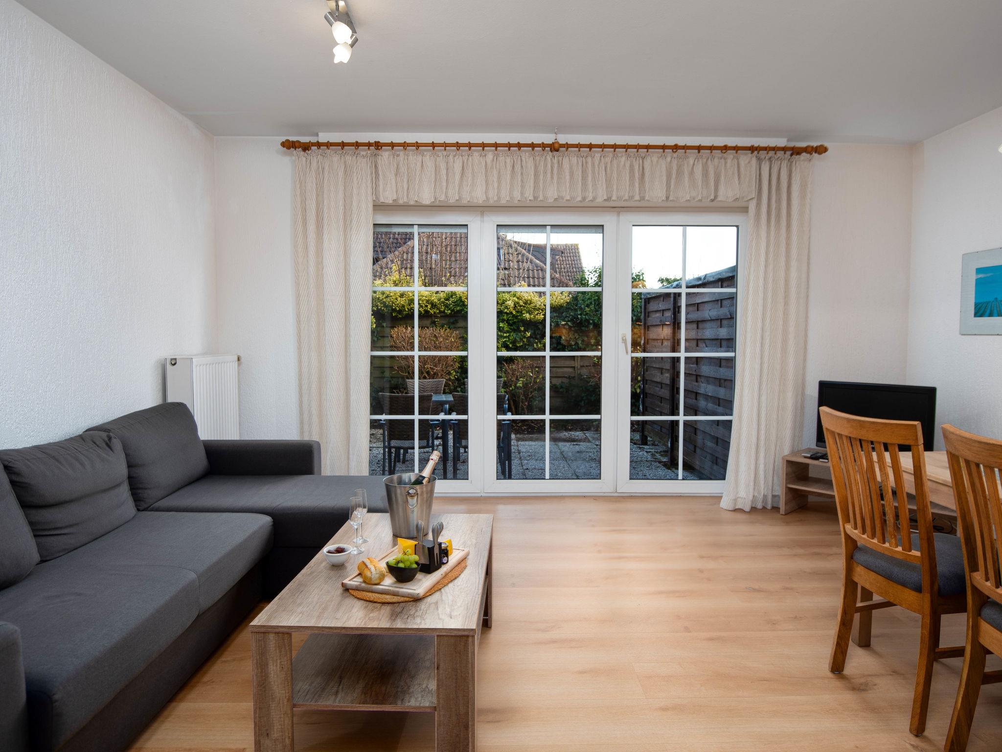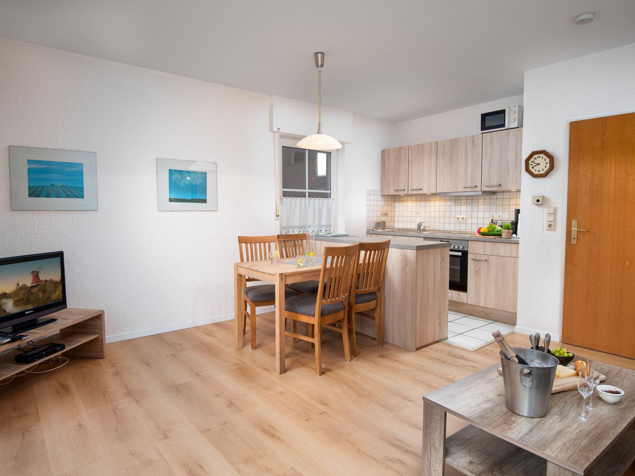 "Seehund", 2-room apartment 65 m2, on the ground floor. Bright, simple furnishings: living/dining room 21 m2 with 1 double sofabed (1 x 140 cm, length 200 cm), satellite TV. Exit to the terrace. 1 double bedroom 10 m2 with 1 double bed (2 x 80 cm, length 190 cm). Kitchenette (4 hot plates, oven, dishwasher, toaster, kettle, microwave, electric coffee machine) with dining table. Shower/WC. Terrace furniture. Facilities: children's high chair (extra). Please note: non-smokers only. Maximum 1 pet/ dog allowed. Smoke alarm.