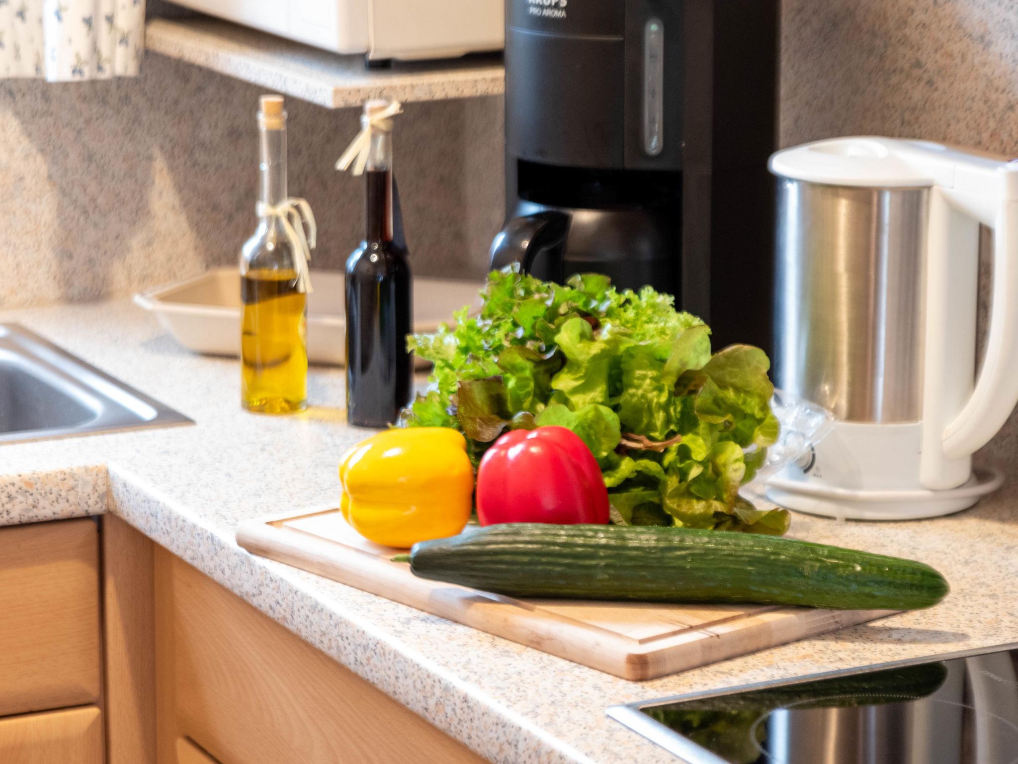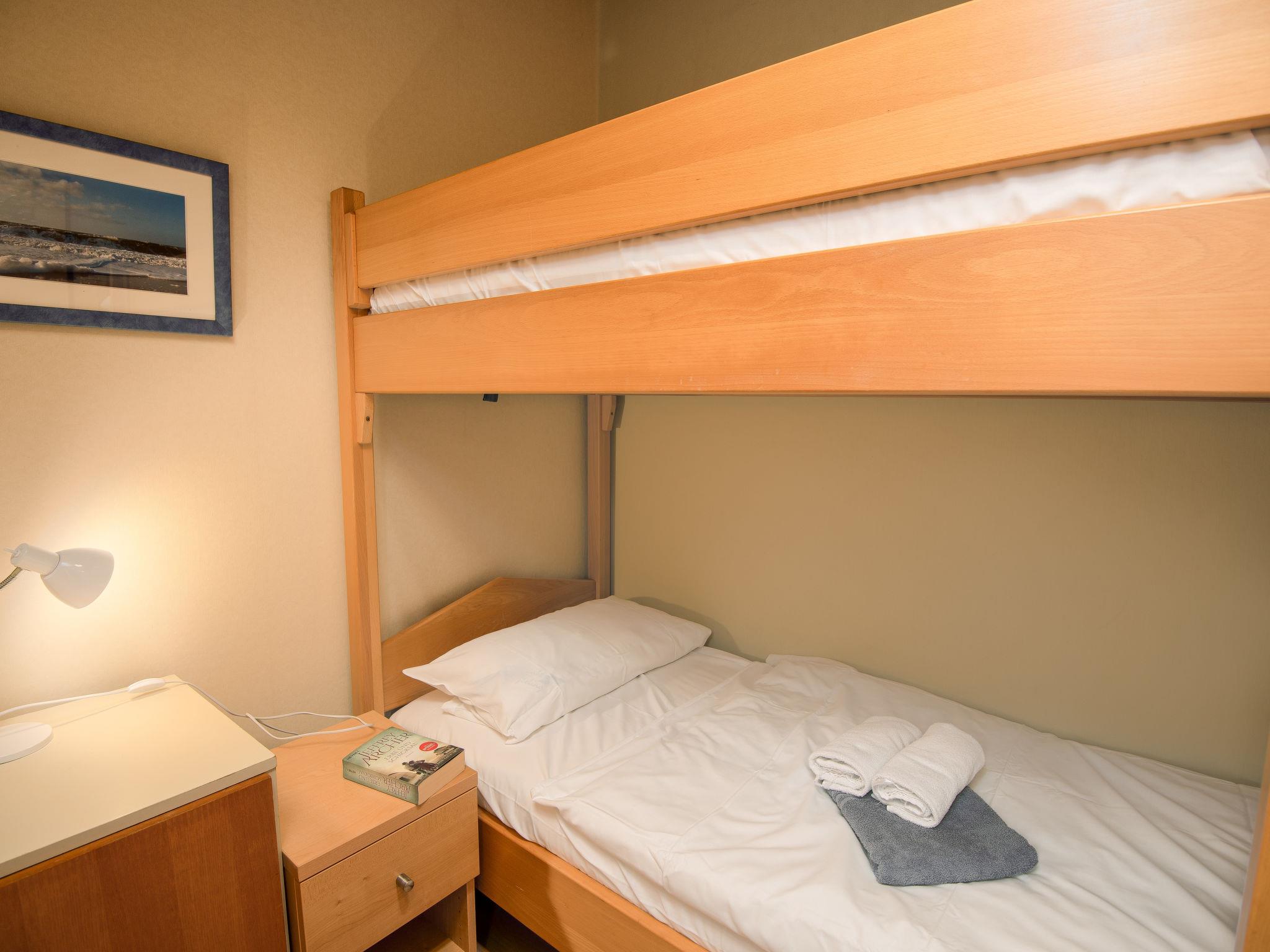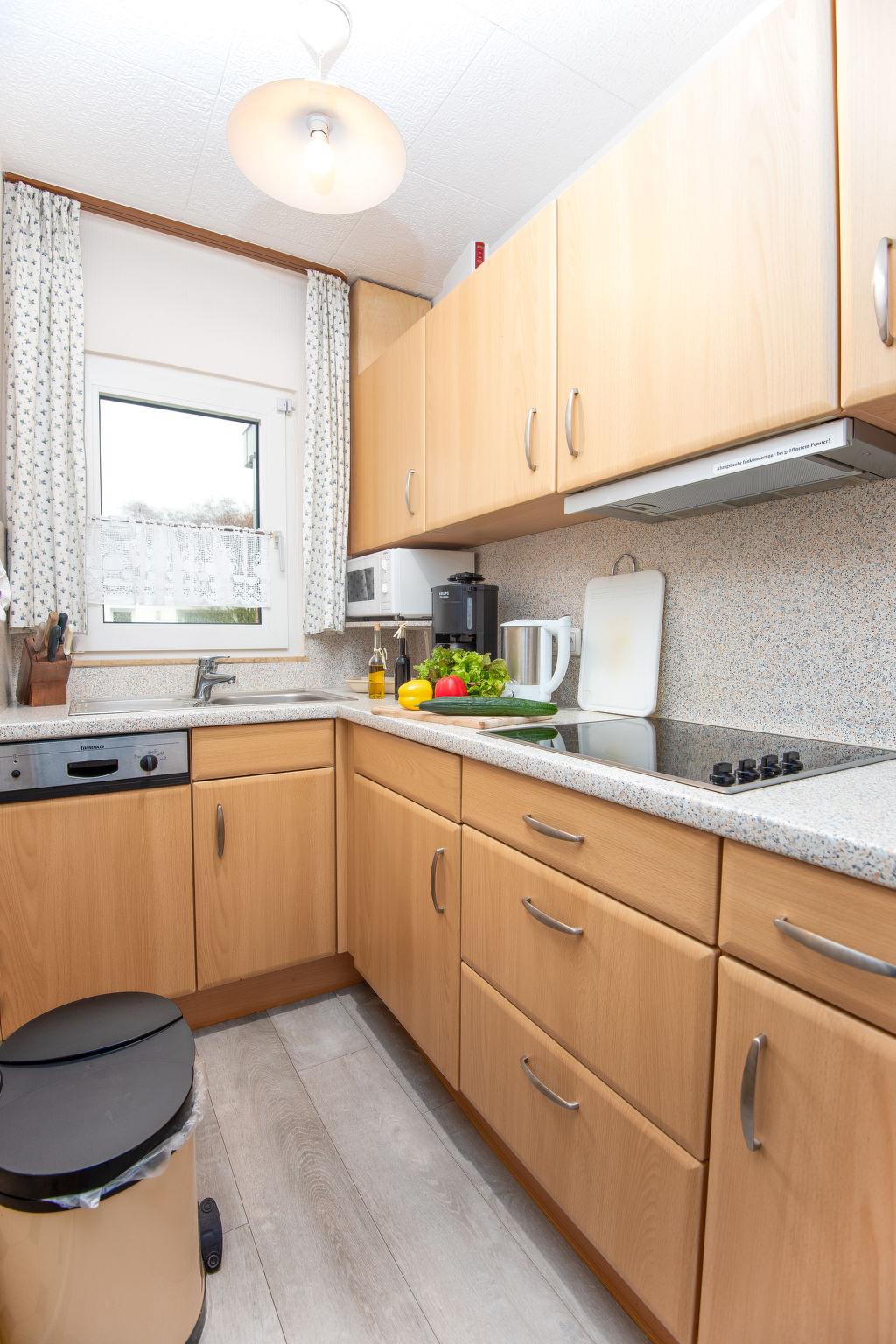 "Wind", 3-room terraced house 48 m2, on the ground floor. Spacious, cosy furnishings: living/dining room 19 m2 with satellite TV (flat screen), hi-fi system. 1 room 9 m2 with 1 double bed (2 x 80 cm, length 200 cm). 1 room 4 m2 with 1 x 2 bunk beds (80 cm, length 200 cm). Kitchen (dishwasher, 4 ceramic glass hob hotplates, toaster, kettle, microwave, electric coffee machine). Shower/WC. Terrace 20 m2. Terrace furniture. Facilities: children's high chair (extra). Internet (WiFi, free). Please note: non-smoking house. Smoke alarm.