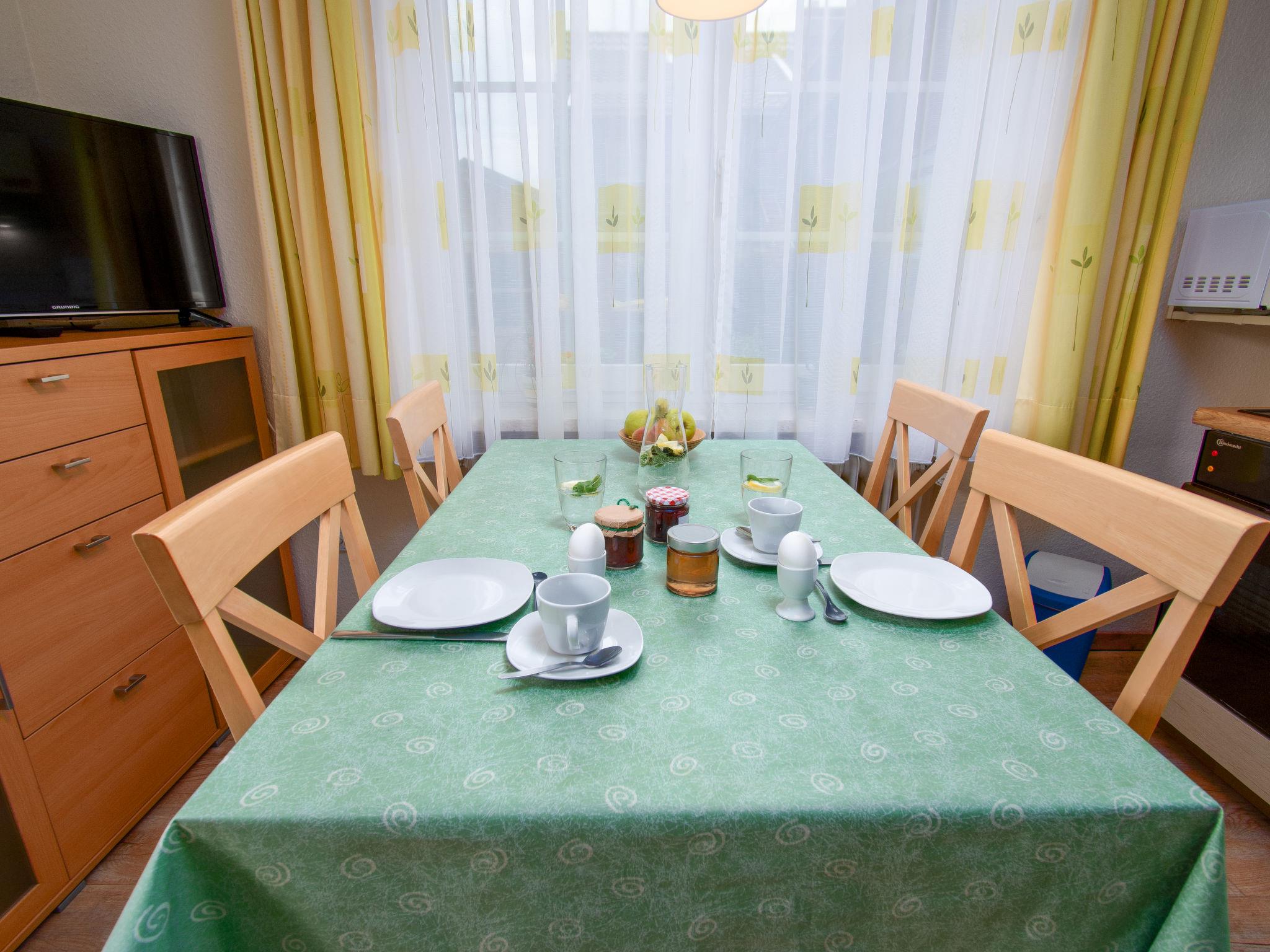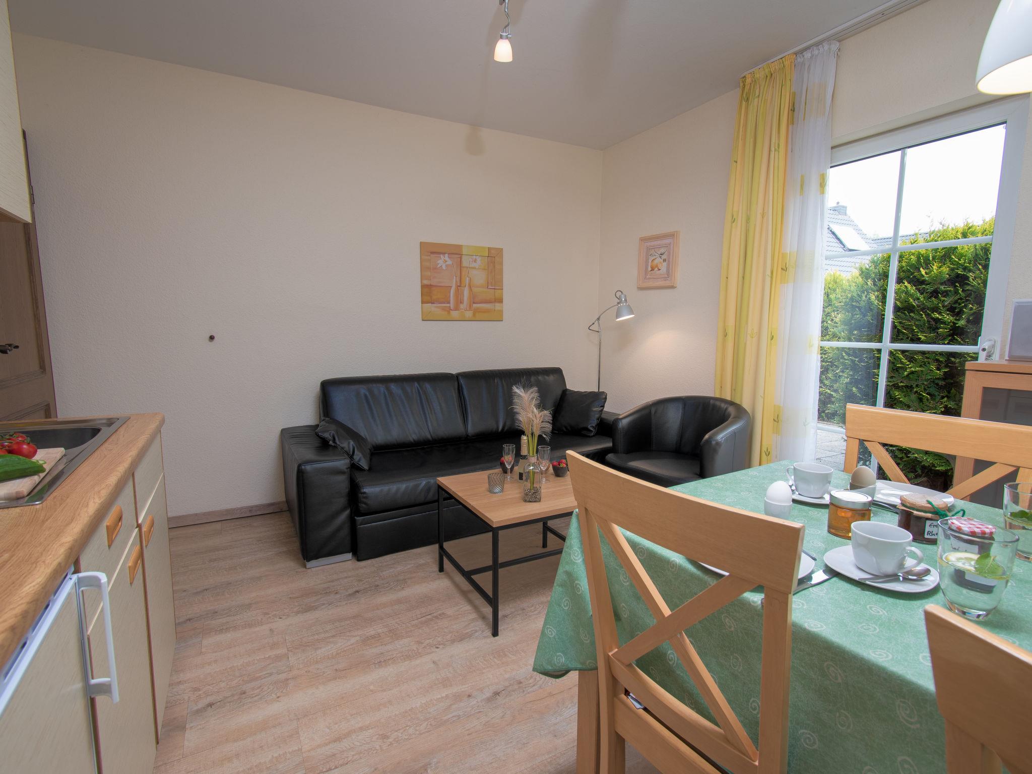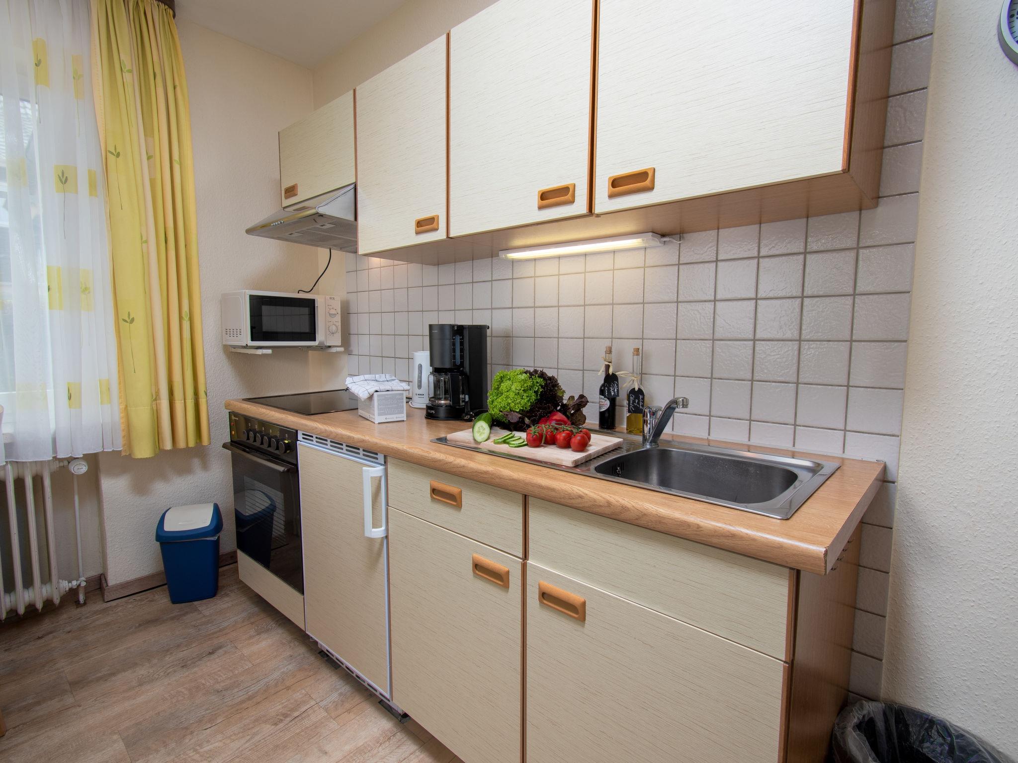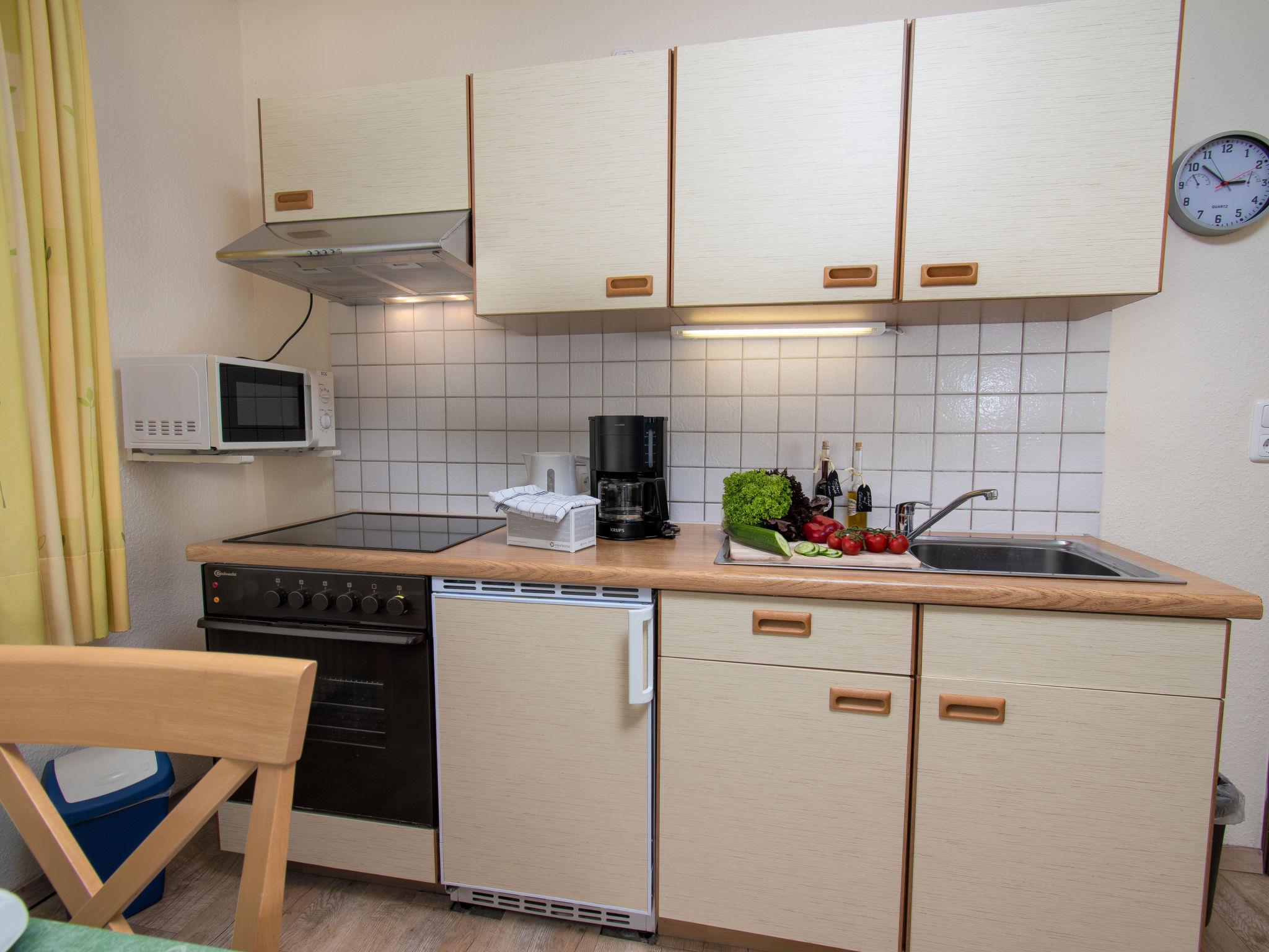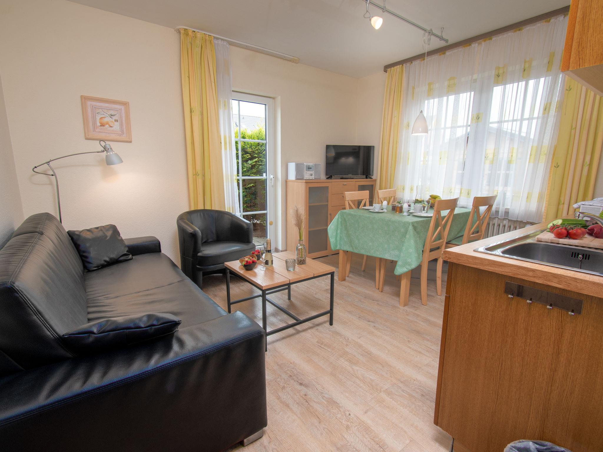 "Strandkorb", 2-room apartment 43 m2, on the ground floor. Beautiful and tasteful furnishings: living/dining room 13 m2 with 1 double sofabed (160 cm, length 200 cm), cable TV (flat screen), CD-player and DVD. Exit to the terrace. 1 room 13 m2 with 1 double bed (2 x 90 cm, length 200 cm). Kitchenette (oven, 4 ceramic glass hob hotplates, toaster, kettle, microwave, electric coffee machine) with dining table. Bath/shower/WC with corner bath. Terrace 10 m2. Terrace furniture. Facilities: children's high chair (extra). Internet (WiFi, free). Please note: non-smokers only. Smoke alarm.